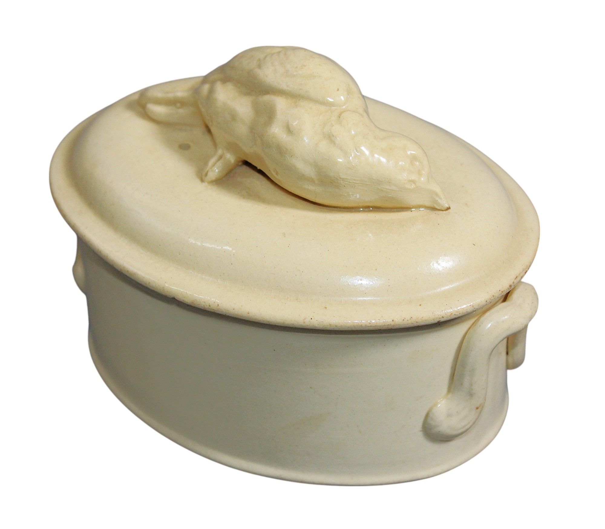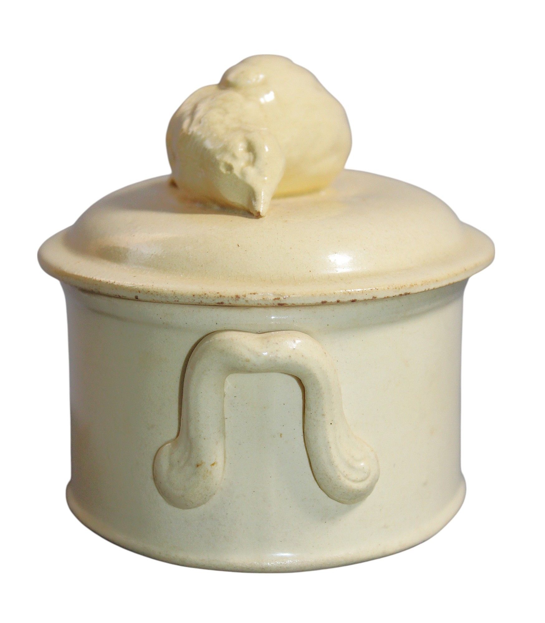SARREGUIMINES, vers 1900 - TERRINE en terre vernissée couvercle avec prise en forme d'oiseau, 9,5 x 14 x 9 cm.