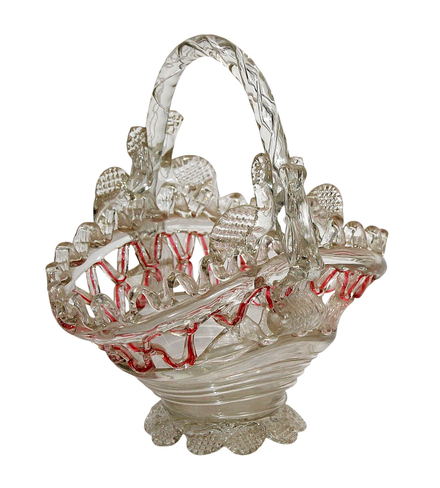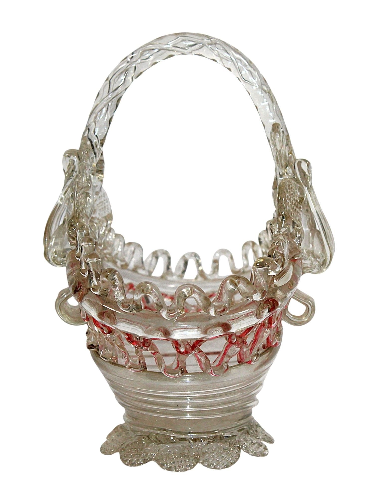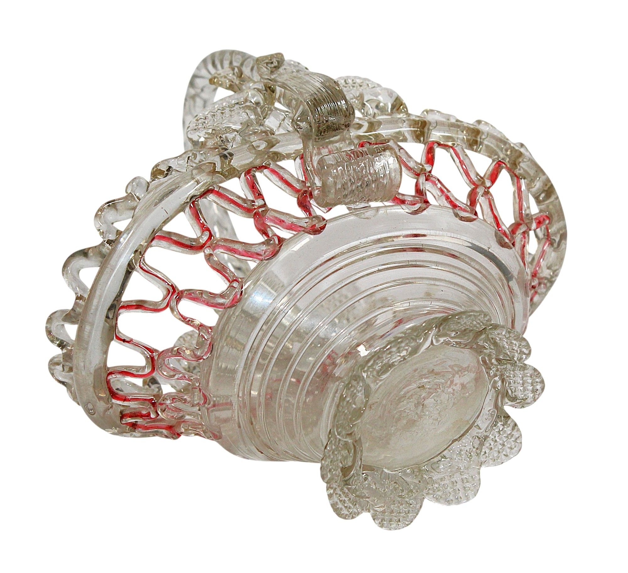 Probablement NORMANDIE, fin XVIIIème, début XIXème - PANIER en verre soufflé et travaillé à la pince, avec frise ondée ajourée et teintée rouge, 16 x 10 x 15 cm.