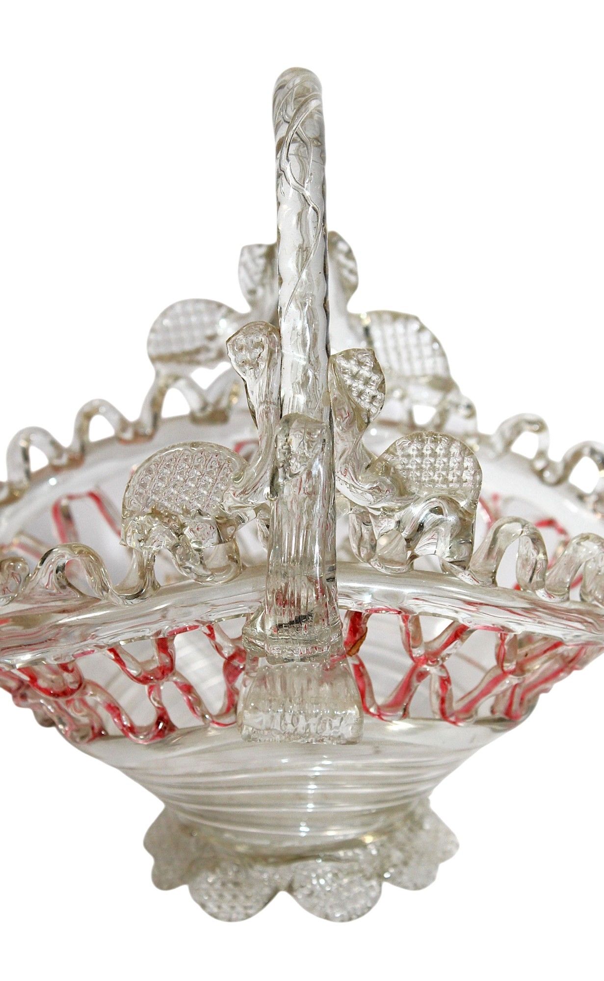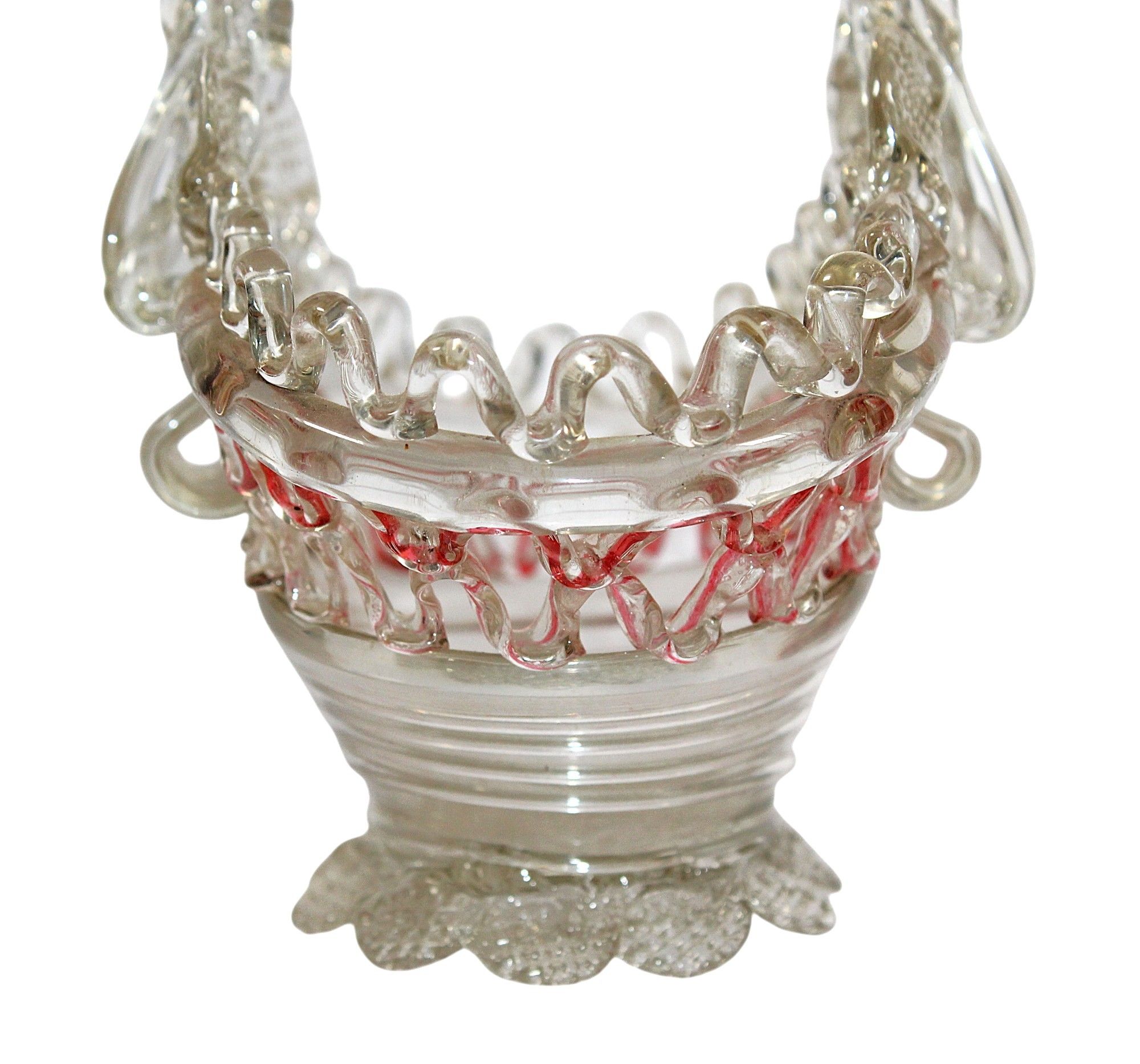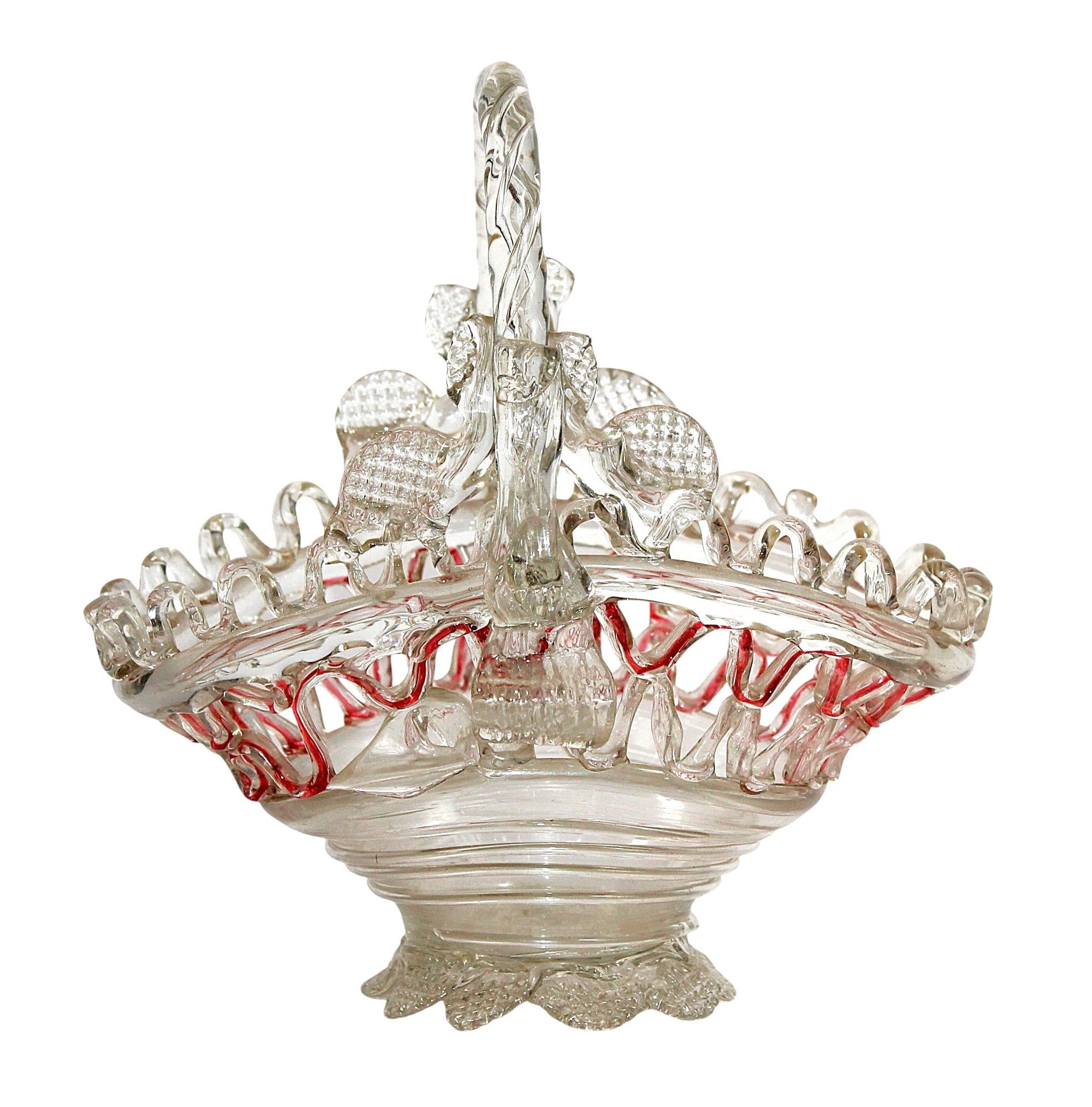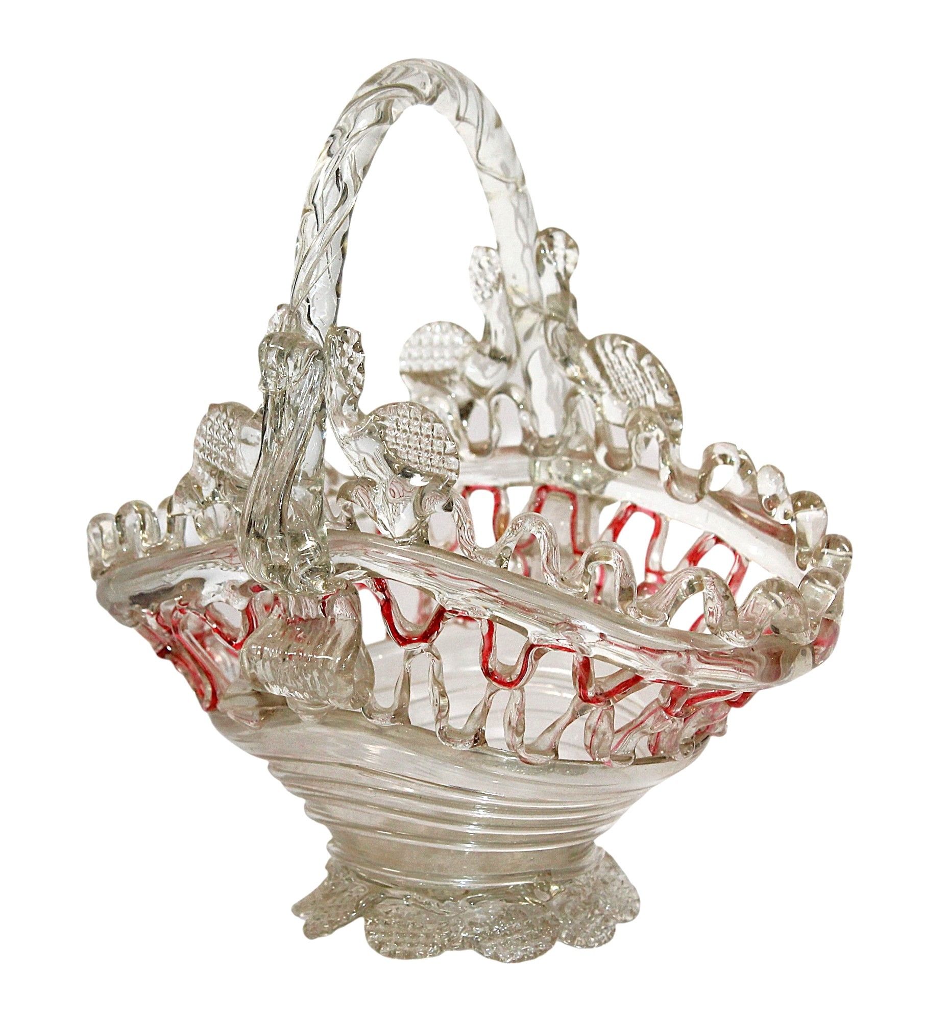Probablement NORMANDIE, fin XVIIIème, début XIXème - PANIER en verre soufflé et travaillé à la pince, avec frise ondée ajourée et teintée rouge, 16 x 10 x 15 cm.