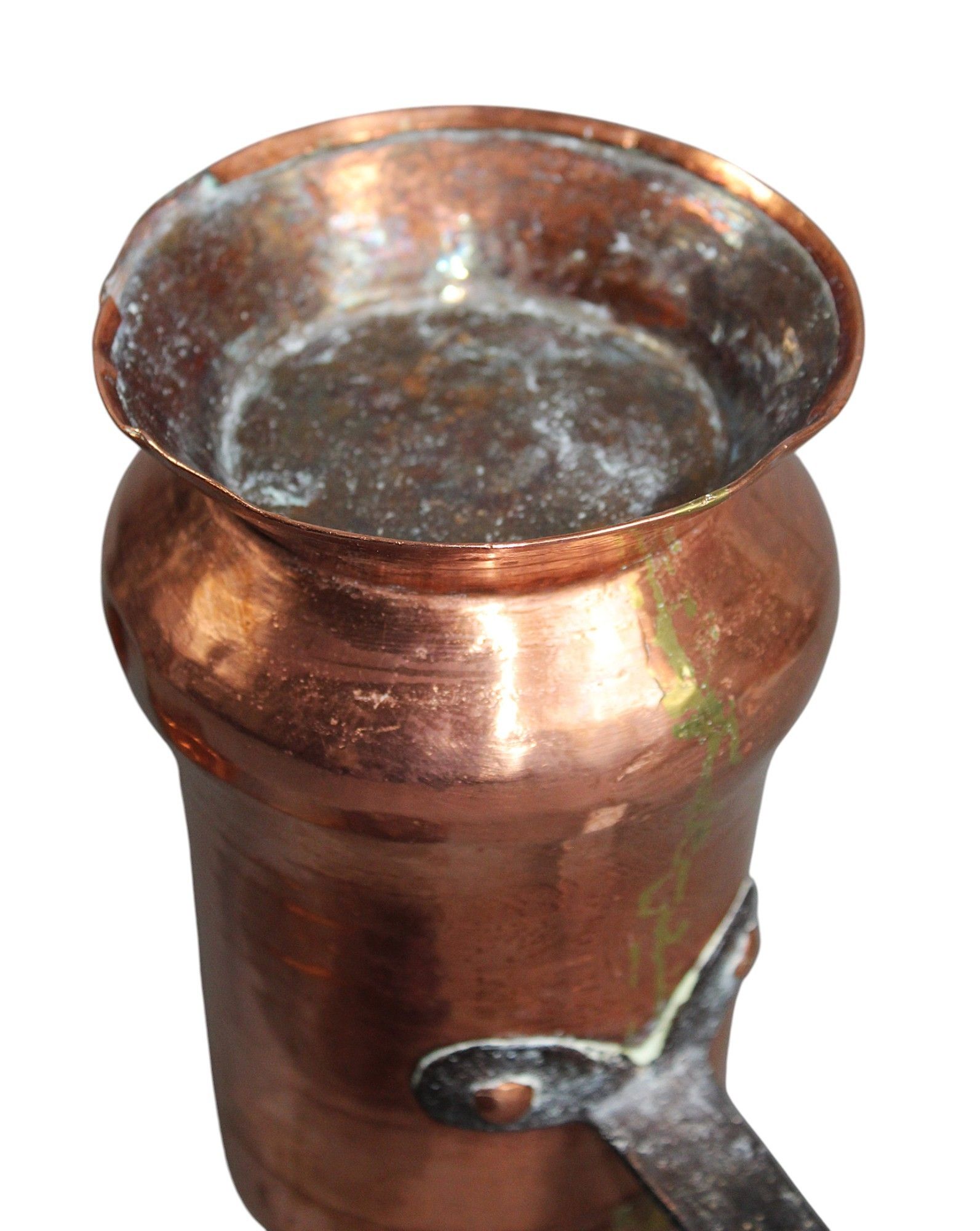 CHOCOLATIERE en cuivre sur talon, anse en fer forgé, avec mo…