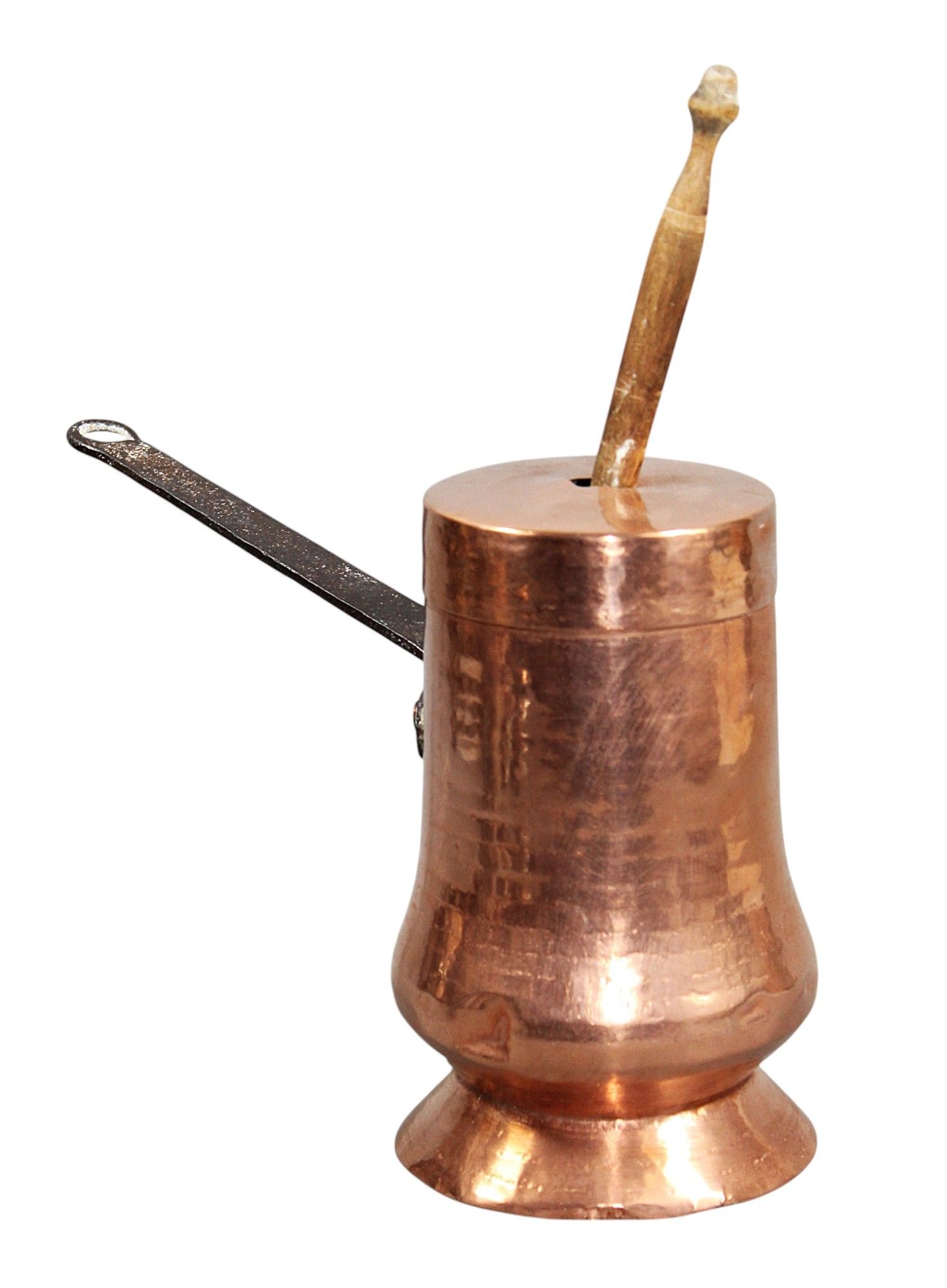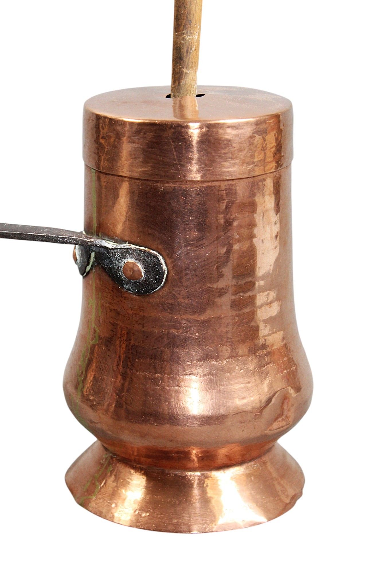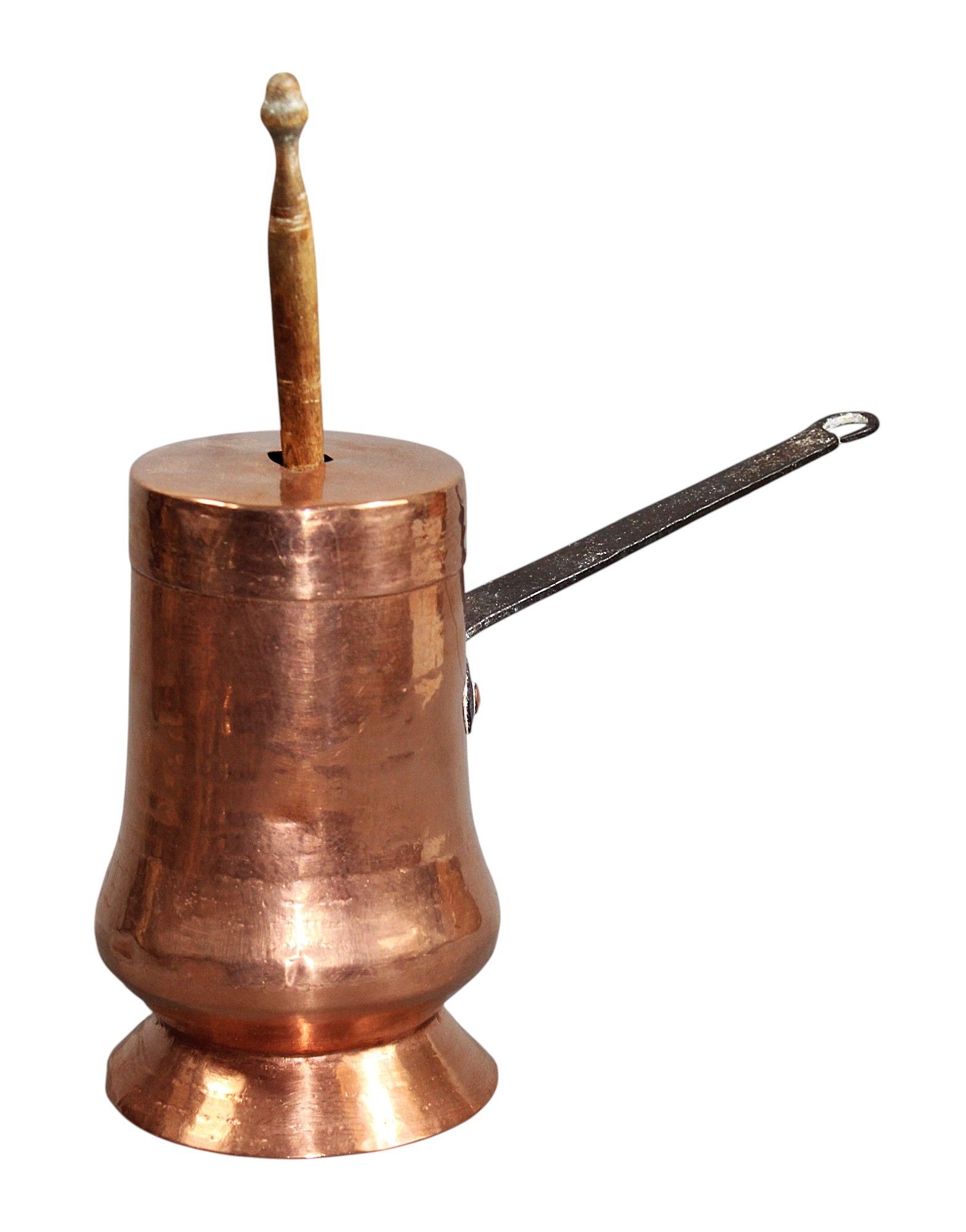 CHOCOLATIERE en cuivre sur talon, anse en fer forgé, avec moussoir en bois, XVIIIème, hauteur : 18 cm.