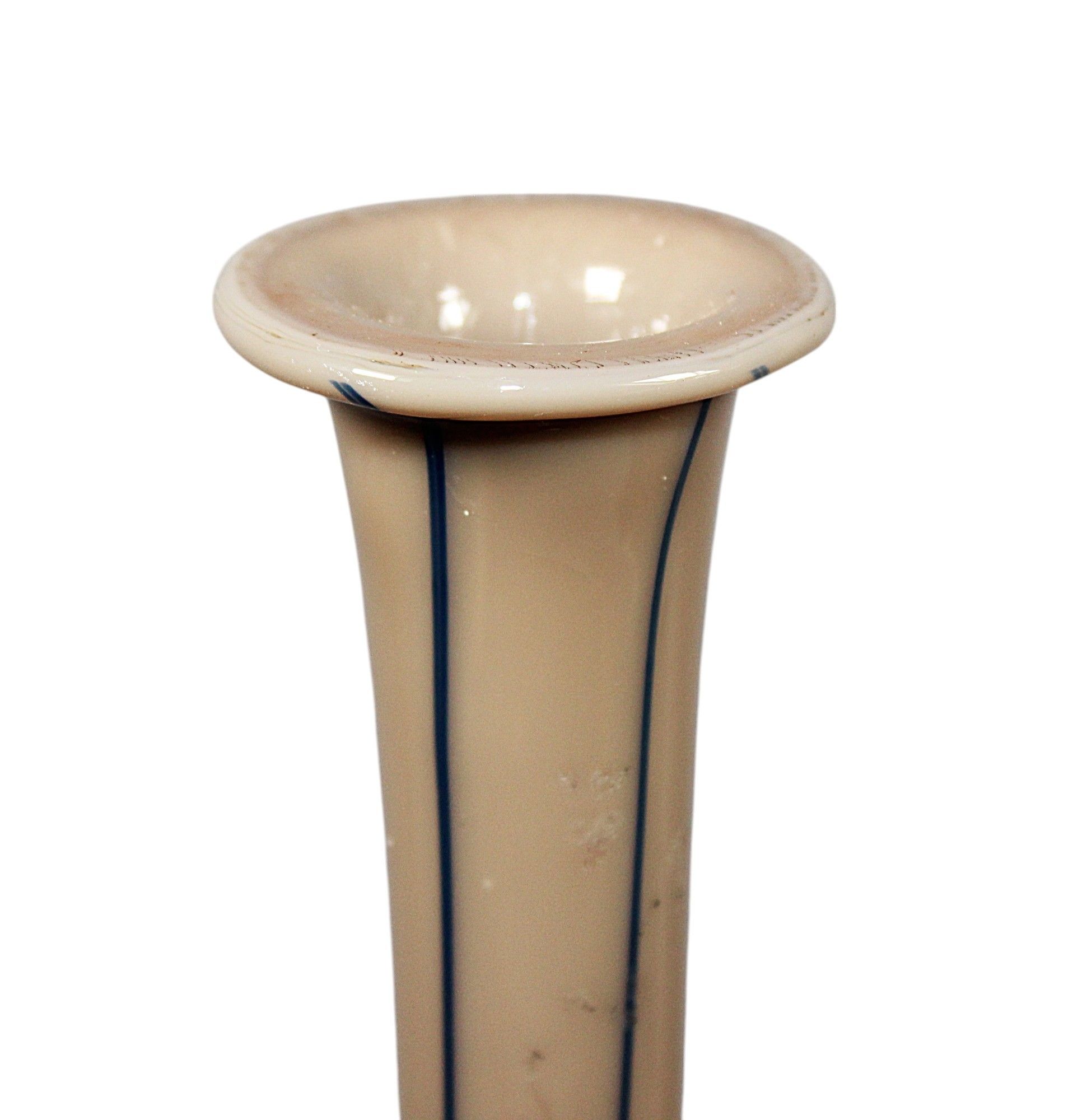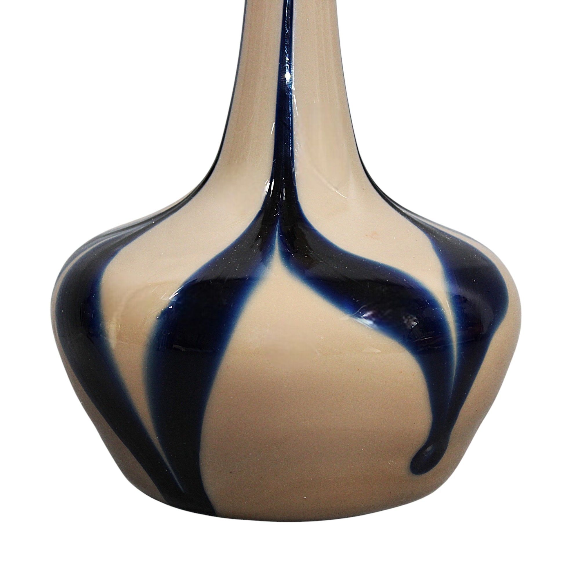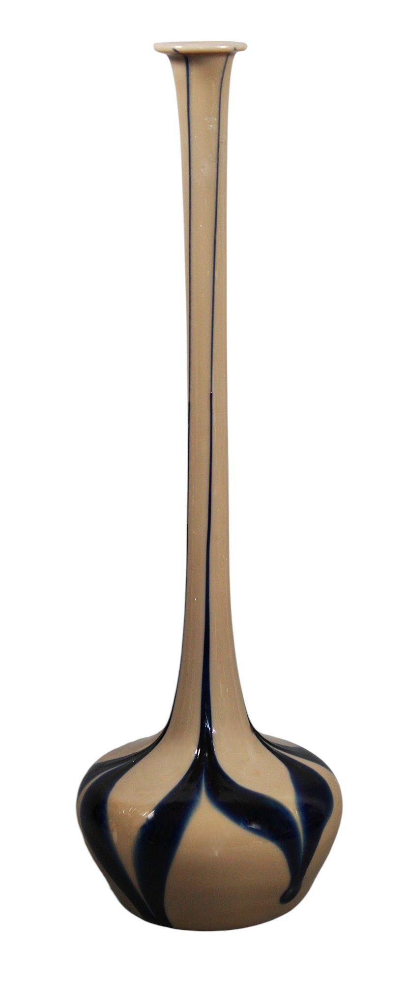VAL SAINT LAMBERT - VASE en verre soufflé bleu à fond chamois, à long col, modèle dit "oignon de Jemeppe (Jemappes)", signé sous la base, hauteur : 46 cm.