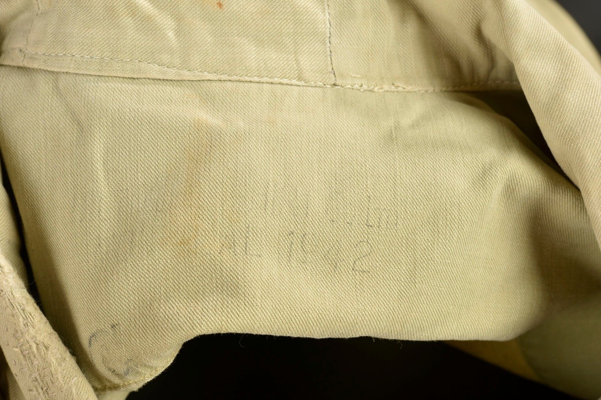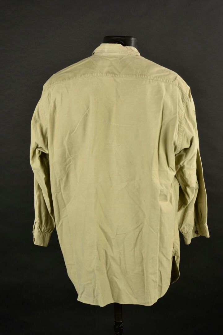 Chemise canadienne. En tissu coton kaki, tous les boutons sont présents. Marquages dans le col partiellement illisibles. Montréal 1942. Beau marquage canadien. Nombreuses marques d'usures et réparation surtout au niveau du col. Importante réparation au niveau du dos. A noter une certaine usure et patine de la pièce, ainsi que des tâches. Etat II+. 2+