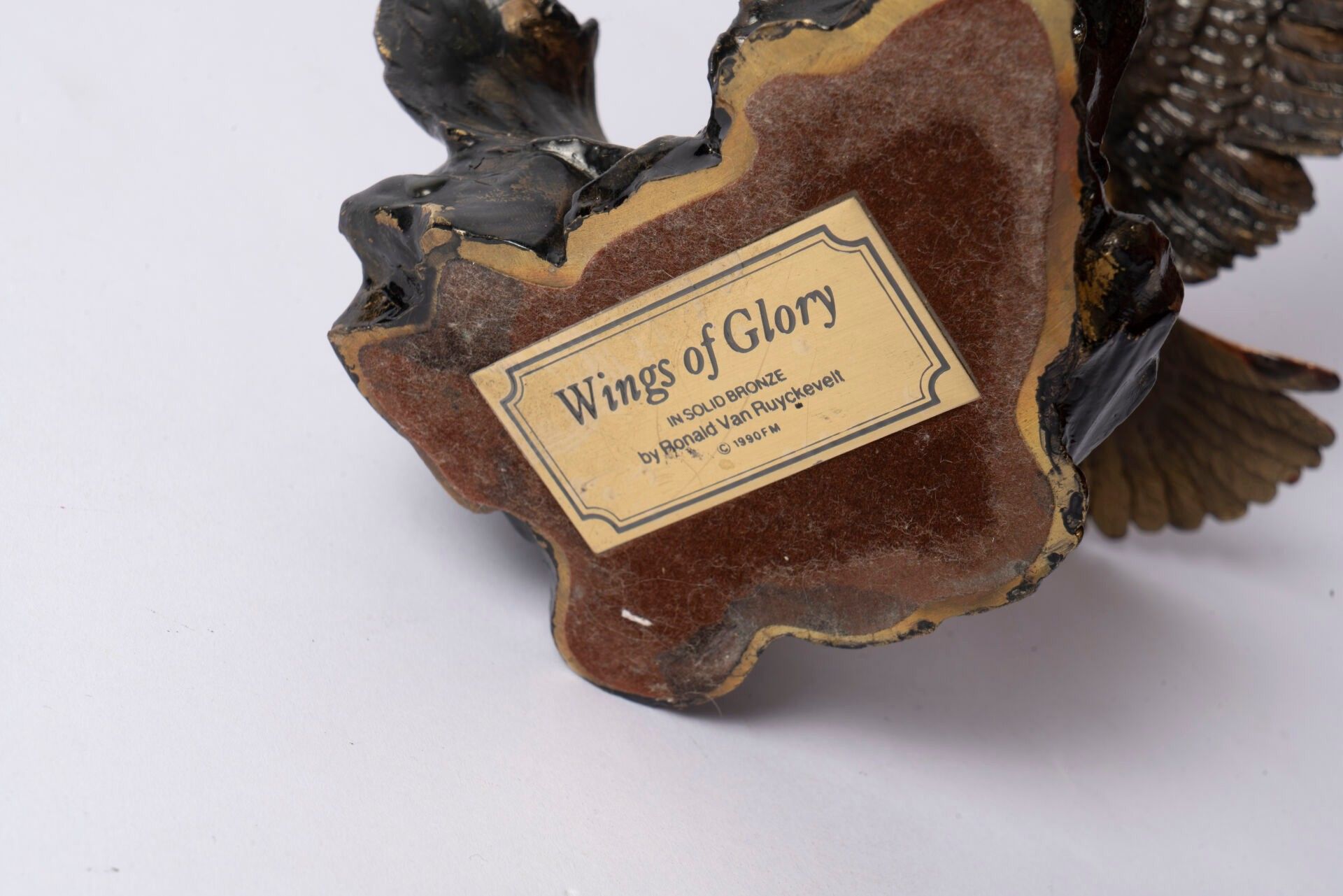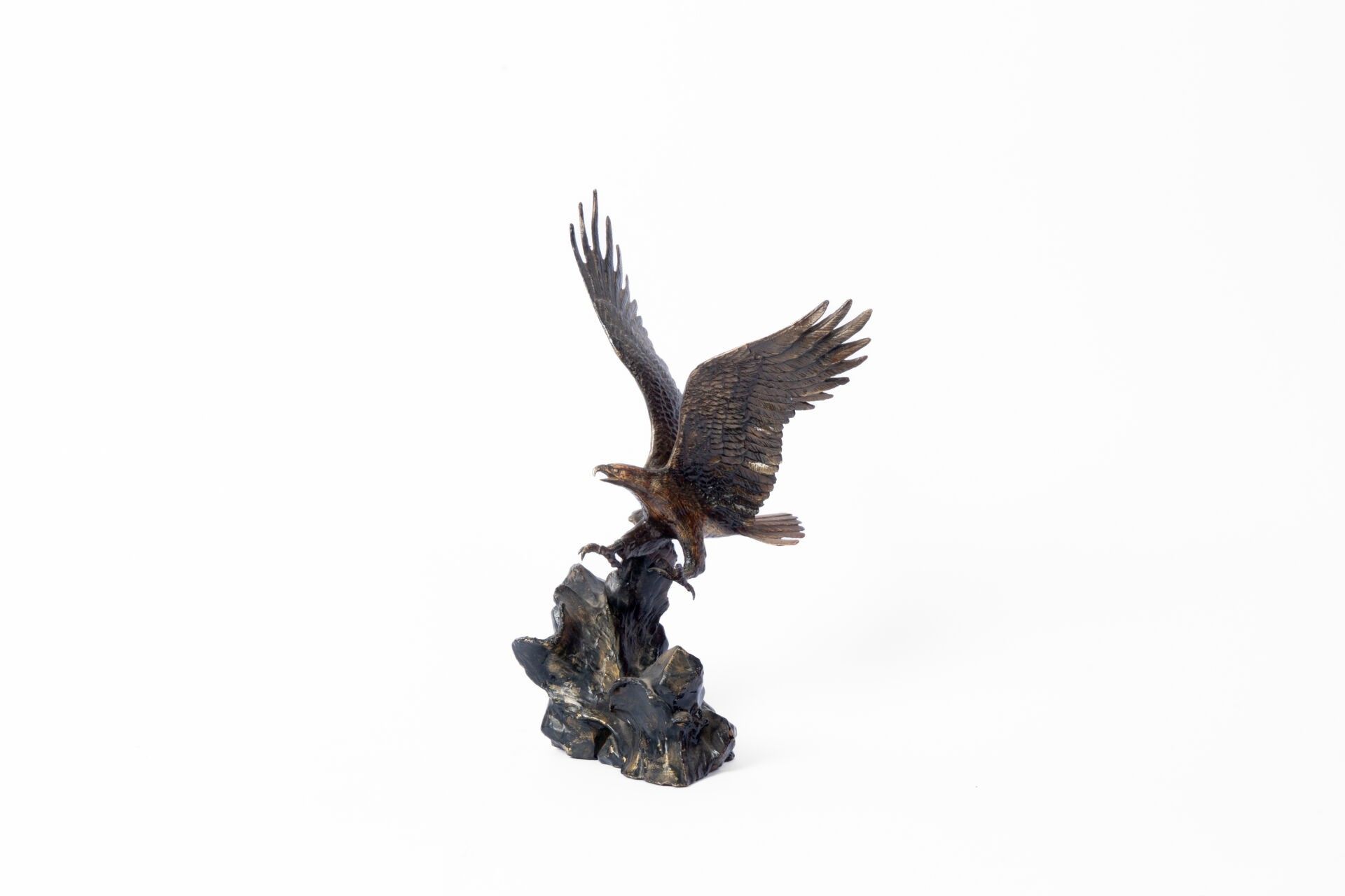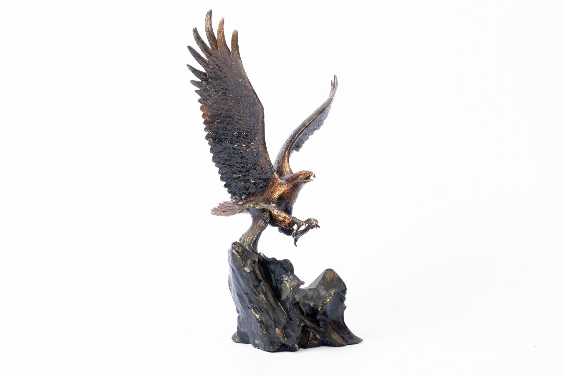 Sculpture en bronze figurant un aigle en envol sur un tertre rocheux.
