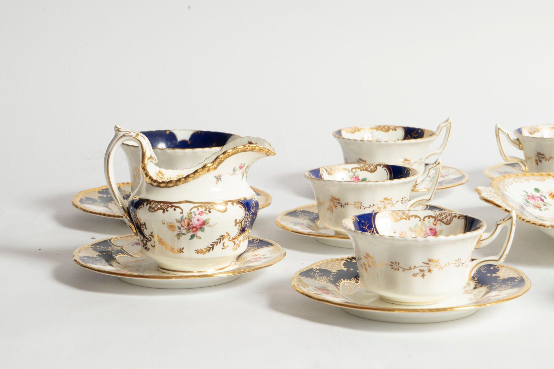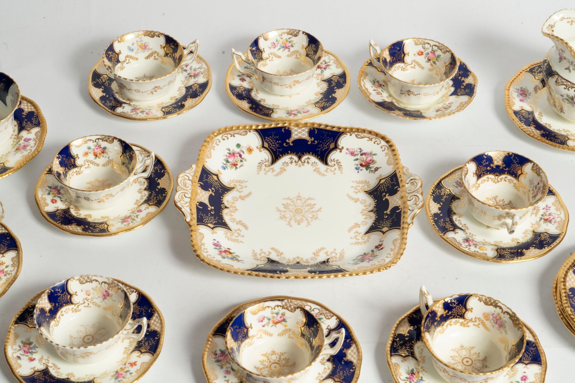 Partie de service à thé en porcelaine comprenant huit tasses, quatorze sous-tasses, deux verseuses, une coupelle et un plateau.