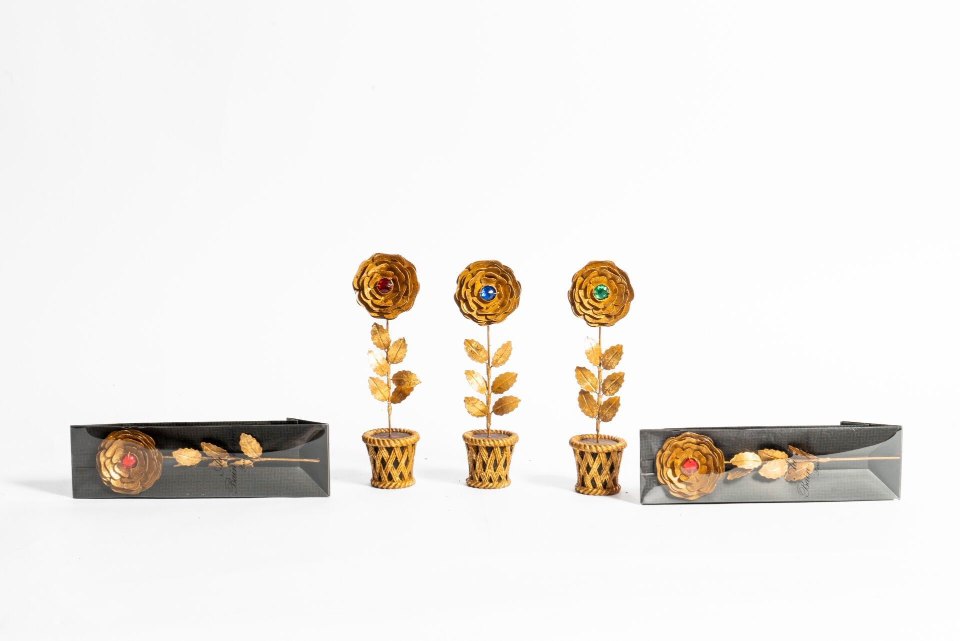 AU BAIN MARIE Réunion de cinq fleurs en métal doré, centrées…