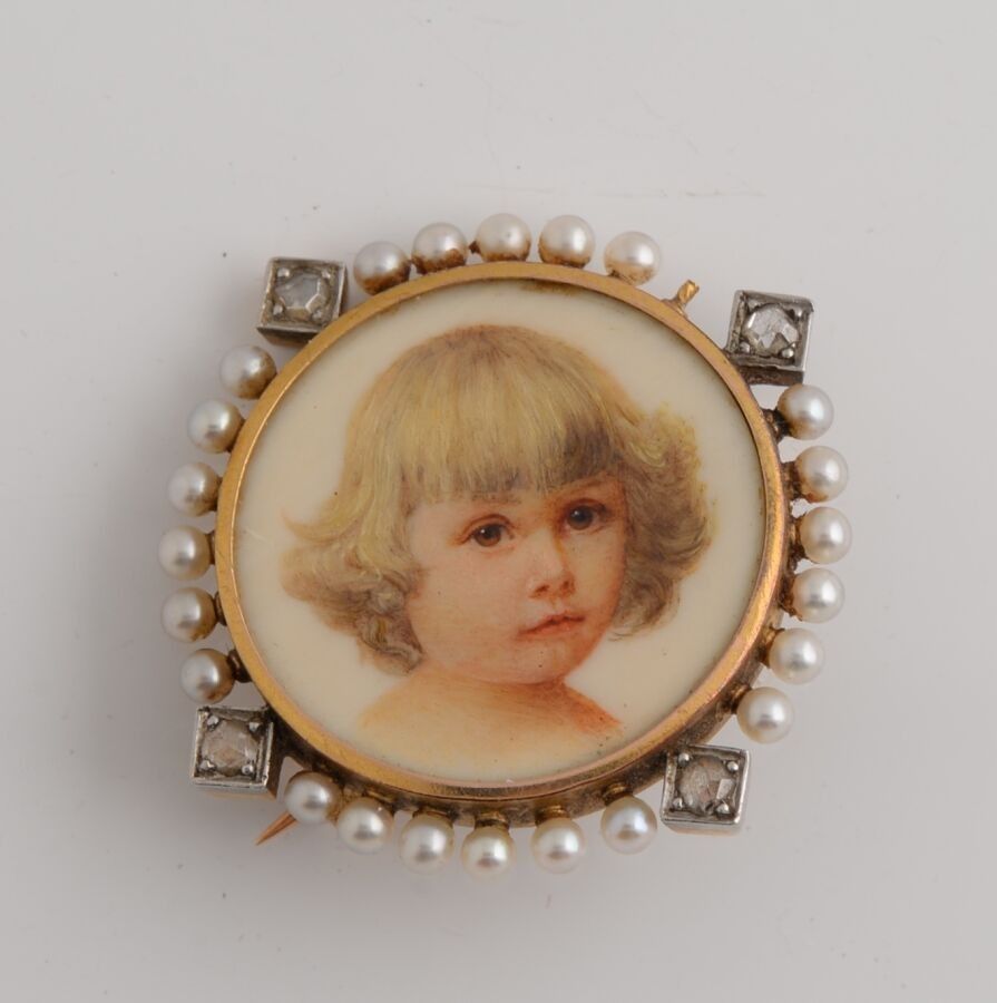 Broche en or jaune et perles sertie de quatre roses sertie d'un médaillon représentant une petite fille.