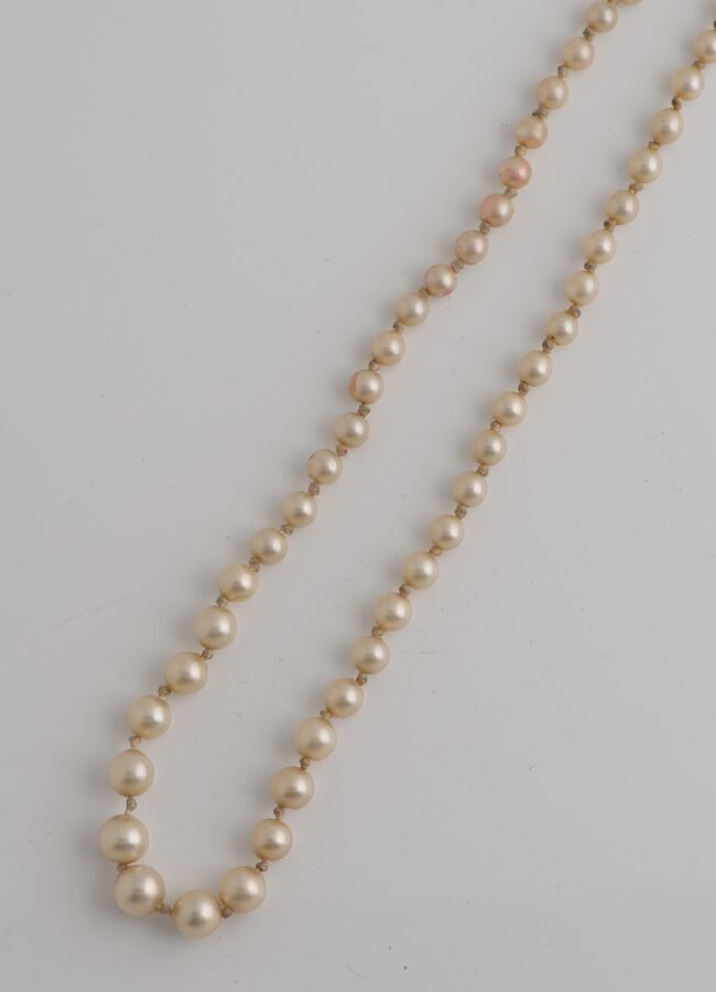 Collier de perles fantaisie à fermoir et chaînette de sécurité en or jaune. Long. 45 cm