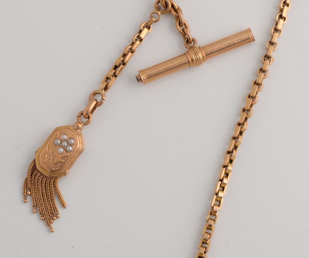 Chaine de montre en or jaune, ornée d'un motif en pendentif …