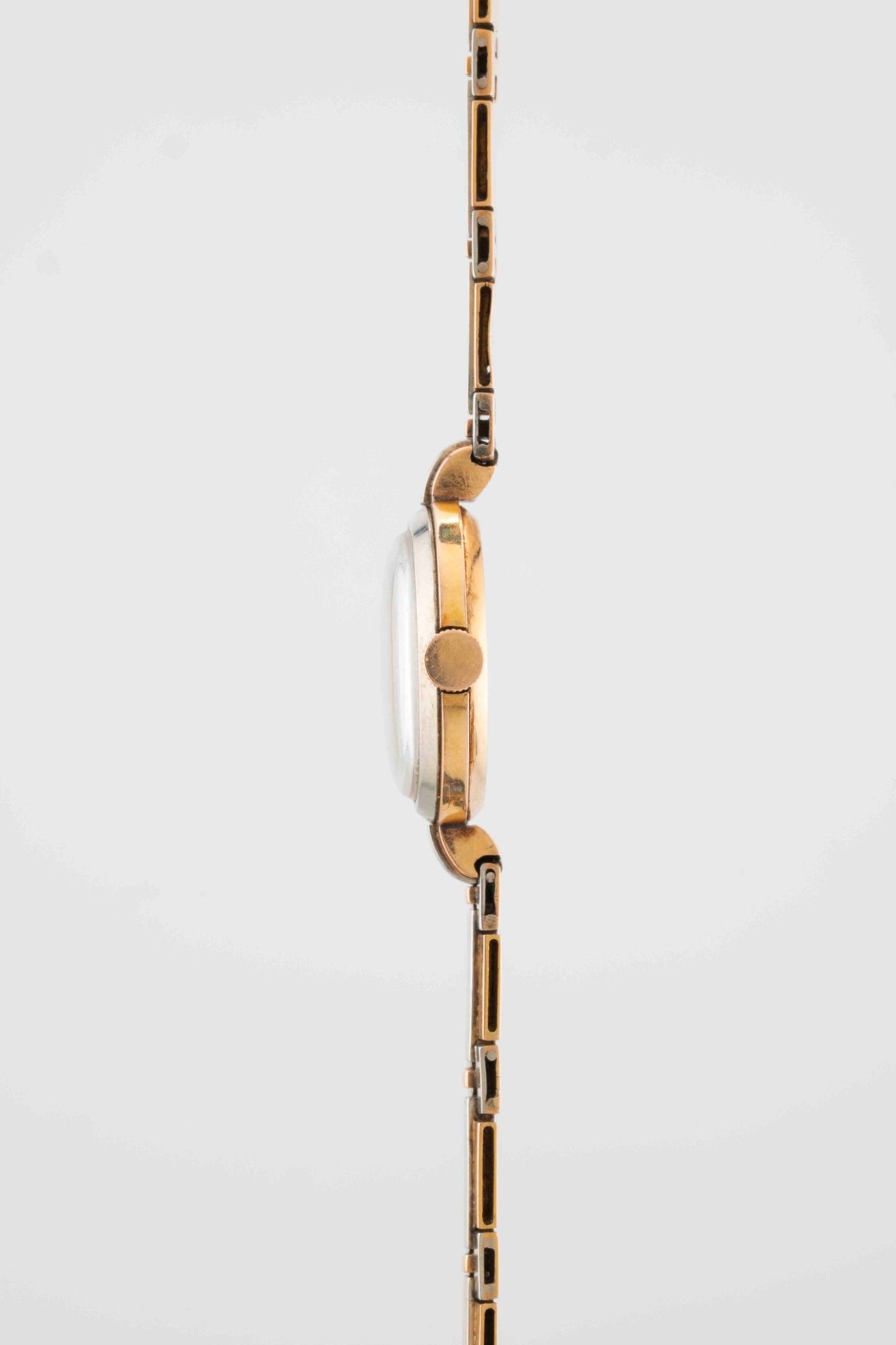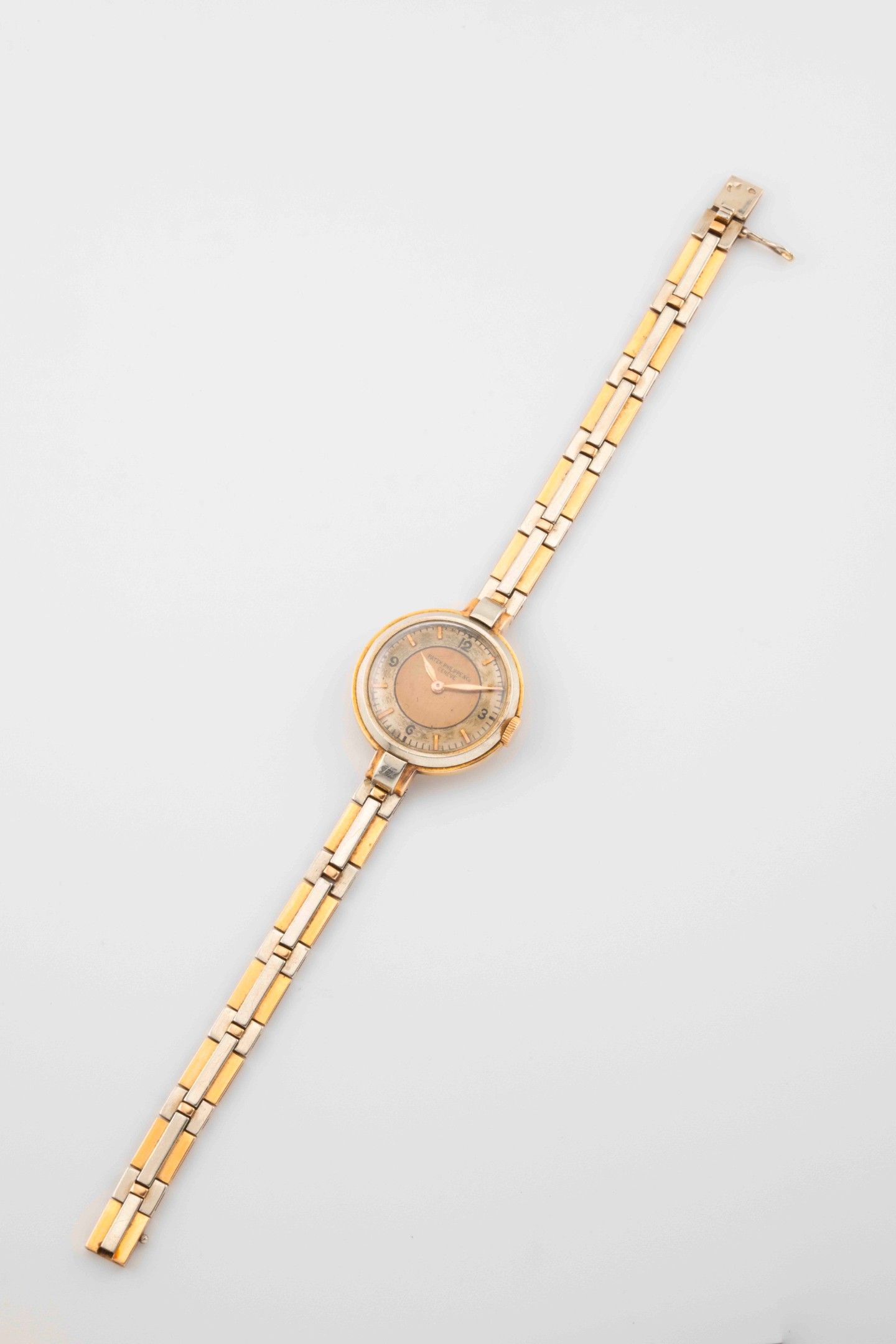 Boîtier : rond deux ors, gris et jaune 750/1000, fond clipsé, remontoir cannelé.