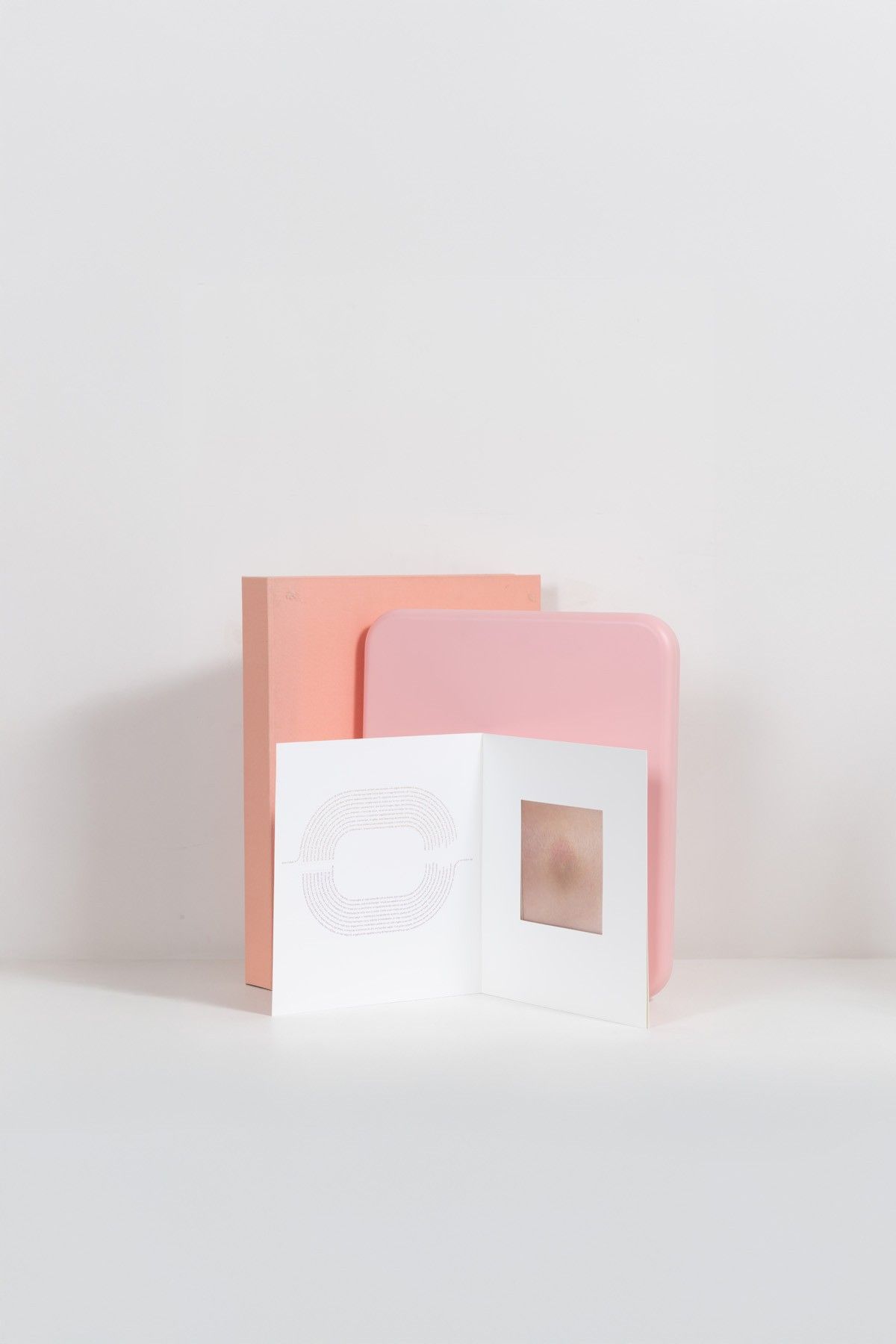 Boîtier en plastique moulé peint conçu par Pierre Charpin, composé de cinq (5) épreuves chromogéniques de Milagros De La Torre signées et numérotées à 30 exemplaires à l’encre aux versos (16 × 16 cm avec marges).
