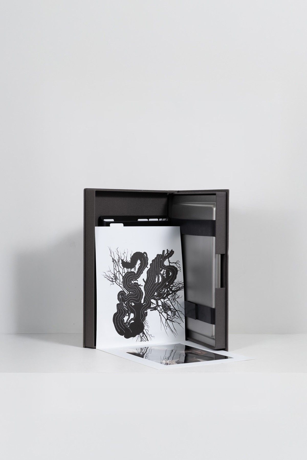 Boîtier en acier inoxydable fixé à l’aide de sangles en caoutchouc équipées d’aimants conçu par Harri Koskinen, composé de cinq (5) cibachromes de Andres Serrano, sous passepartout, signées et numérotées à 50 exemplaires à l’encre aux versos (28 × 34 cm avec marges).