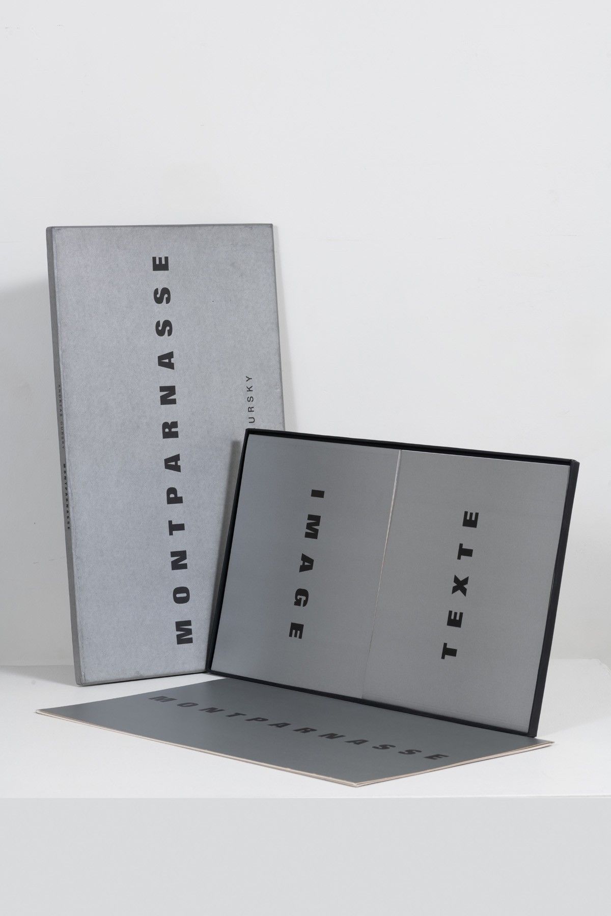 Boîte argentée contenant une reproduction en couleurs imprimée sur carton fort sous pochette titrée Montparnasse et deux livrets brochés, l’un titré Texte, l’autre titré Image avec 20 photographies reproduites en couleurs.