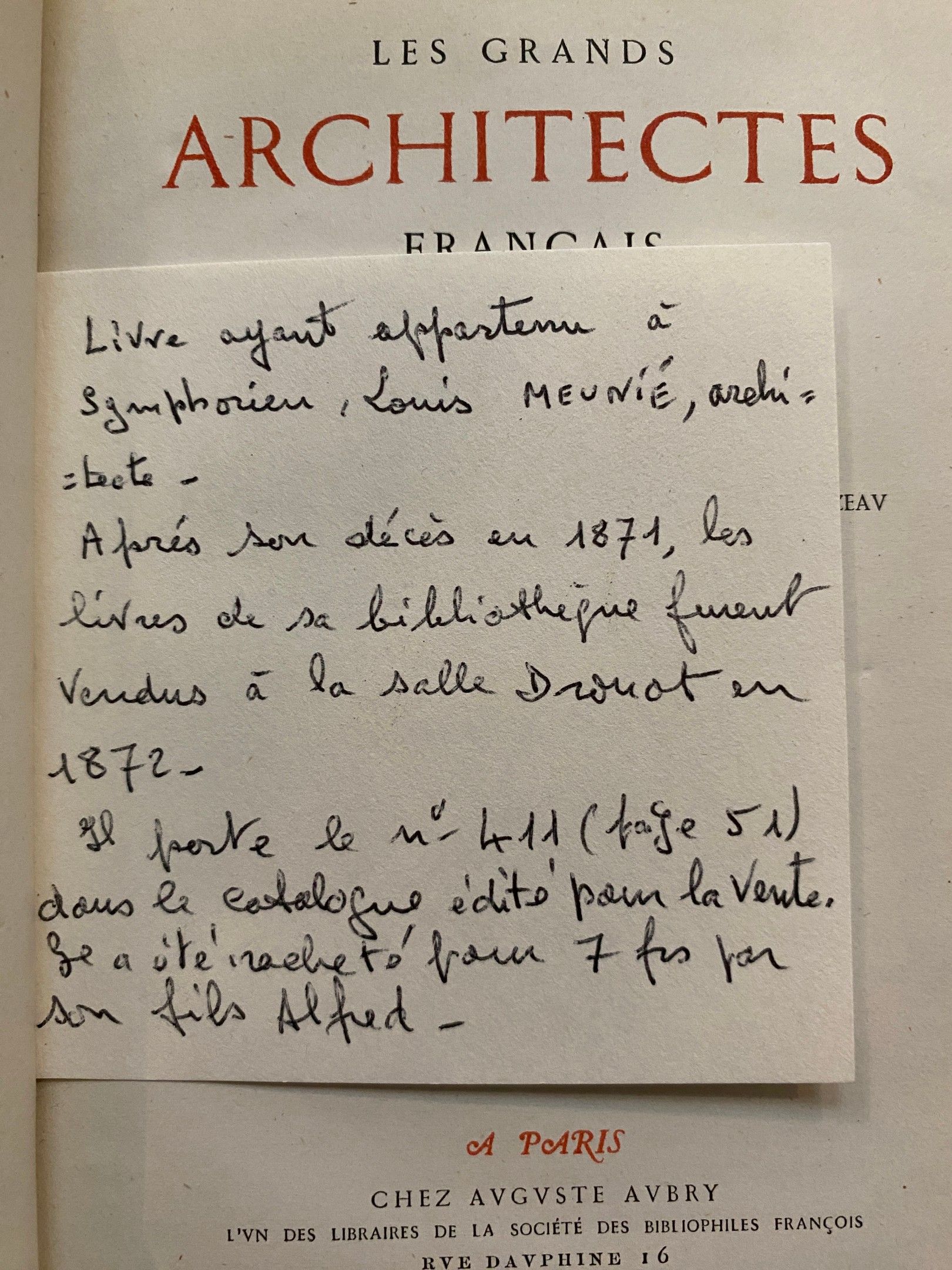 • Les Grands Architectes français de la Renaissance P. Lescot, Ph. de L'Orme, J. Govjon, J. Bvllant, les Dv Cerceau, les Metezeav, les Chambiges [...]. A Paris, Chez Auguste Aubry, 1860. In-12, demi-chagrin rouge à coins, dos à nerfs orné (reliure de l'époque).