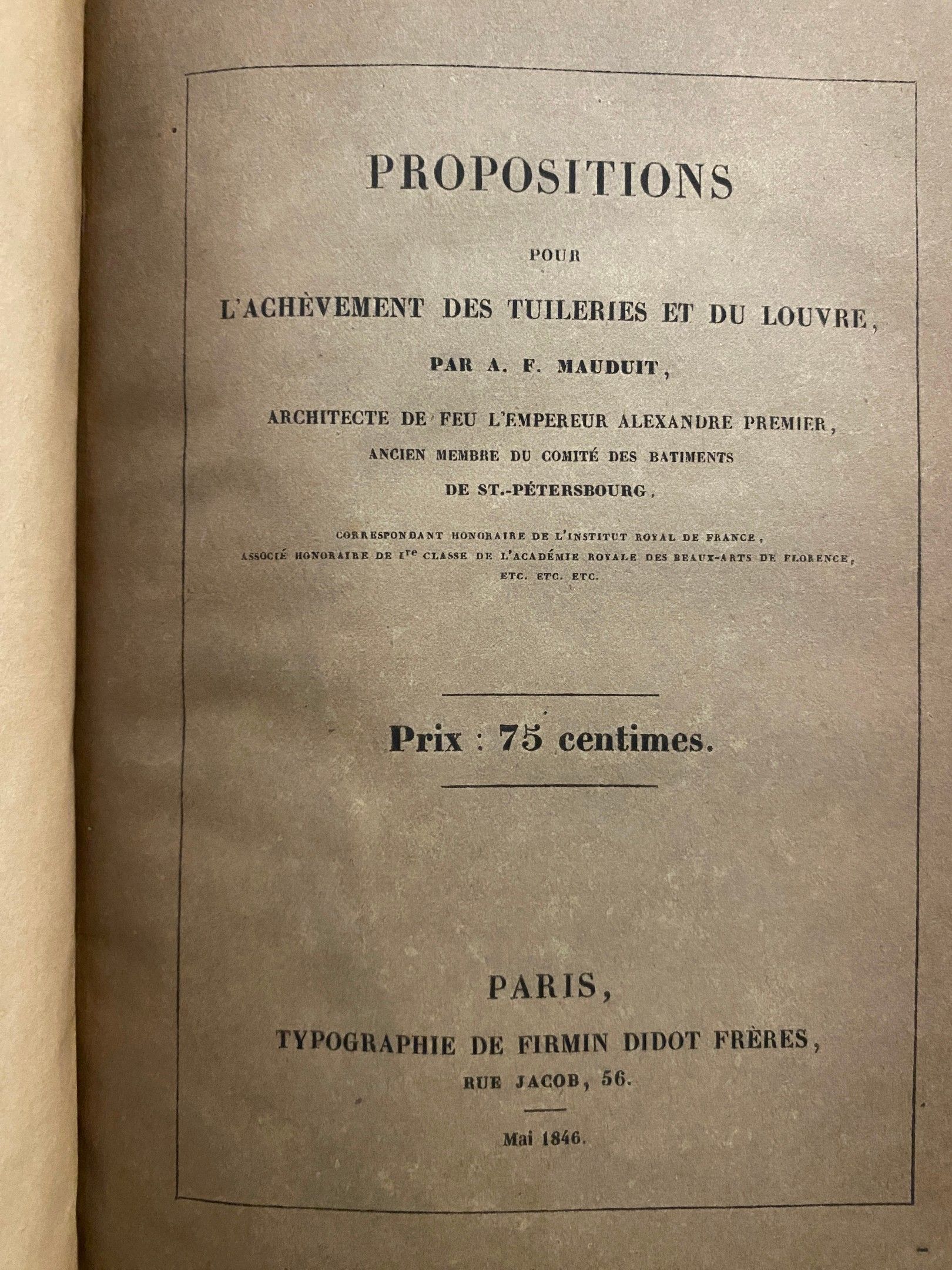 Propositions pour l'achèvement des Tuileries et du Louvre. Paris, Typographie de Firmin Didot Frères, mai 1846. Petit in-8° bradel, demi-percaline brune, dos orné d'une pièce de titre en long, couverture brune conservée (reliure début XXe s.).