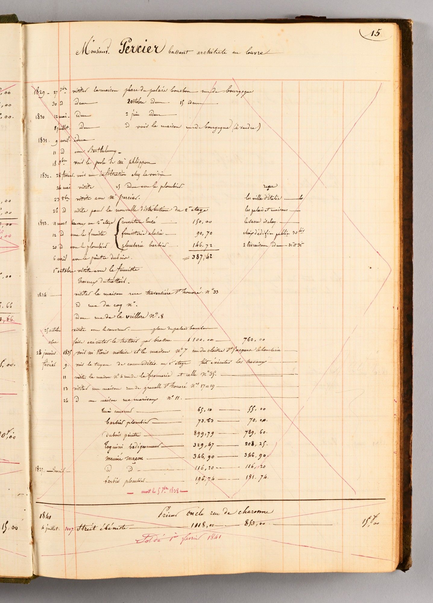 Le compte de chaque client est dressé avec soin à l'encre brune, puis après le solde biffé de deux traits à l'encre rouge. Y sont mentionnées les commandes aux fournisseurs de gros œuvre, les estimations immobilières, l'expertise des servitudes, la surveillance et vérification des travaux, les visites d'entretien, les mémoires sur les projets, etc., le tout soigneusement chiffré.