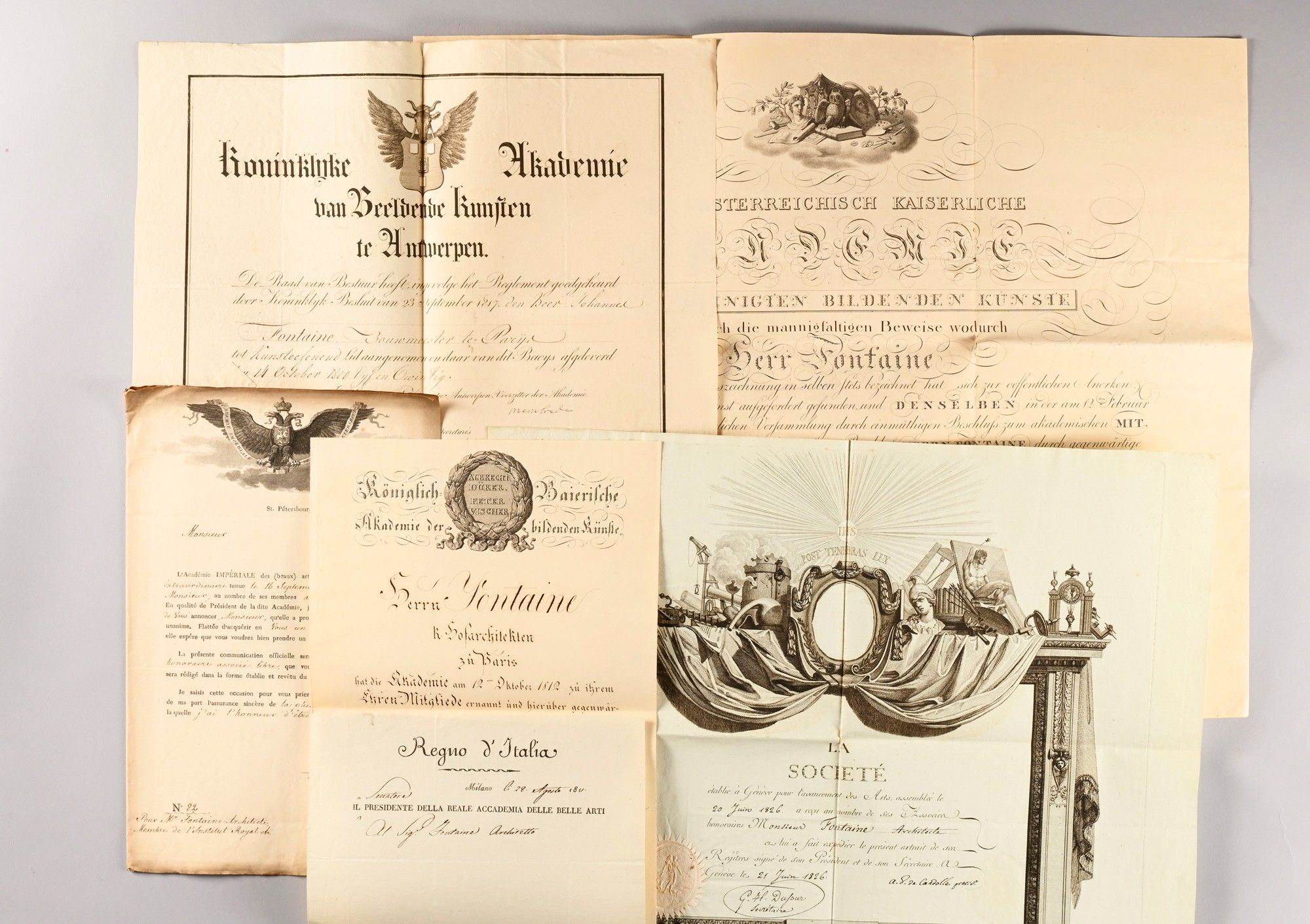 L'Accademia Eugeniana delle Arti di Carrara, 31 août 1810, lettre de nomination signée par le secrétaire perpétuel P. Bargigli. - Reale Accademia delle Belle Arti, Milan 28 août 1811, lettre de nomination signée par le Président Luigi Castiglioni. - Die Oesterreichisch Kaiserliche Akademie der vereinigten bildenden Künste, Vienne 12 février 1812, diplôme signé par les Président et Secrétaire von Sonnenfed et Ellmaurer ; avec l.a.s. d'envoi par Ellmaurer et la brochure impr. des statuts. - Königlich Baierische Akademie der bildenden Künste, Munich 12 octobre 1814, nomination signée par le Secrétaire perpétuel Schelling, avec l.s. d'envoi. - Décoration du Lys, Paris 1er décembre 1814, brevet signé par Charles-Philippe comte d'Artois, futur Charles X. - Koninklyke Akademie van Beeldende Kunsten te Antwerpen, Anvers 23 septembre 1817, diplôme signé par le Secrétaire Jan Adr. Snyers, avec l.s. d'envoi. - Academia Regia Artium Elegantiorum Havniensis, Copenhague avril 1824, diplôme signé par le prince Christian Frédéric, président, avec l.s. d'envoi. - Académie Impériale des Arts, Saint-Pétersbourg 6 mai 1824, lettre de nomination signée par Alexis d'Olenine. - La Société établie à Genève pour l'avancement des Arts, Genève 21 juin 1826, diplôme signé par les Président et Secrétaire A.P. de Candolle et G.H. Dufour. - Département de la Seine. Commissions sanitaires, Paris 16 novembre 1831, griffe du comte de Bondy, Préfet. - Institute of British Architects, Londres 4 mai 1835, diplôme signé par les Président et Secrétaire de Grey et Th. L. Donaldson, avec l.s. d'envoi par Donaldson. - Académie Royale des Sciences, des Lettres et des Beaux-Arts de Belgique, Bruxelles 18 mars 1846, diplôme signé par les Président et Secrétaire Fétis et Quetelet, avec l.a.s. d'envoi par Quetelet.