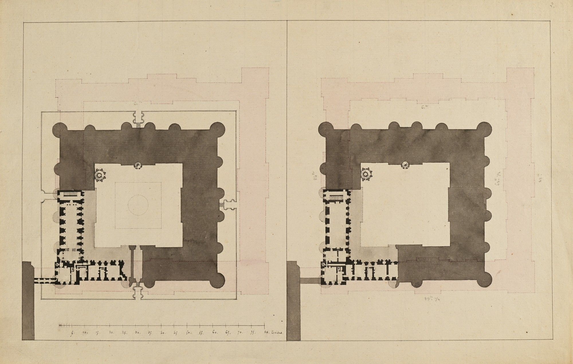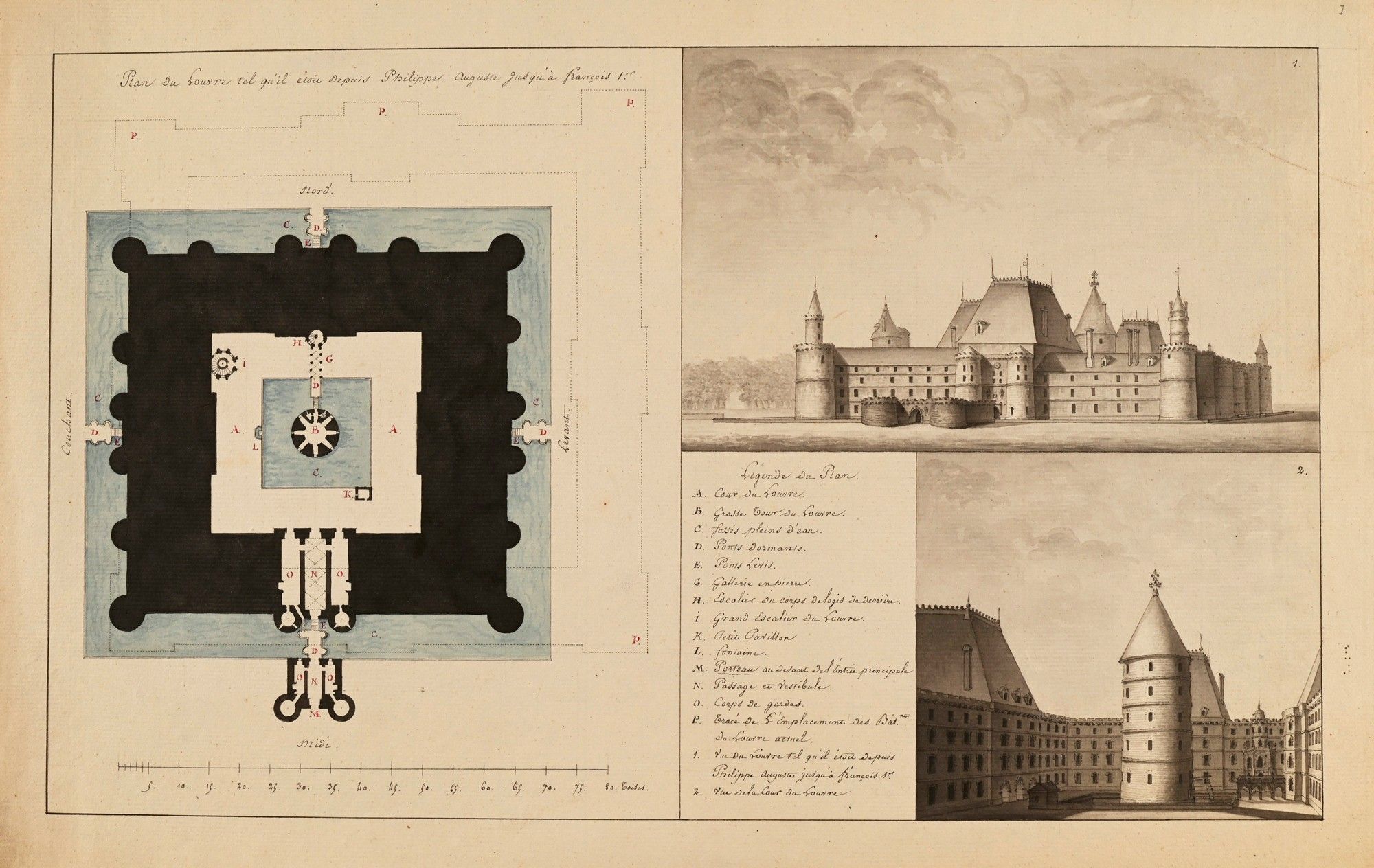 Deux plans du Louvre depuis Philippe Auguste jusqu'à François Ier et vues extérieures