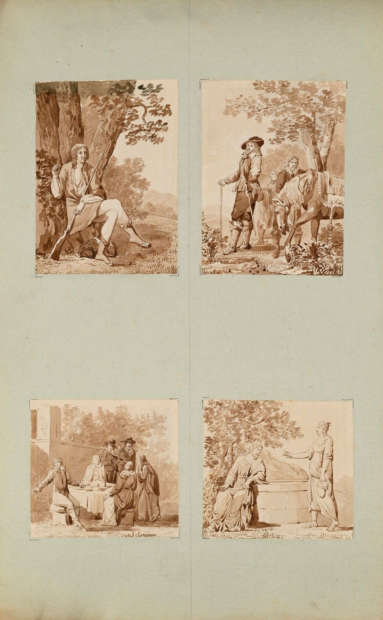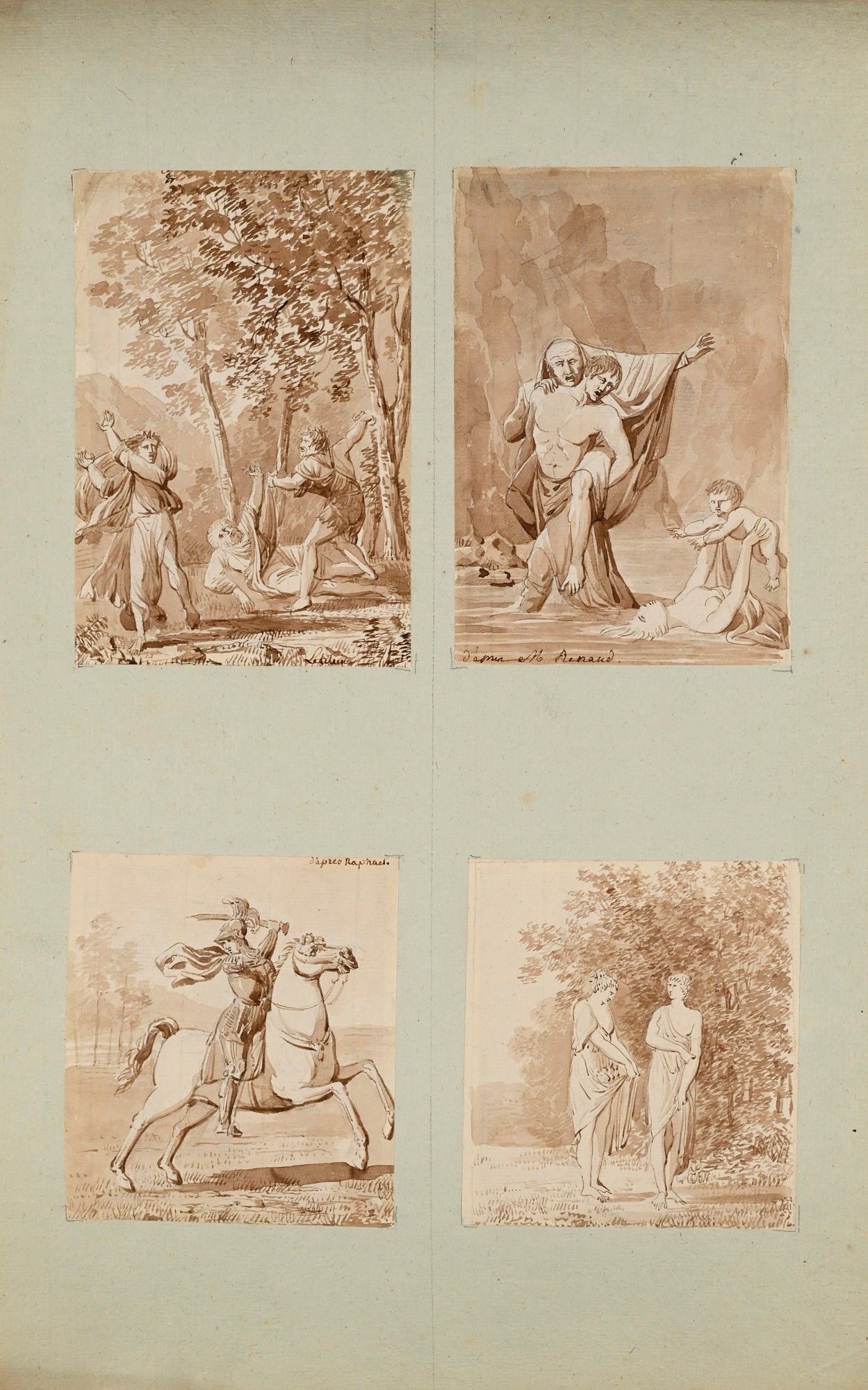 Treize dessins sur quatre montages, plume et encre noire, grise et brune, lavis gris et brun sur traits à la pierre noire.
