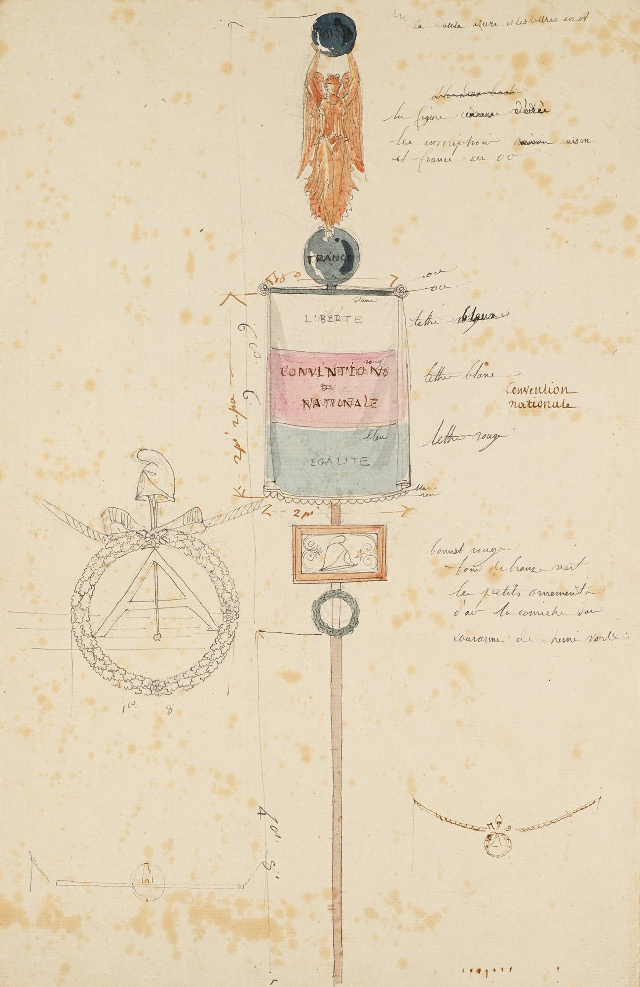 Projet de haut de mât pour la Convention Nationale, surmonté d'une Victoire ailée tenant une boule azur