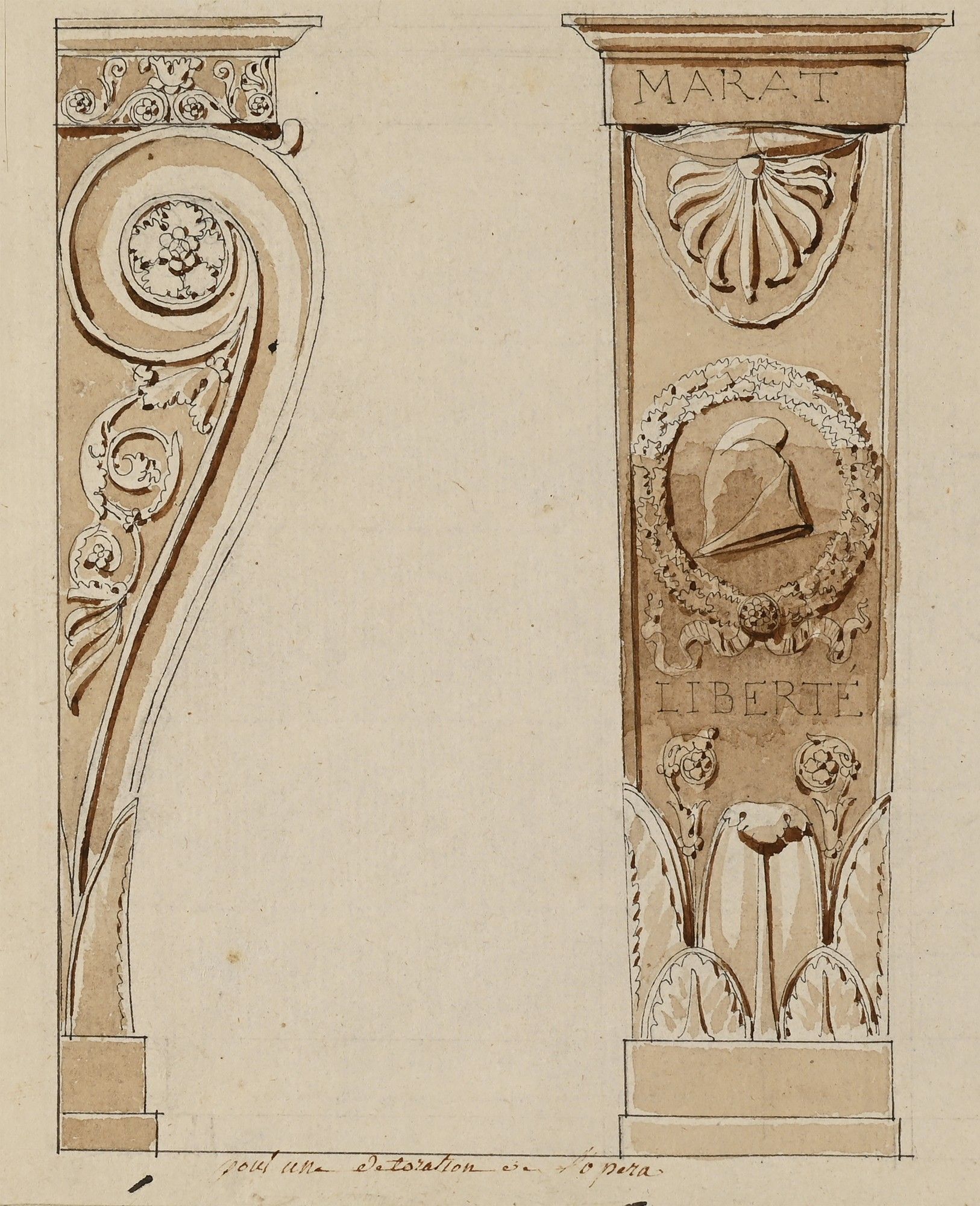 Projet de décoration pour l'Opéra : montants à enroulements et décor portant l'inscription «Marat» et «Liberté», de la période révolutionnaire
