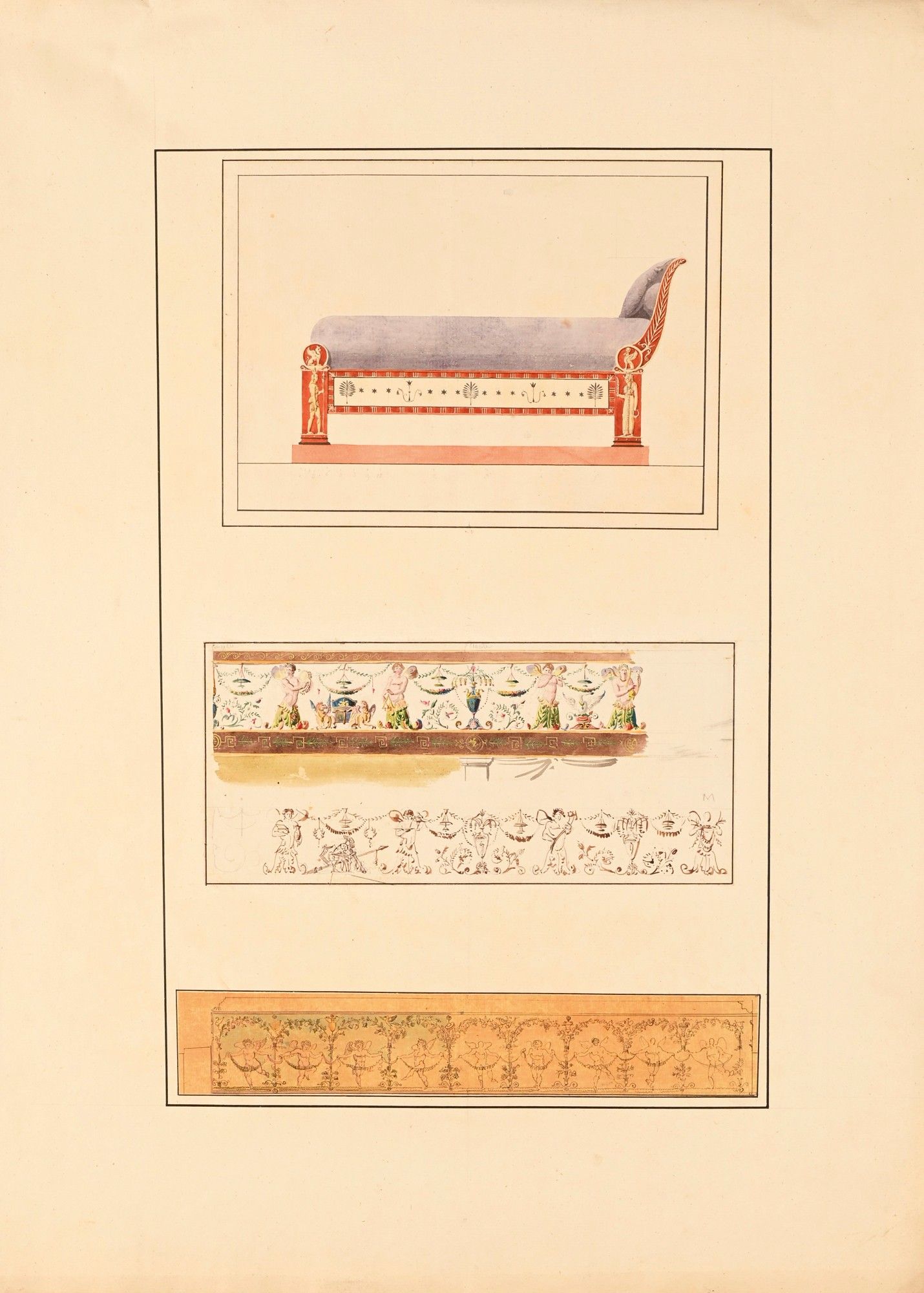 Études pour un décor mural intérieur, trois frises et un lit de repos