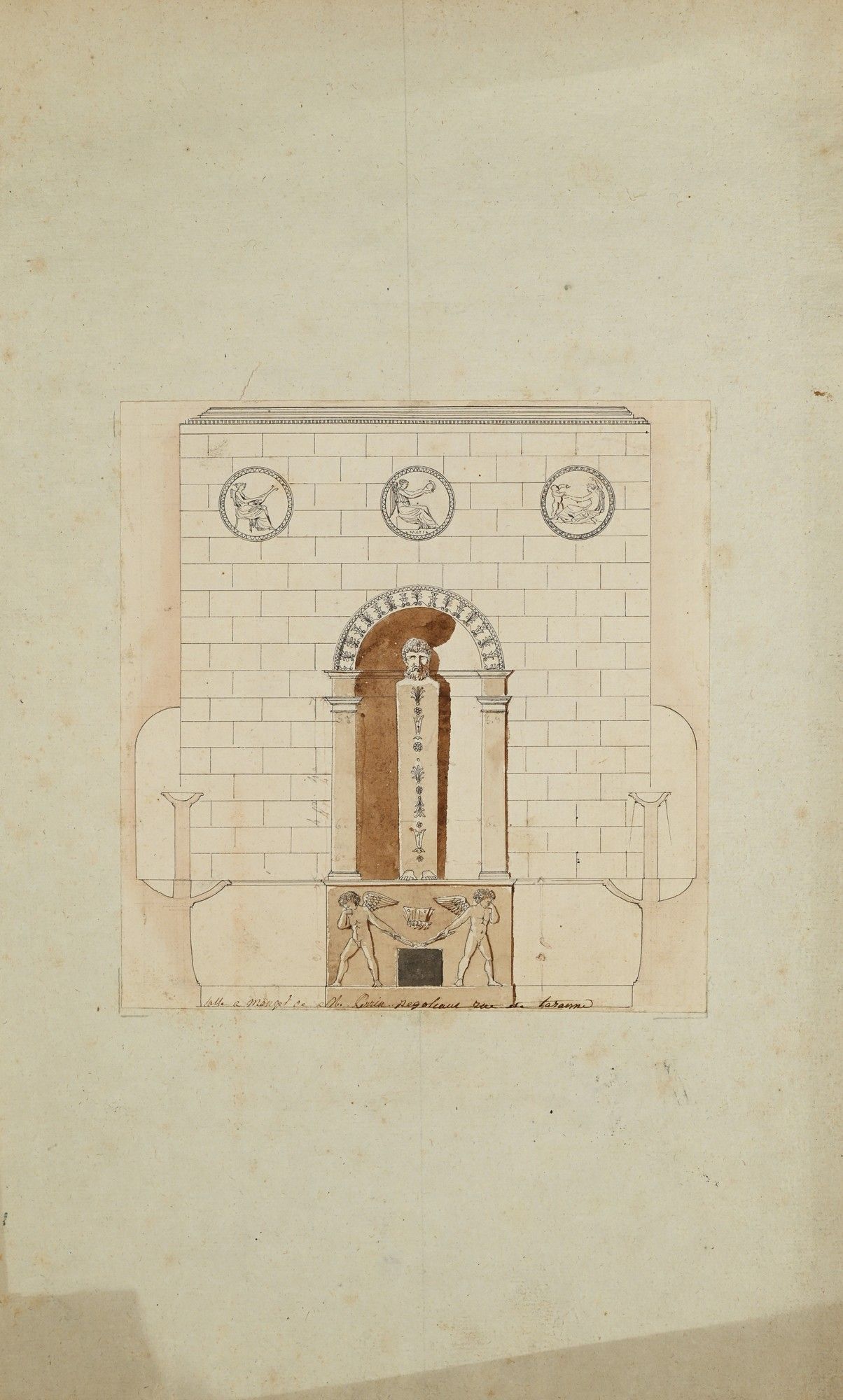 Plume et encre noire, lavis gris et brun sur traits à la pierre noire.