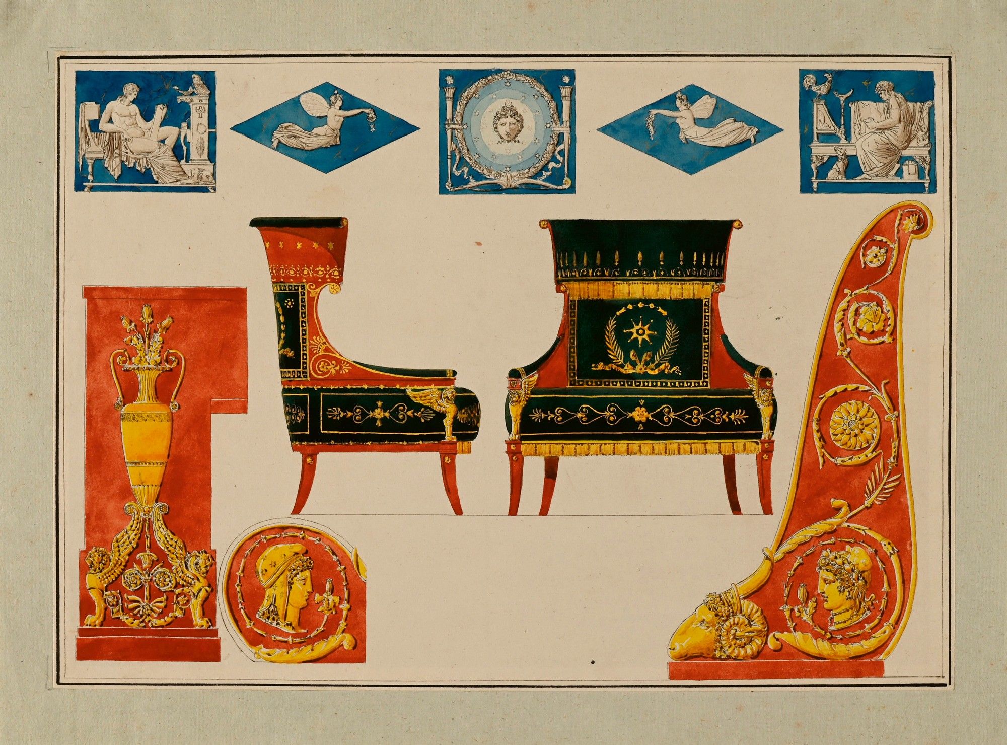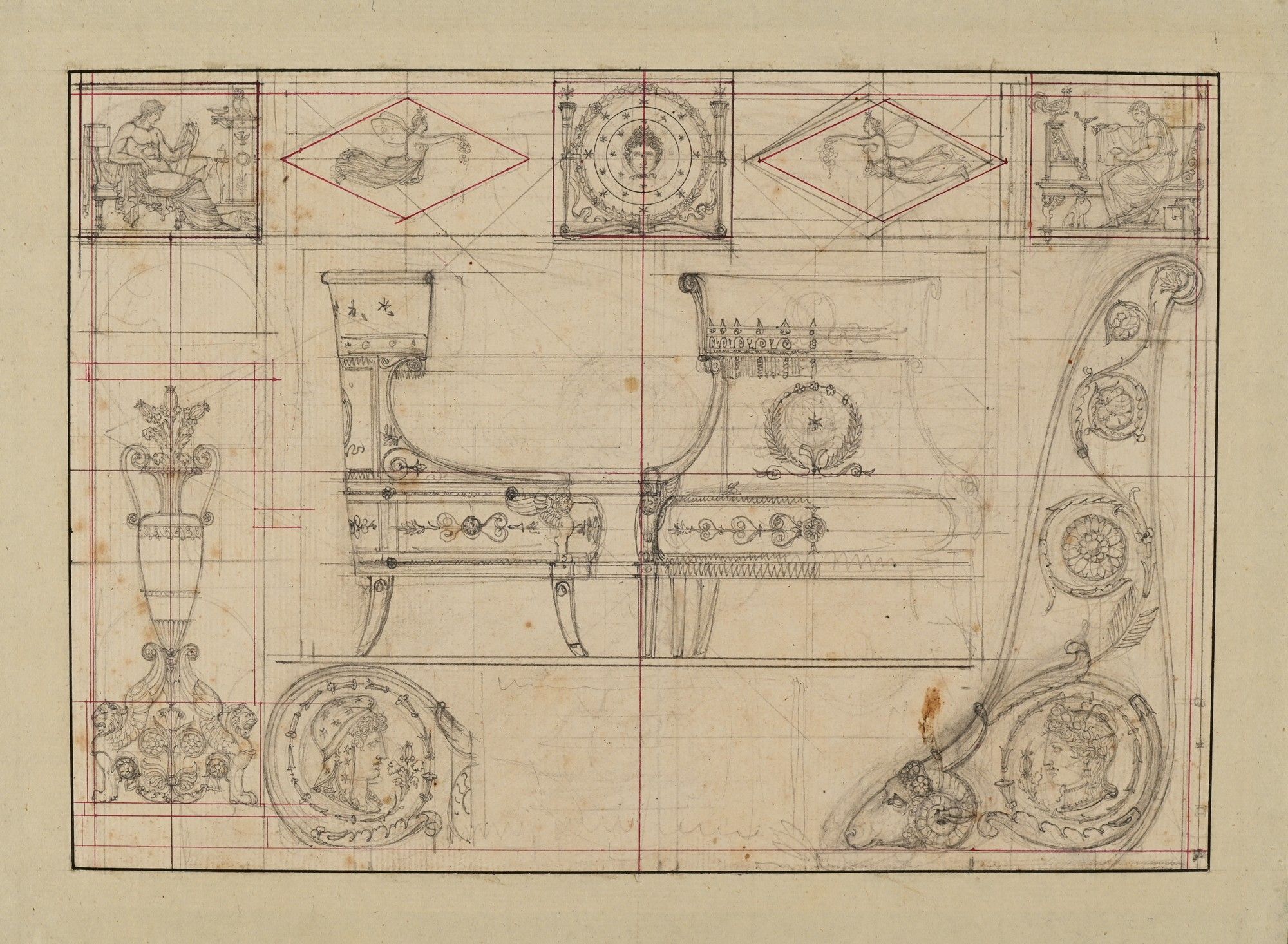 Projet de fauteuil et tête de lit décor d'une tête de bélier, vases et ornements pour la Chambre du Cit. V.