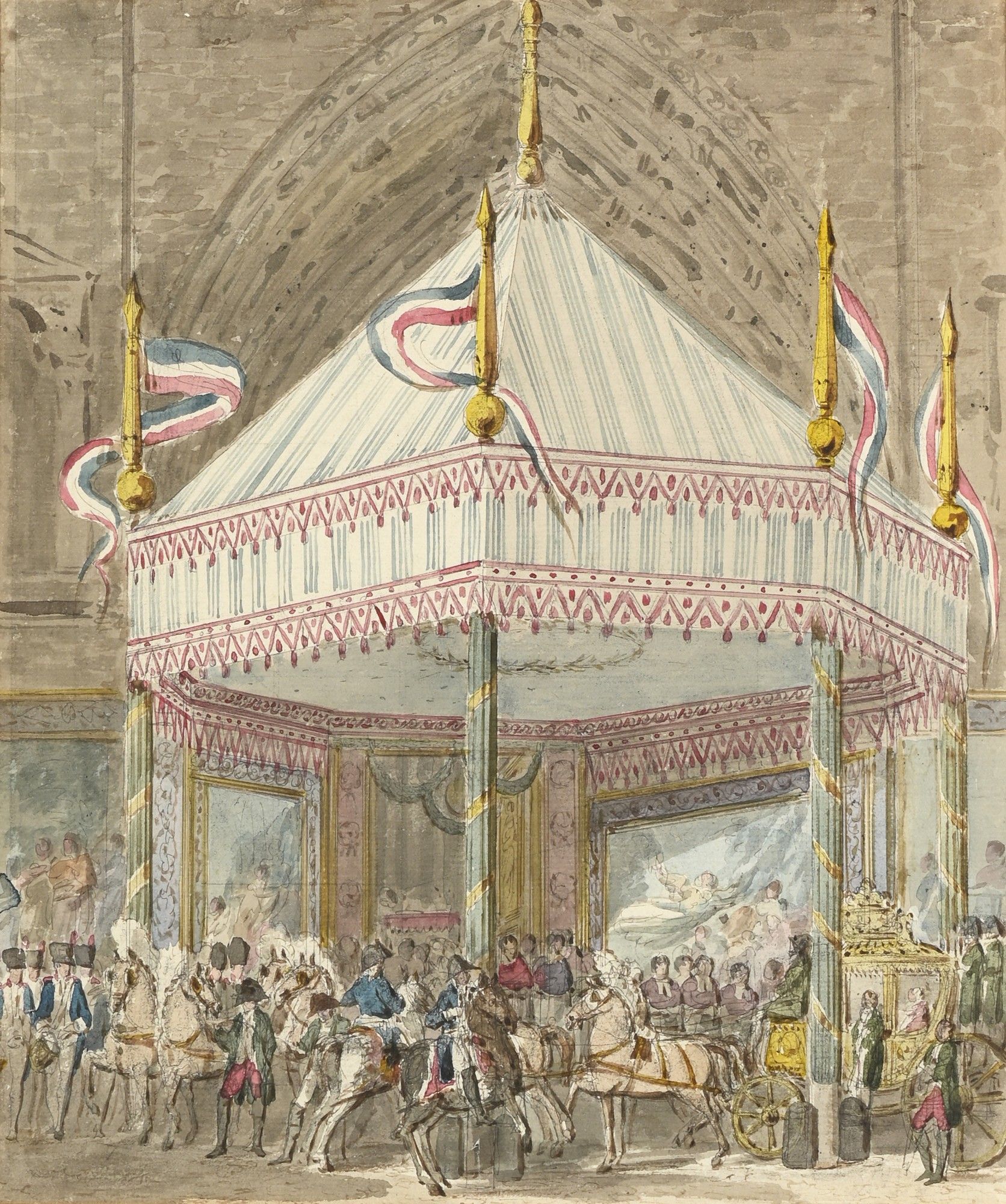 Porte au verso une ancienne étiquette Pavillon à Notre Dame / pour le sacre de / Napoléon Ier. / aquarelle par P.F.L. Fontaine. / appartient à / Mr A. Meunié, architecte, / rue de Florence 12.