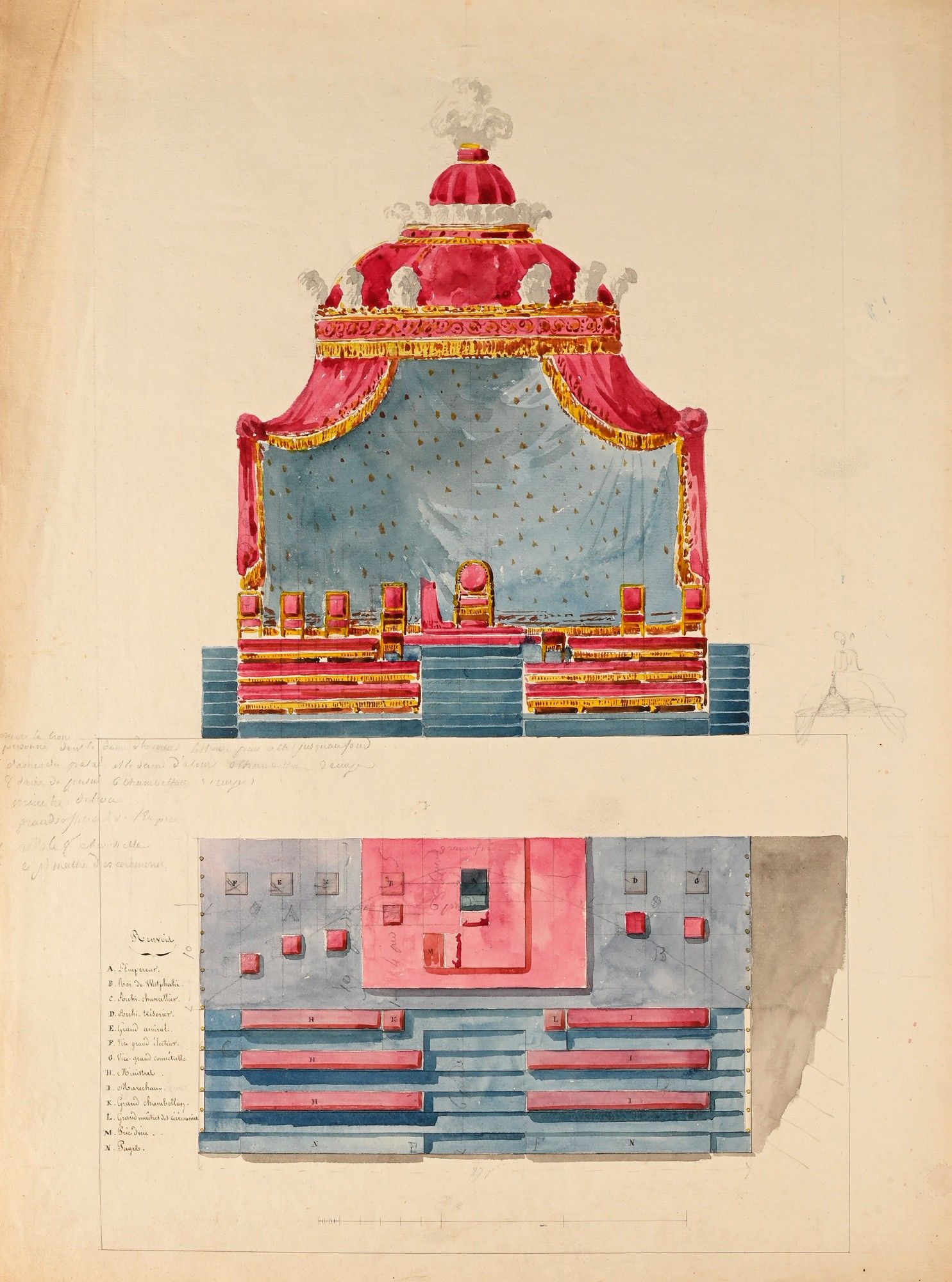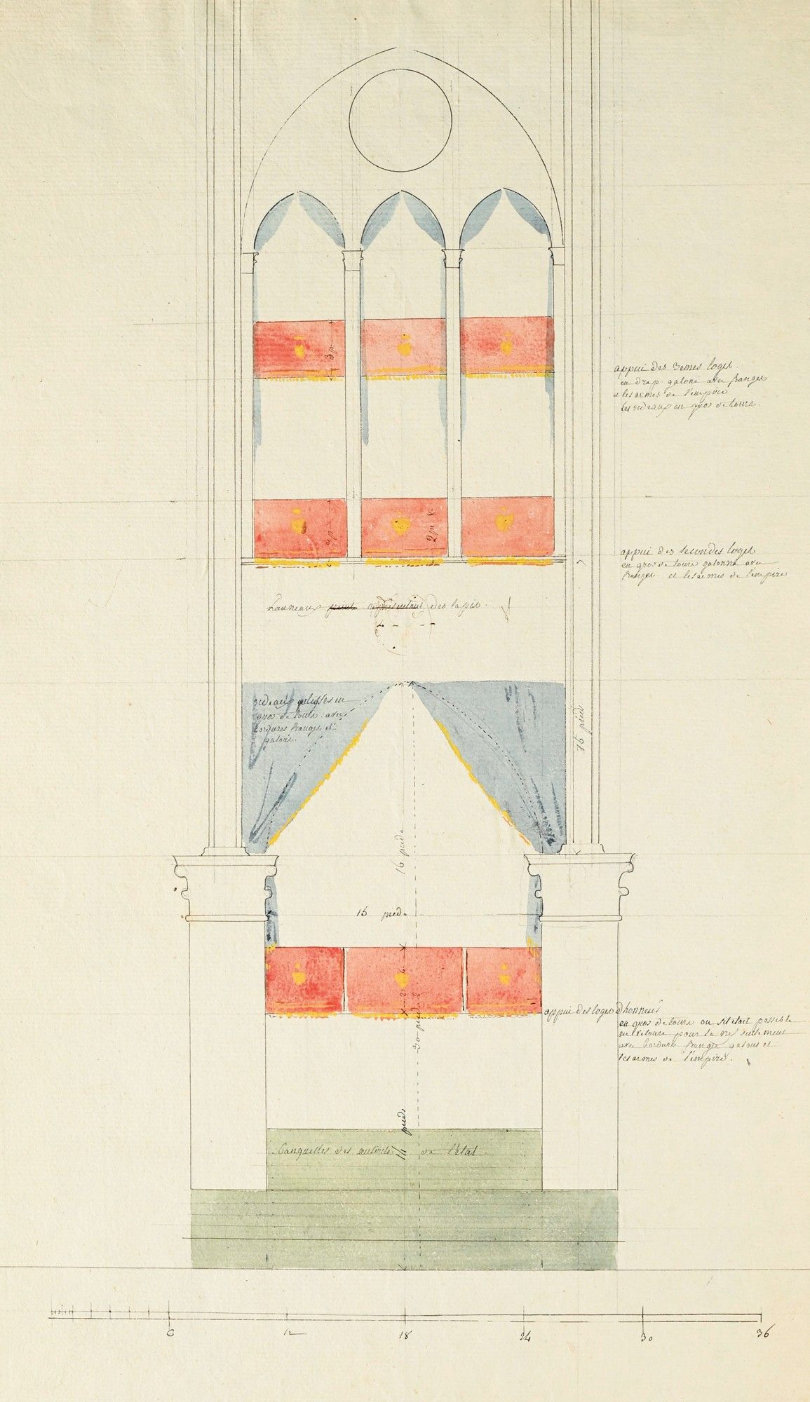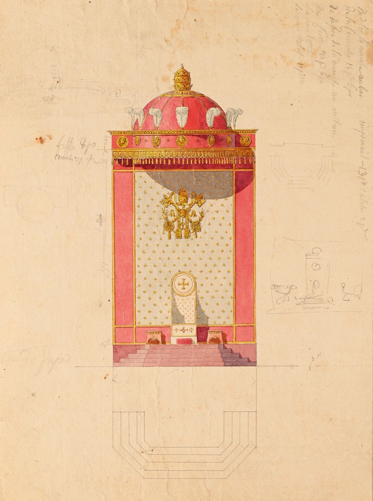 Projets d'un dais d'honneur et une estrade (annoté du placement), une estrade papale, une loge d'honneur