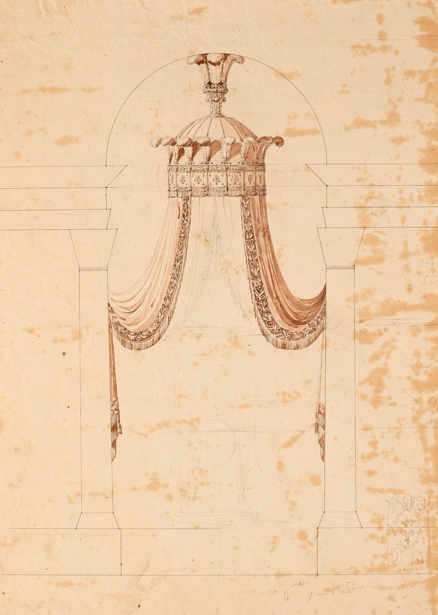 La plupart de nos dessins sont des détails de décors intérieurs ou extérieurs publiés dans l'ouvrage C. Percier et P.F.L. Fontaine, Description des cérémonies et des fêtes [...] pour le couronnement de leurs Majestés Napoléon [...] et Joséphine [...], Paris, 1807, reproduits pl. 7, 8, 9.