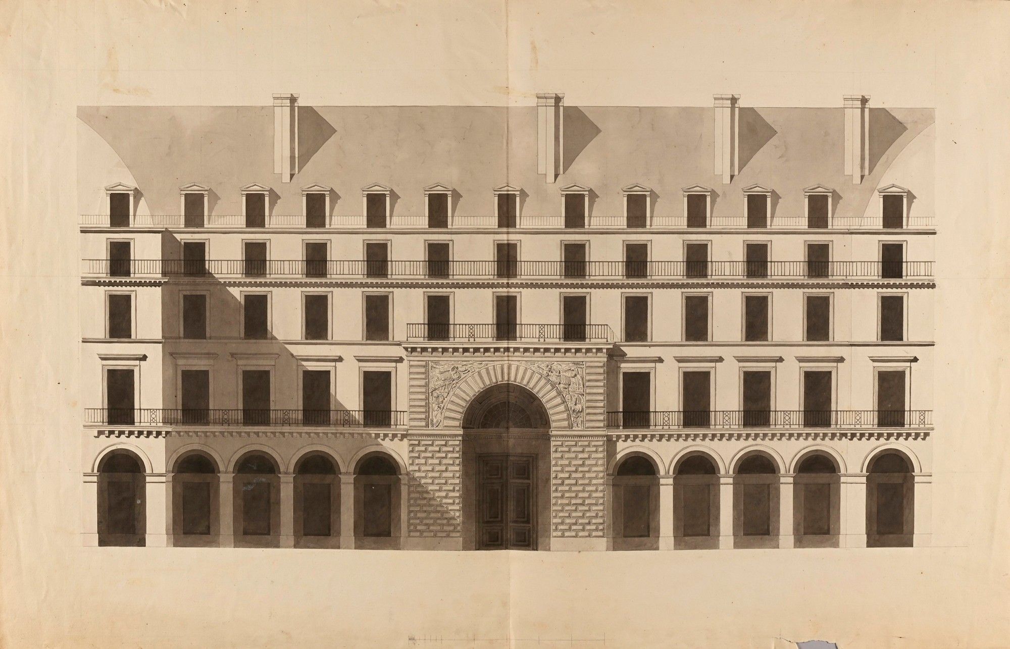Six projets de façade à bossages pour des écuries, décor de trophées d'armes, l'un au chiffre de Napoléon