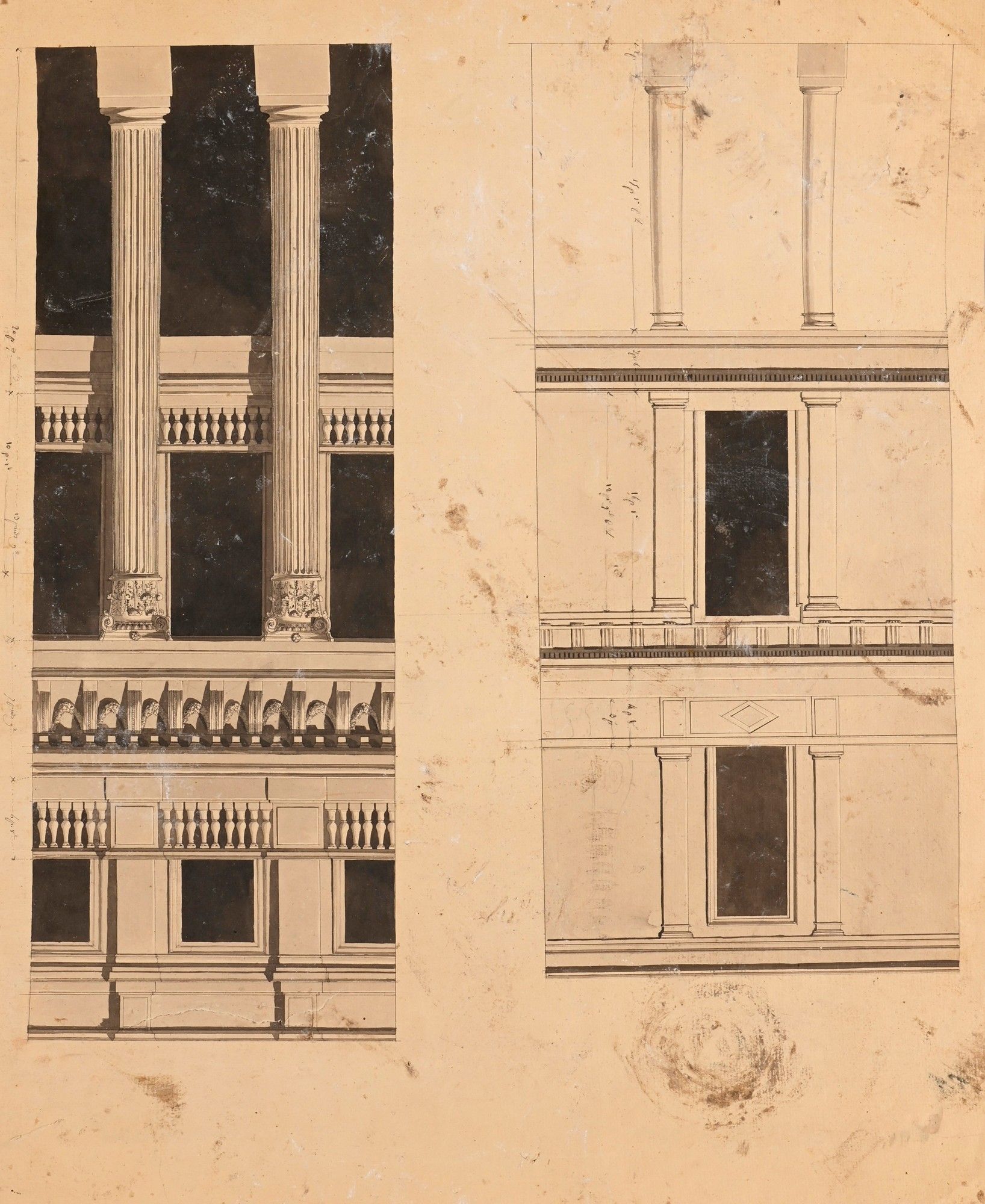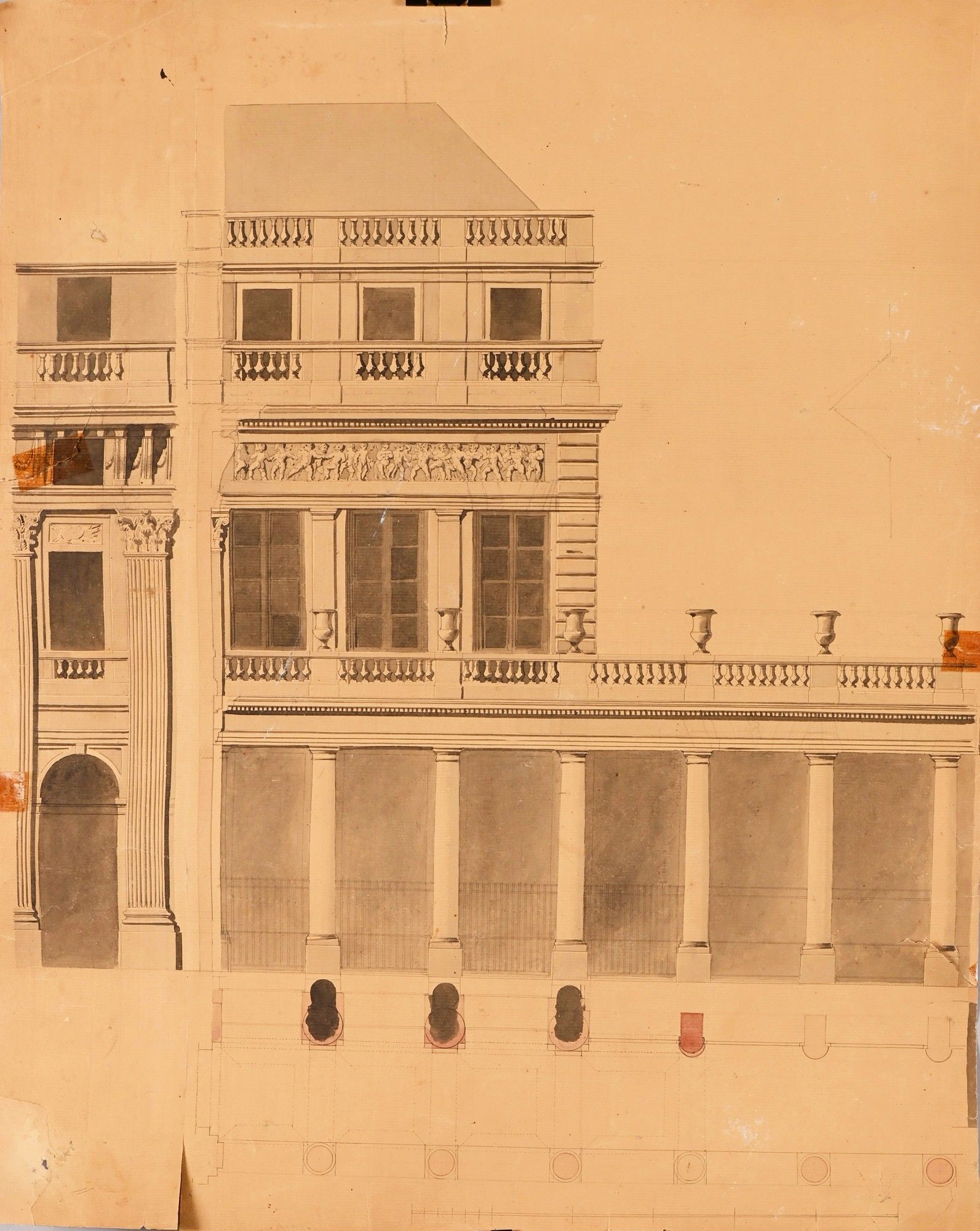 Élévations, façades, plans d'études, projets ou relevés pour le Palais Royal, plans de la salle de spectacles et du vestibule circulaire, coupes et élévations à colonnade et cabinet de peinture