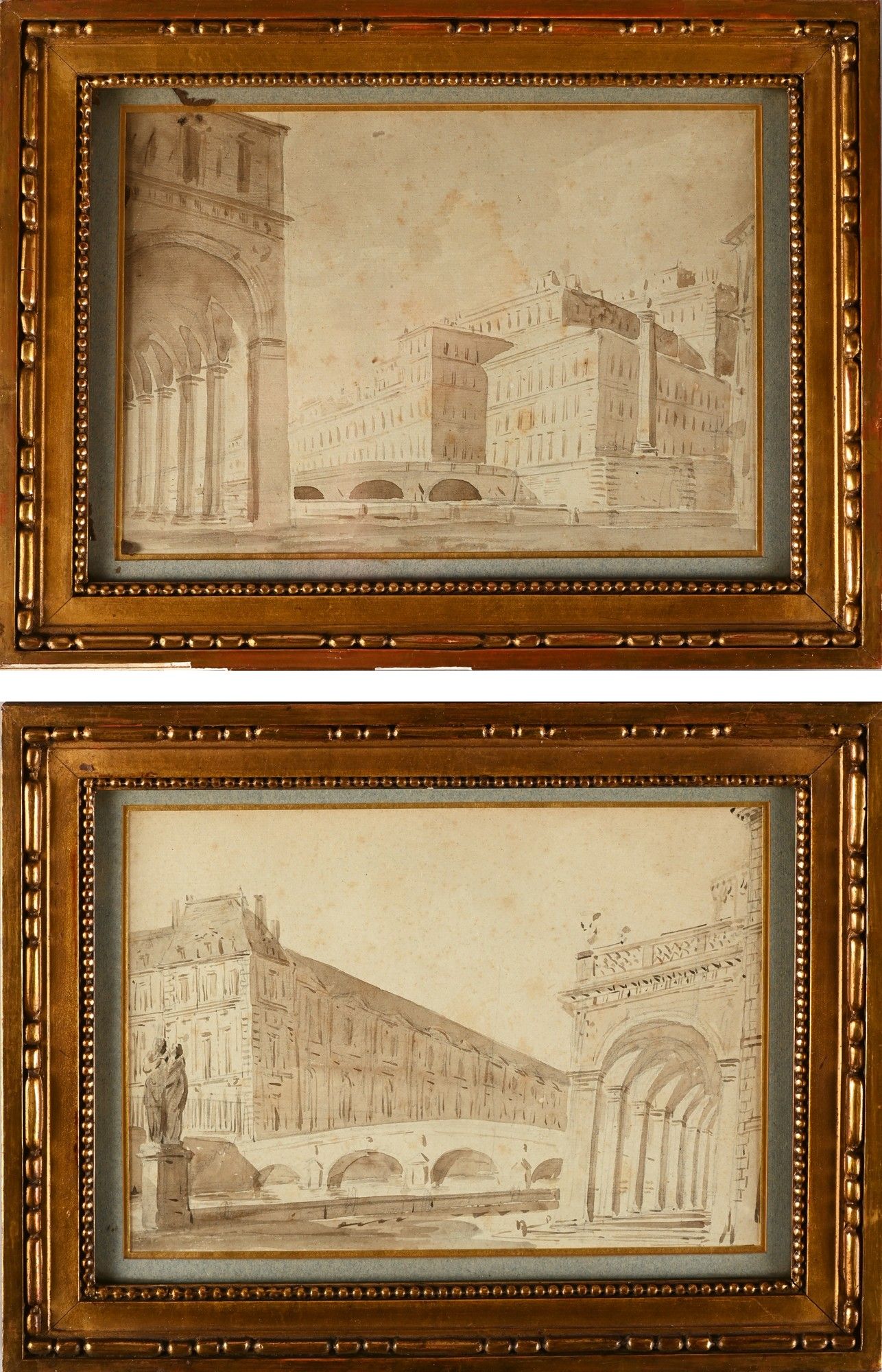 Paire de dessins, plume et encre brune, lavis brun sur traits à la pierre noire.