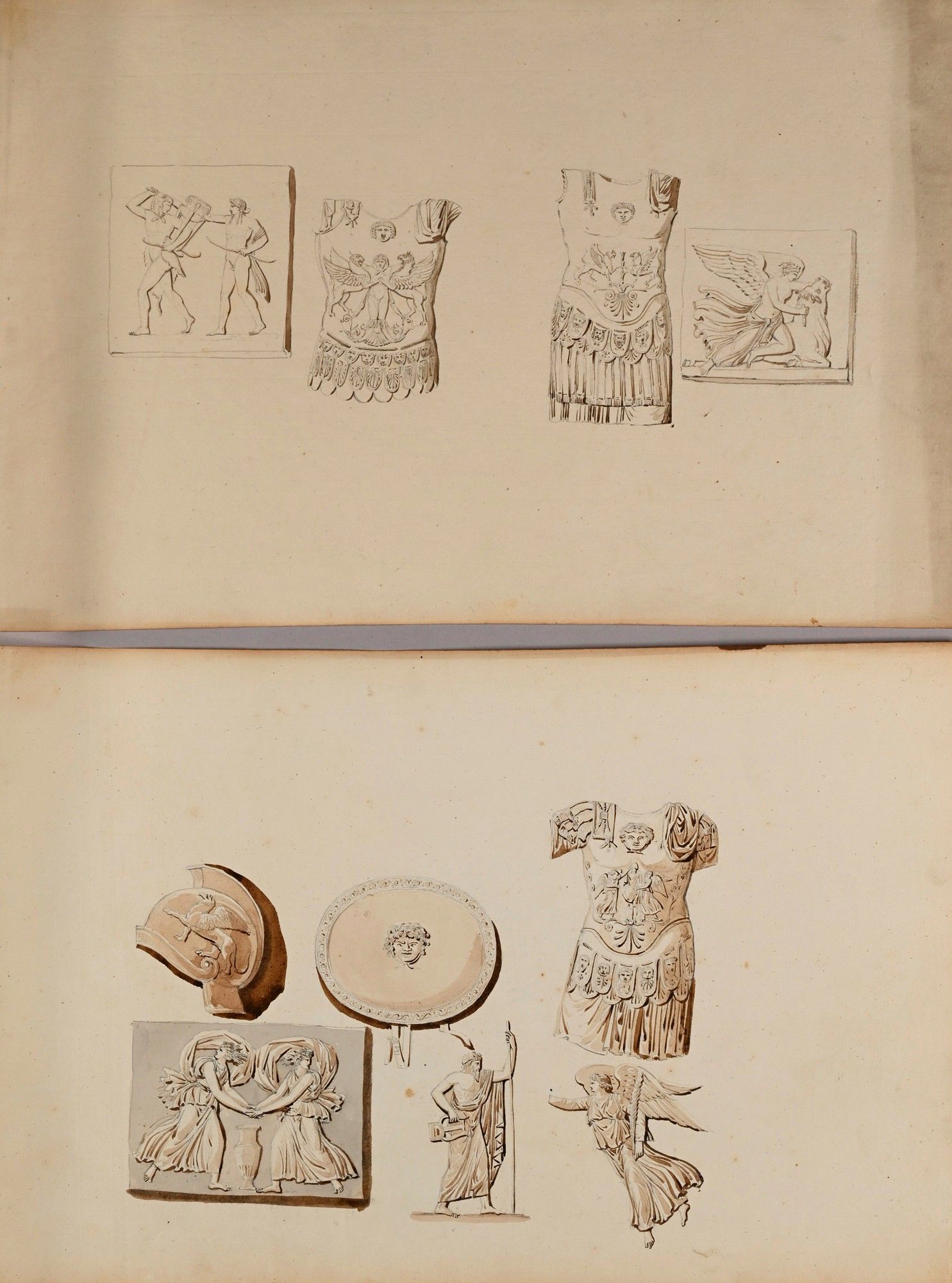 Nous retrouvons les deux dessins d'armures utilisés comme illustration du texte du recueil de C. Percier et P.F.L.F. Fontaine, Choix des plus célèbres maisons de plaisance de Rome et de ses environs, Paris, 1809, page 11, et légendés Fragments antiques tirés de la Villa Albani.