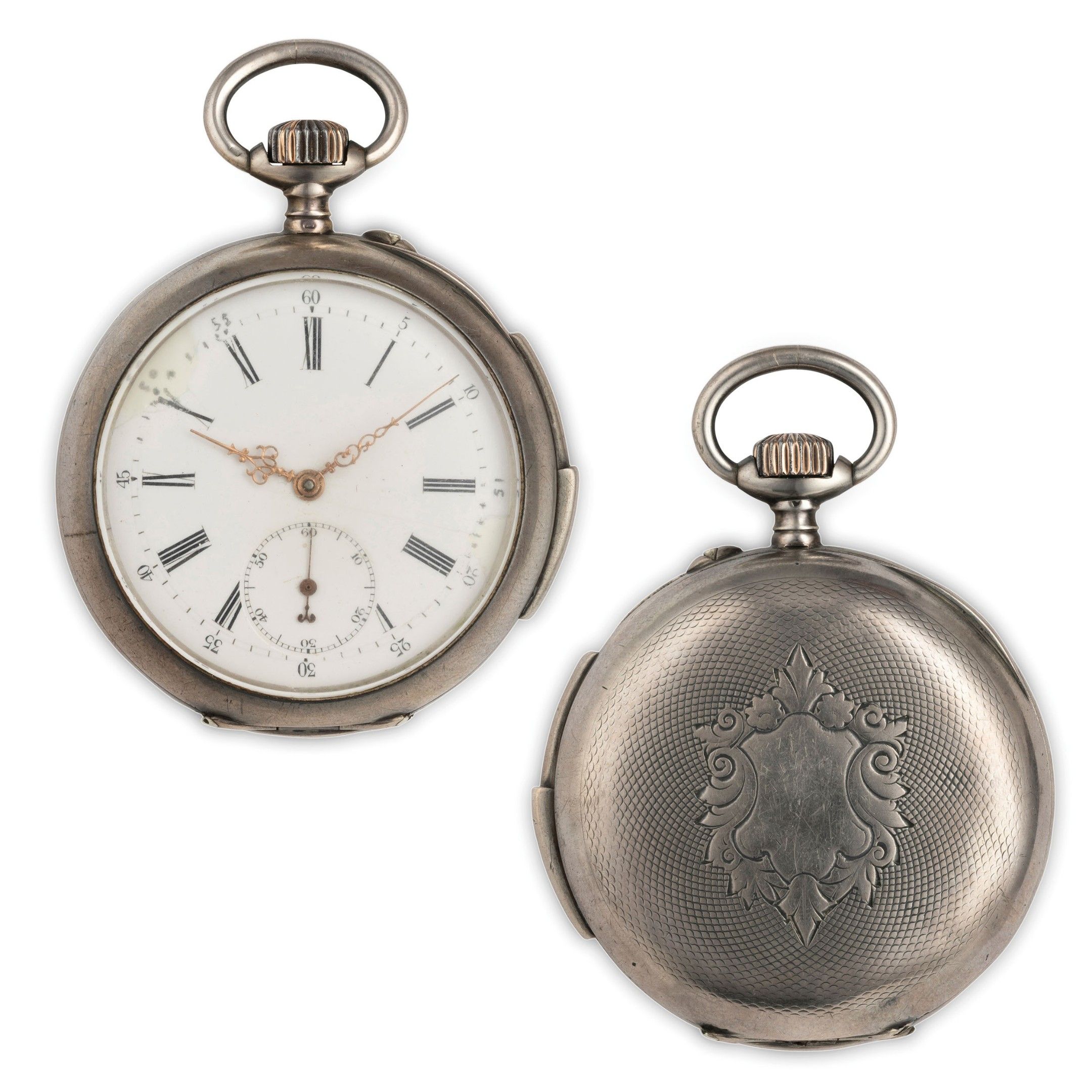 boîtier en argent, diamètre 55 mm, fond décoré de motifs guillochés, centré par une lime, cadran en émail blanc avec chiffres romains (réparation à 10 heures), aiguilles fantaisie, petite seconde à six heures, mouvement en vermeil, Le Coultre, marteaux superposés, montre en cours de marche