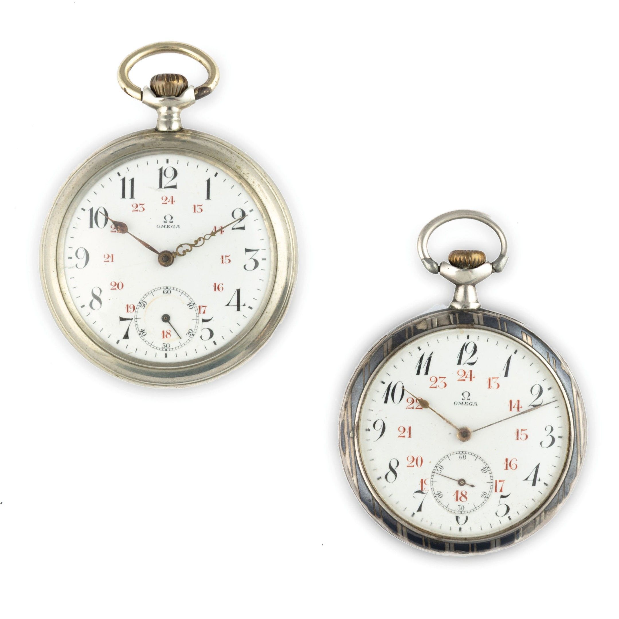 OMEGA, LOT DE DEUX MONTRES DE POCHE À CADRAN OUVERT EN MÉTAL ET EN NIELLE, SUISSE 1915