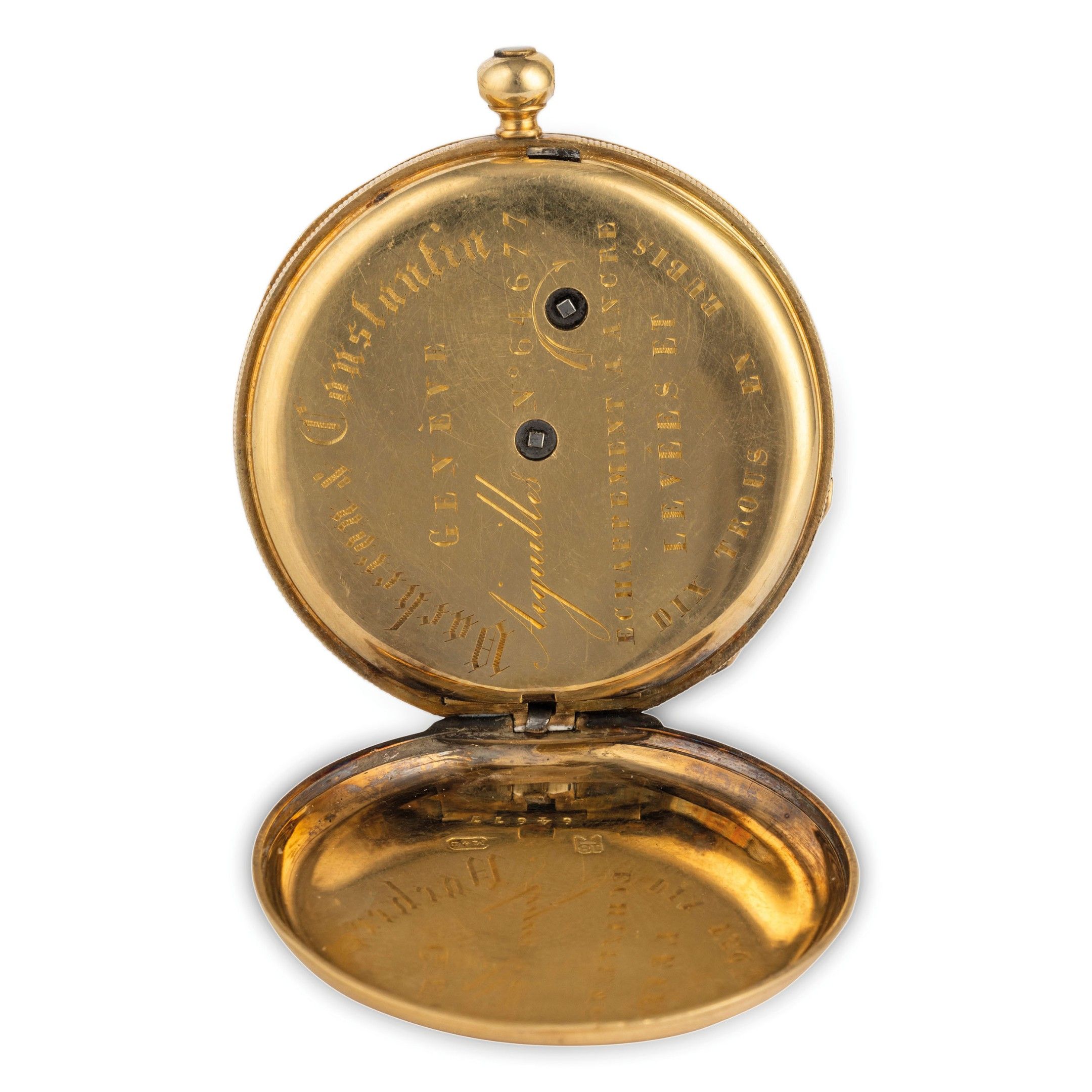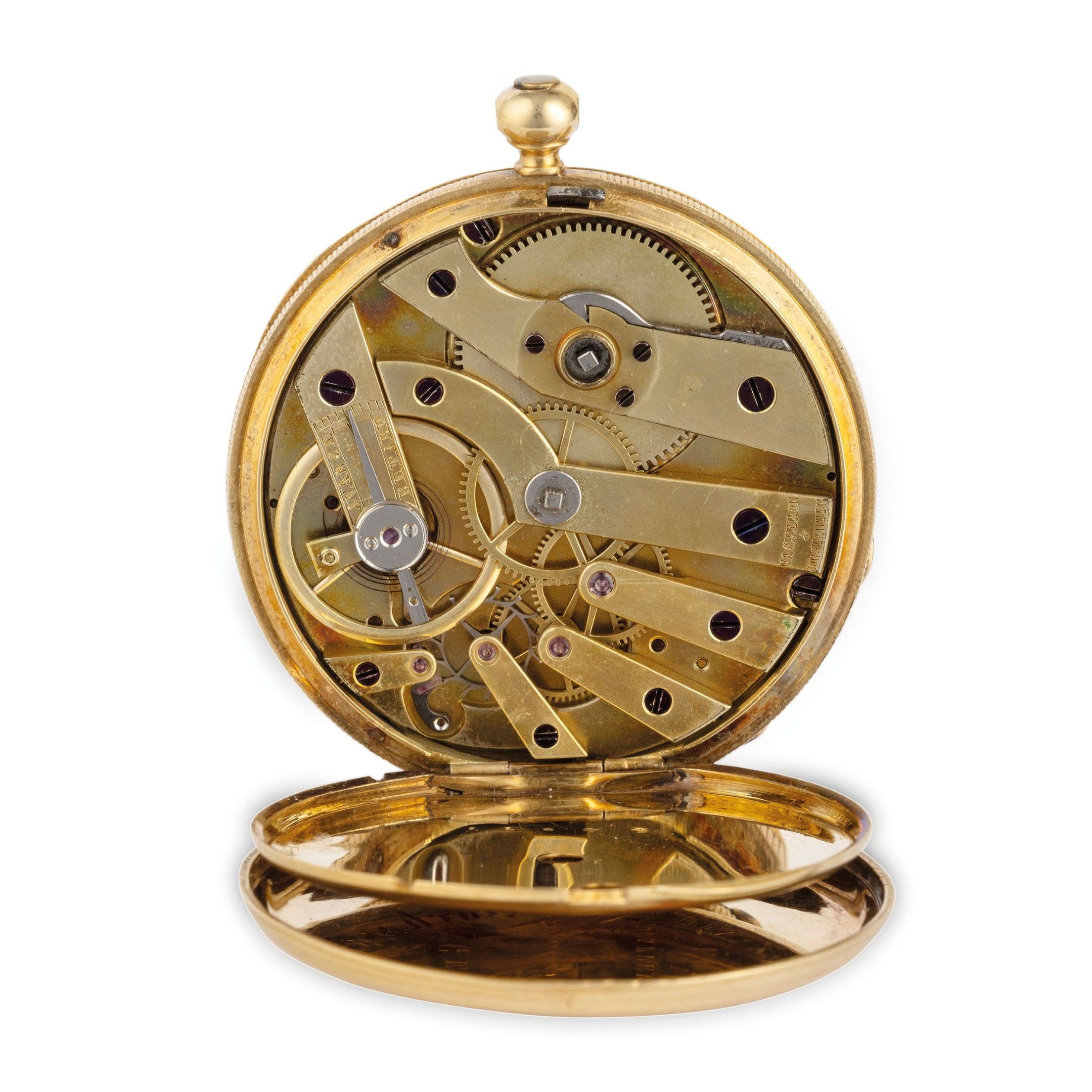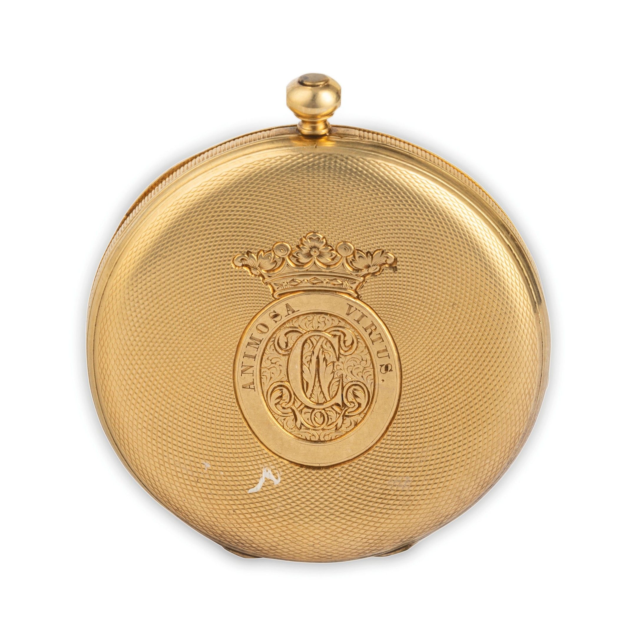 Boîtier en or jaune de 35 mm de diamètre, poinçon K18, fond décoré de motifs guillochés, centré par un cartouche portant la devise Animosa Vurtus et le monogramme, cadran en émail blanc avec chiffres romains, signé, aiguilles bâton, cache-poussière signé, mouvement avec échappement à cylindre, signé. Pendentif manquant. Montre actuellement en état de marche. Poids 32,3 g