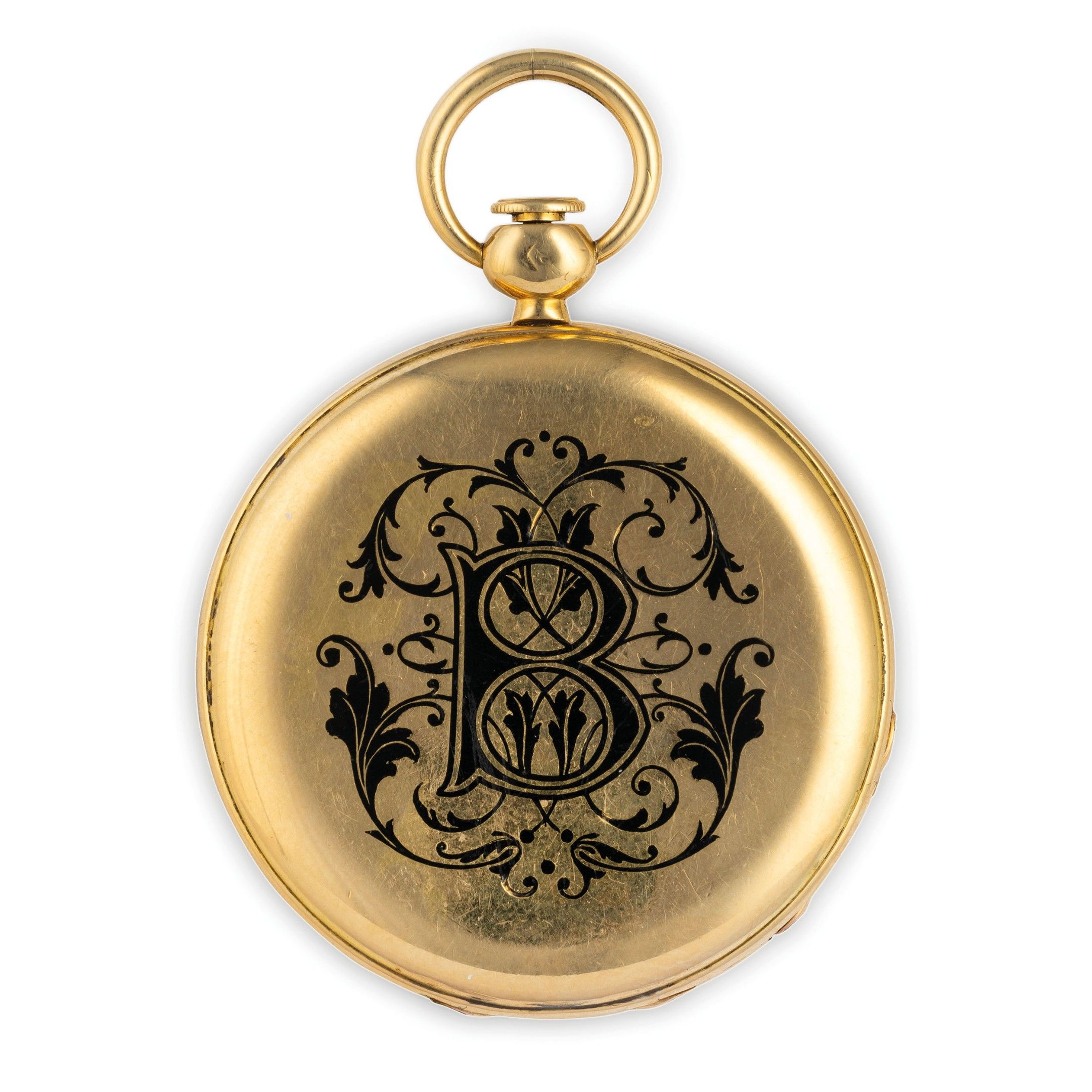 Boîtier en or jaune de 38 mm de diamètre, cadran en or, aiguilles lépines, fond avec monogramme B, émaillé en noir, cache-poussière signé, mouvement à répétition des heures et des quarts sur deux gongs, actionné par un bouton caché dans le pendentif (à tourner et à relever. Montre actuellement en état de marche, glace fissurée. Poids 39,2 g.