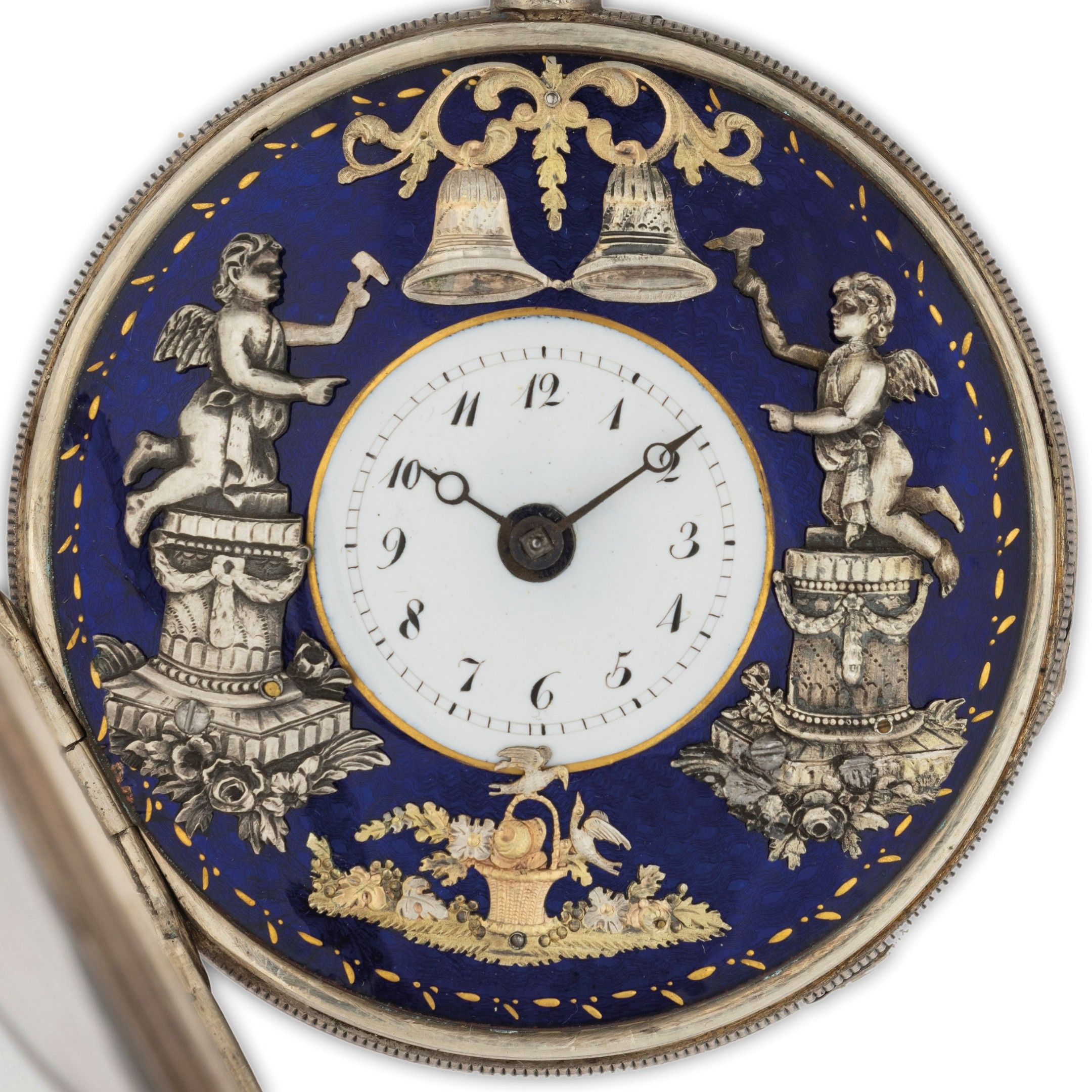 boîtier en argent de 57 mm de diamètre, carrure décorée de motifs au crayon, grand cadran en émail bleu avec de riches automates en forme de petits putti martelant une paire de cloches, cadran en émail blanc avec chiffres romains, aiguilles de type Breguet, fond lisse, mouvement avec échappement à verge, sonnerie des heures et des quarts avec automates Jacquemart sur gong. Montre actuellement en état de marche, clé de remontage absente.