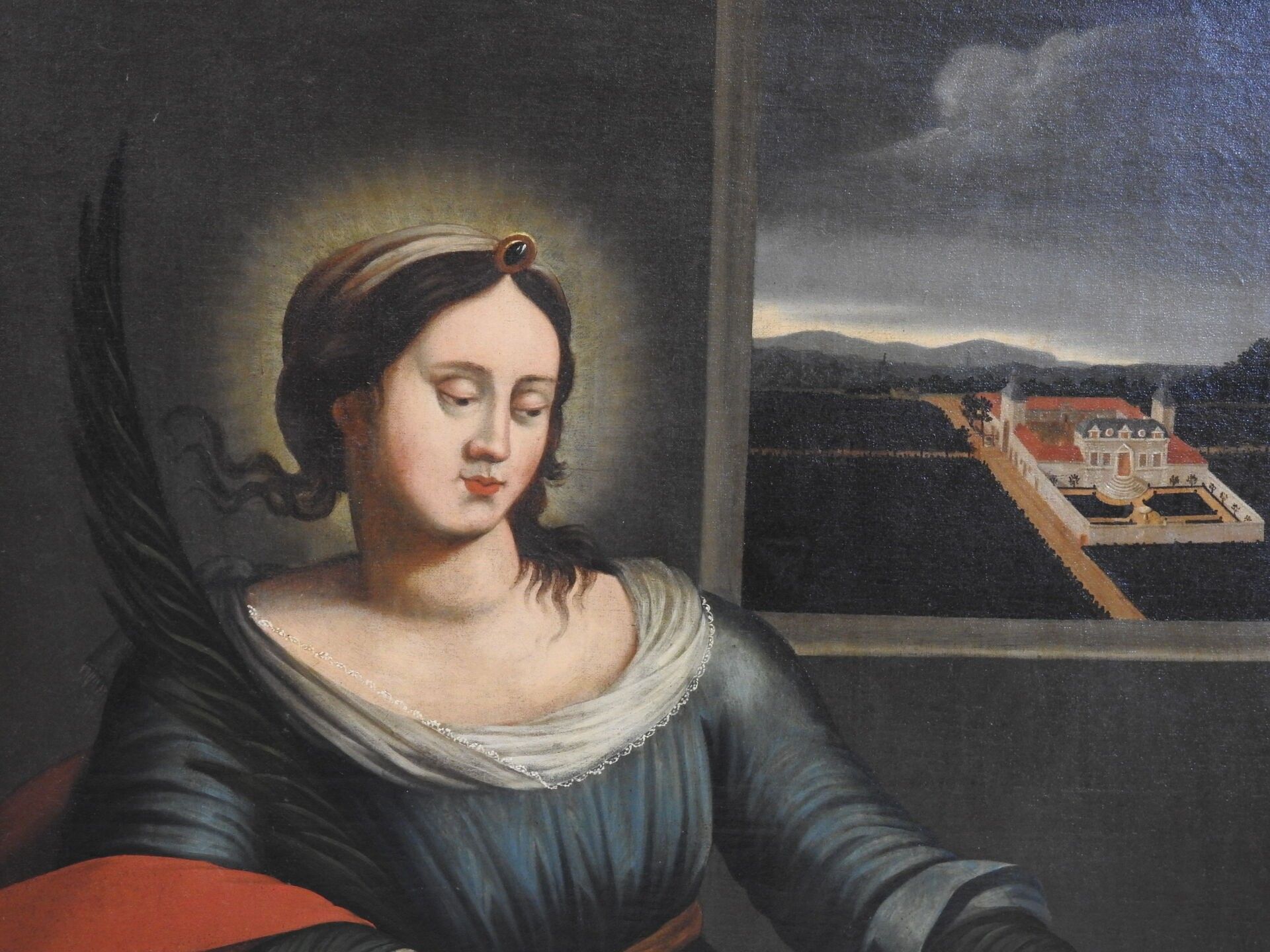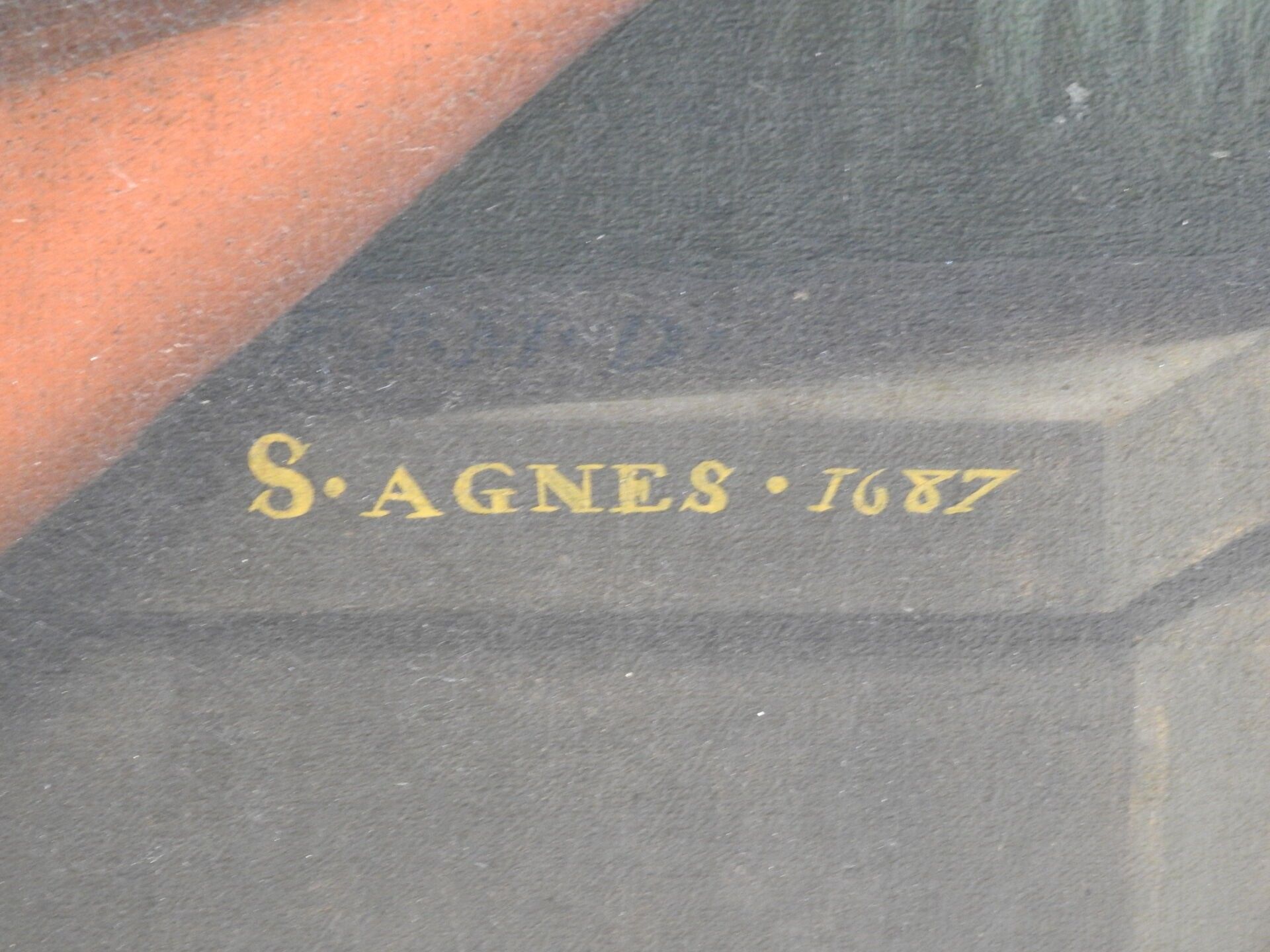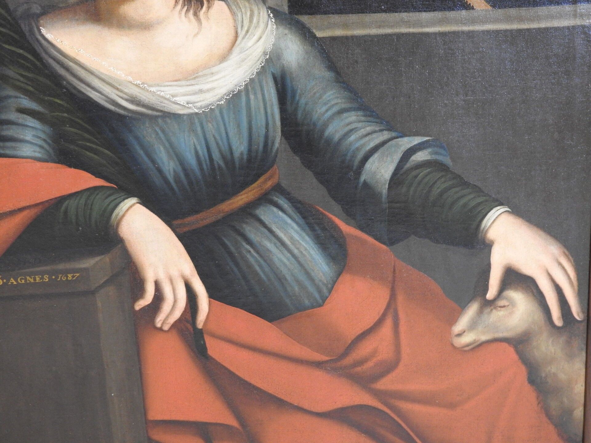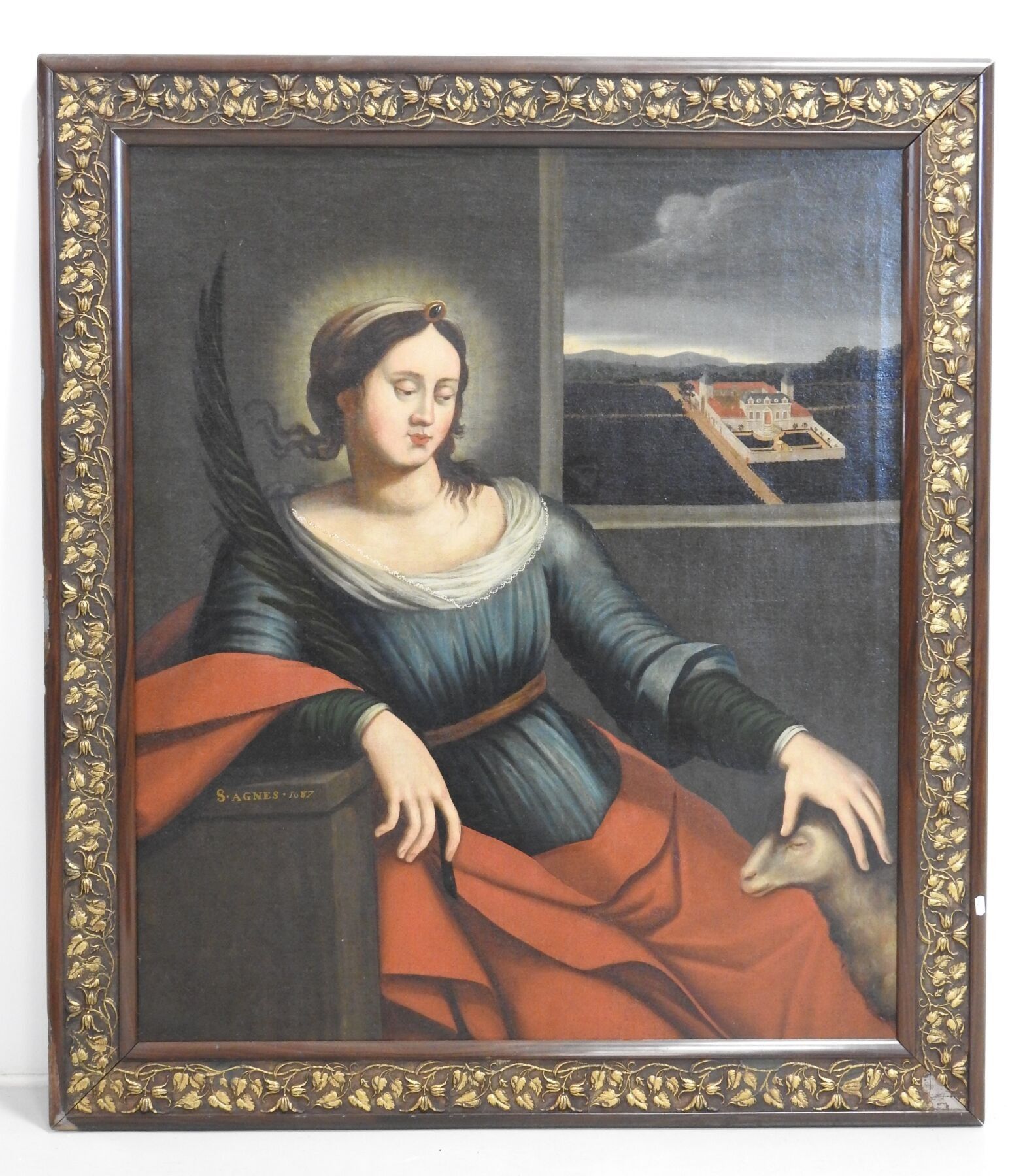Ecole FRANCAISE de la fin du XVIIème siècle : Sainte Agnès sur fond de paysage. Importante toile. Daté 1687. 97 x 83 cm (restaurations)