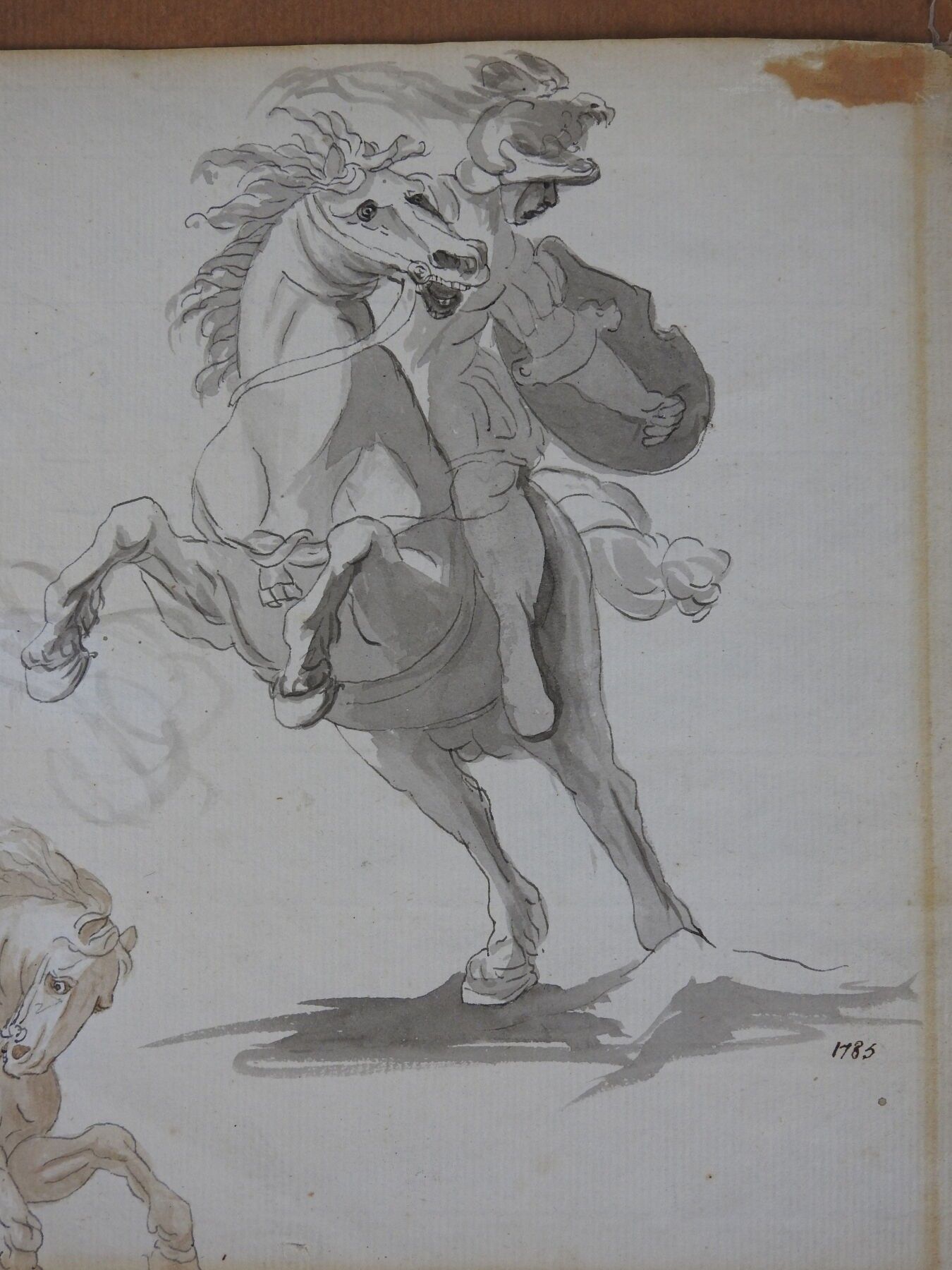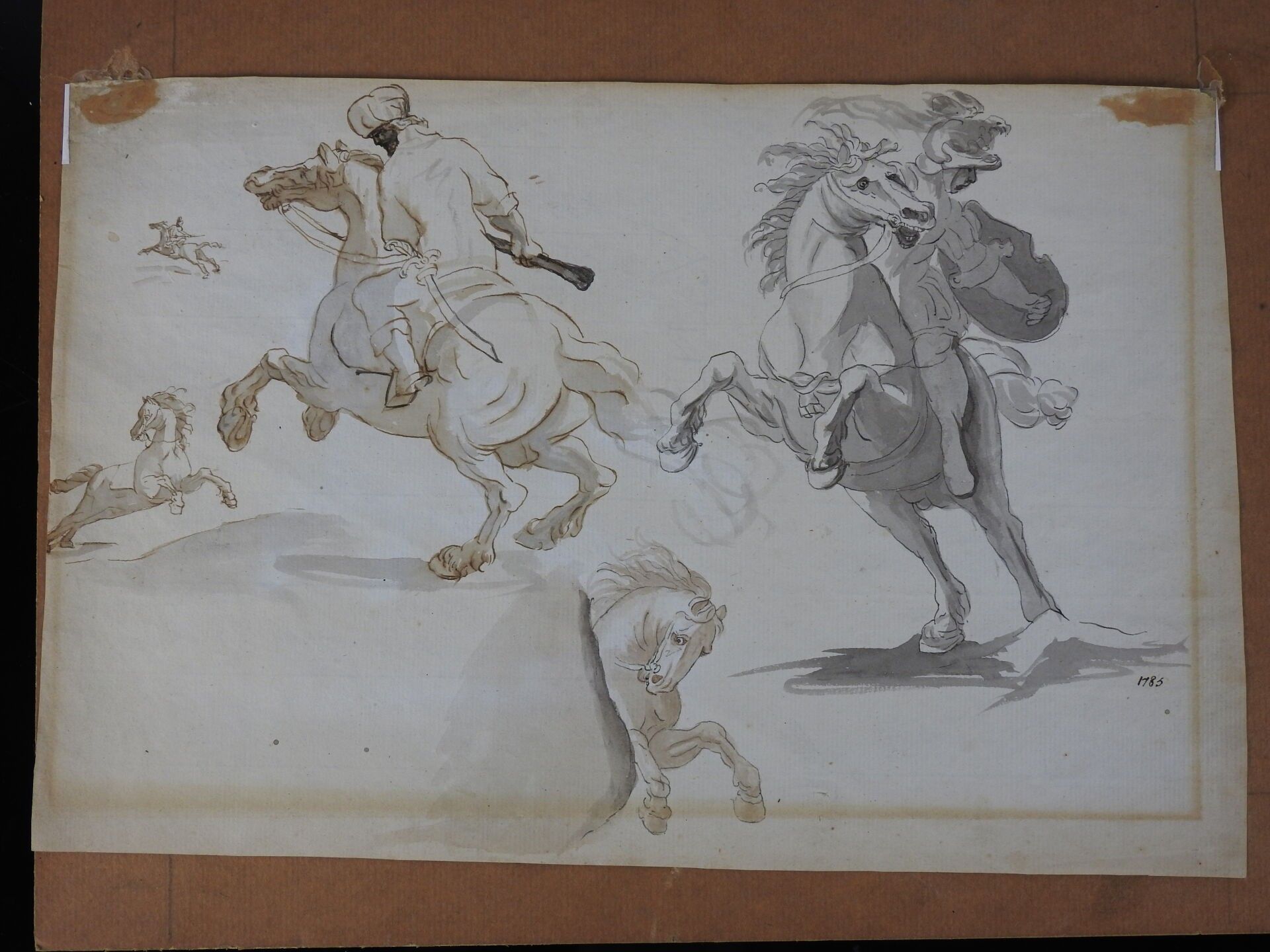 École FRANCAISE du XVIIIème siècle : Étude de cavaliers et chevaux. Lavis d'encre et sanguine. Double face. Daté 1785 à l'arrière. 23 x 35.5 cm.