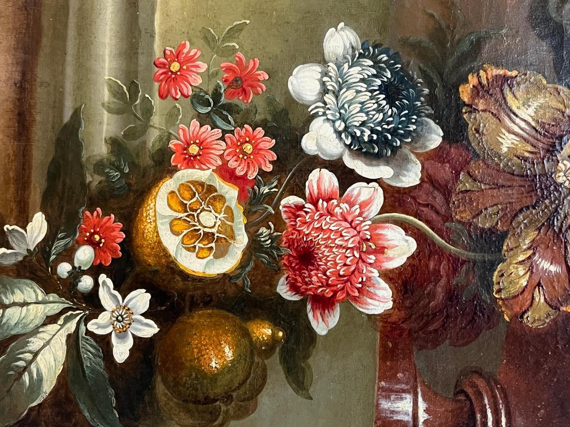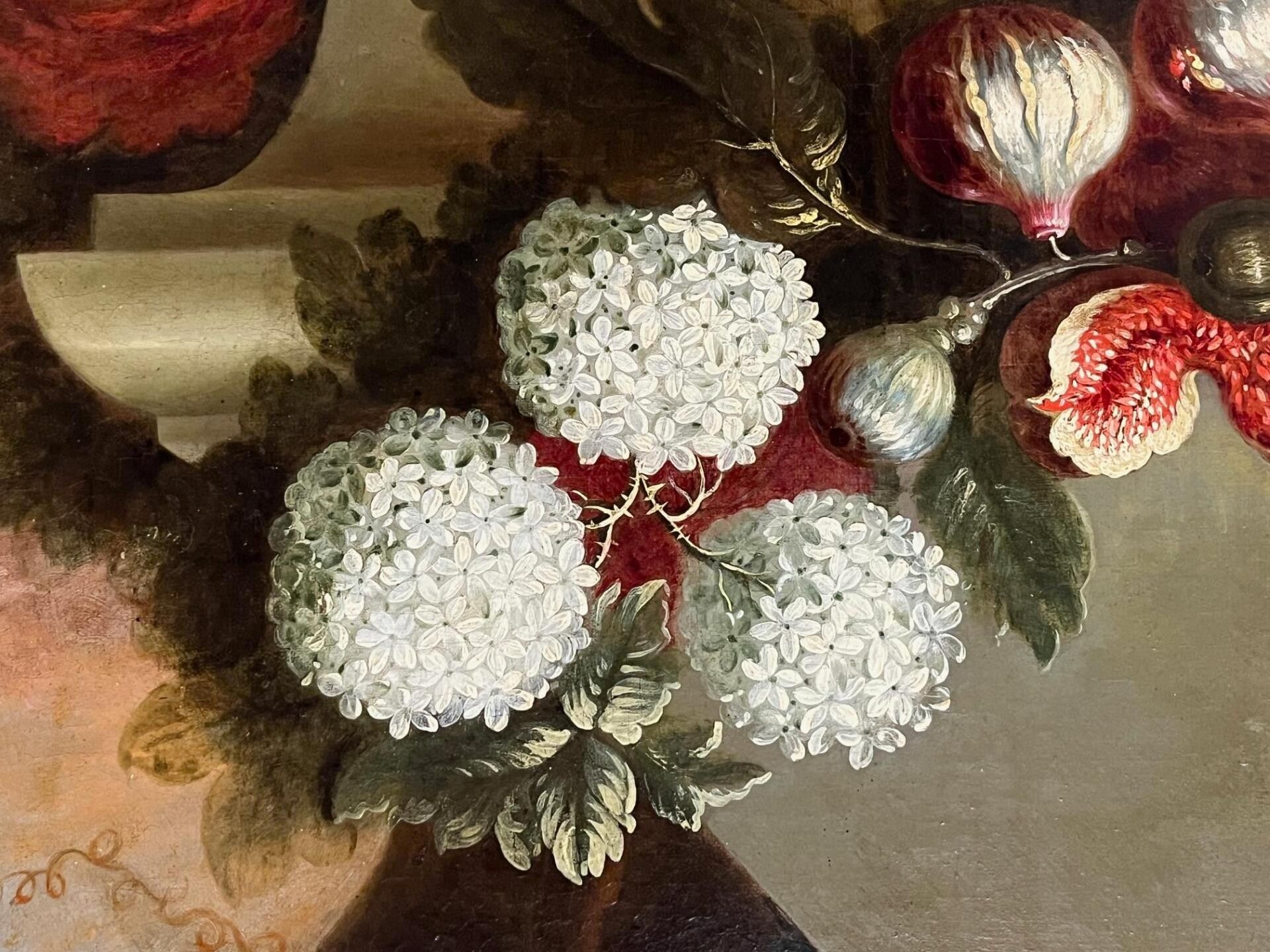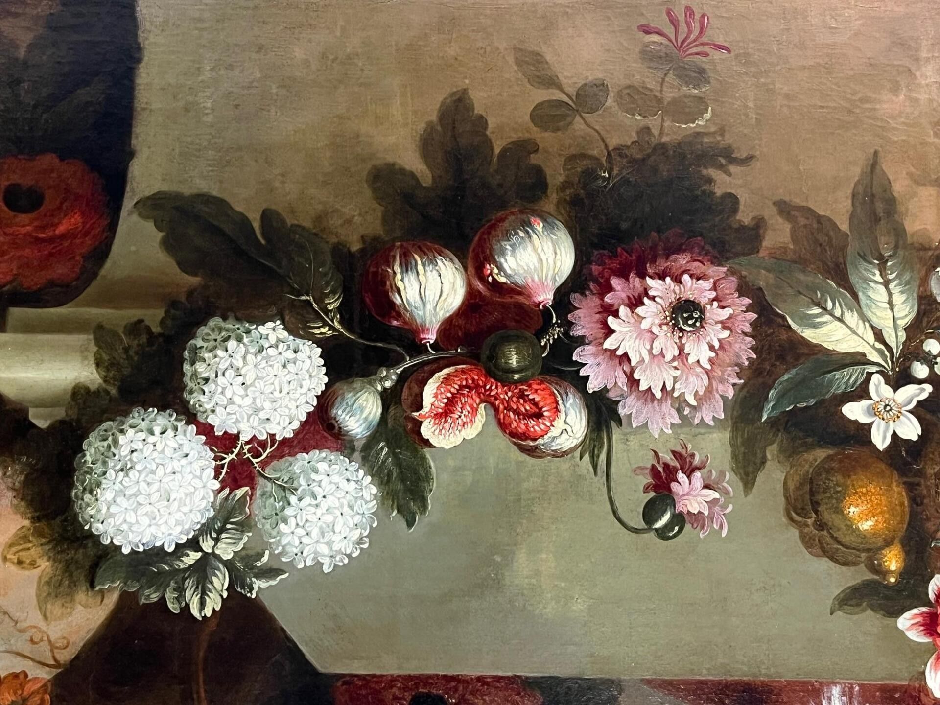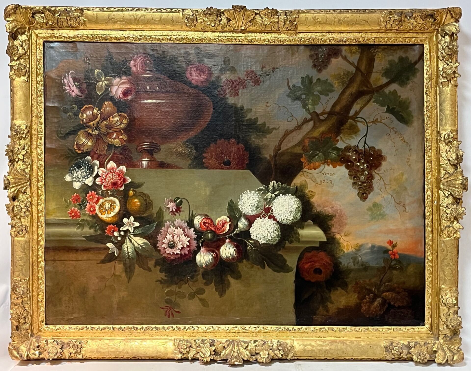 Guirlande de fleurs et de fruits sur un entablement avec un vase en porphyre dans un paysage.