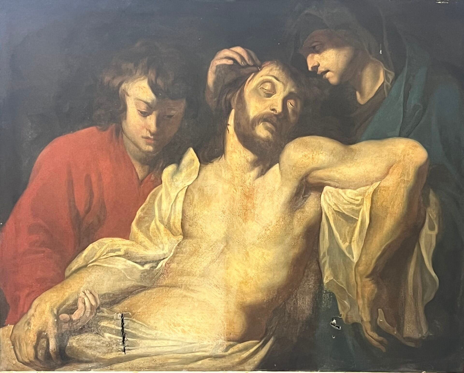 École FRANCAISE du XIXème siècle d'après Pierre-Paul RUBENS : Lamentation du Christ par la Vierge et Saint Jean. Importante huile sur toile. 96 x 122 cm. Accidents. Provenance : château de Sologne.