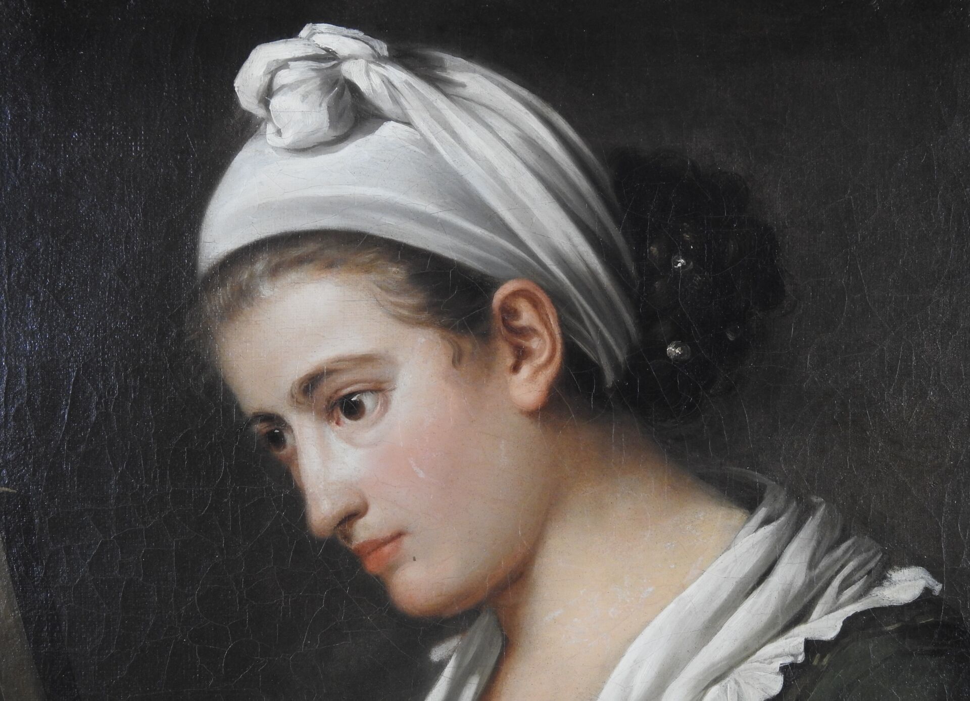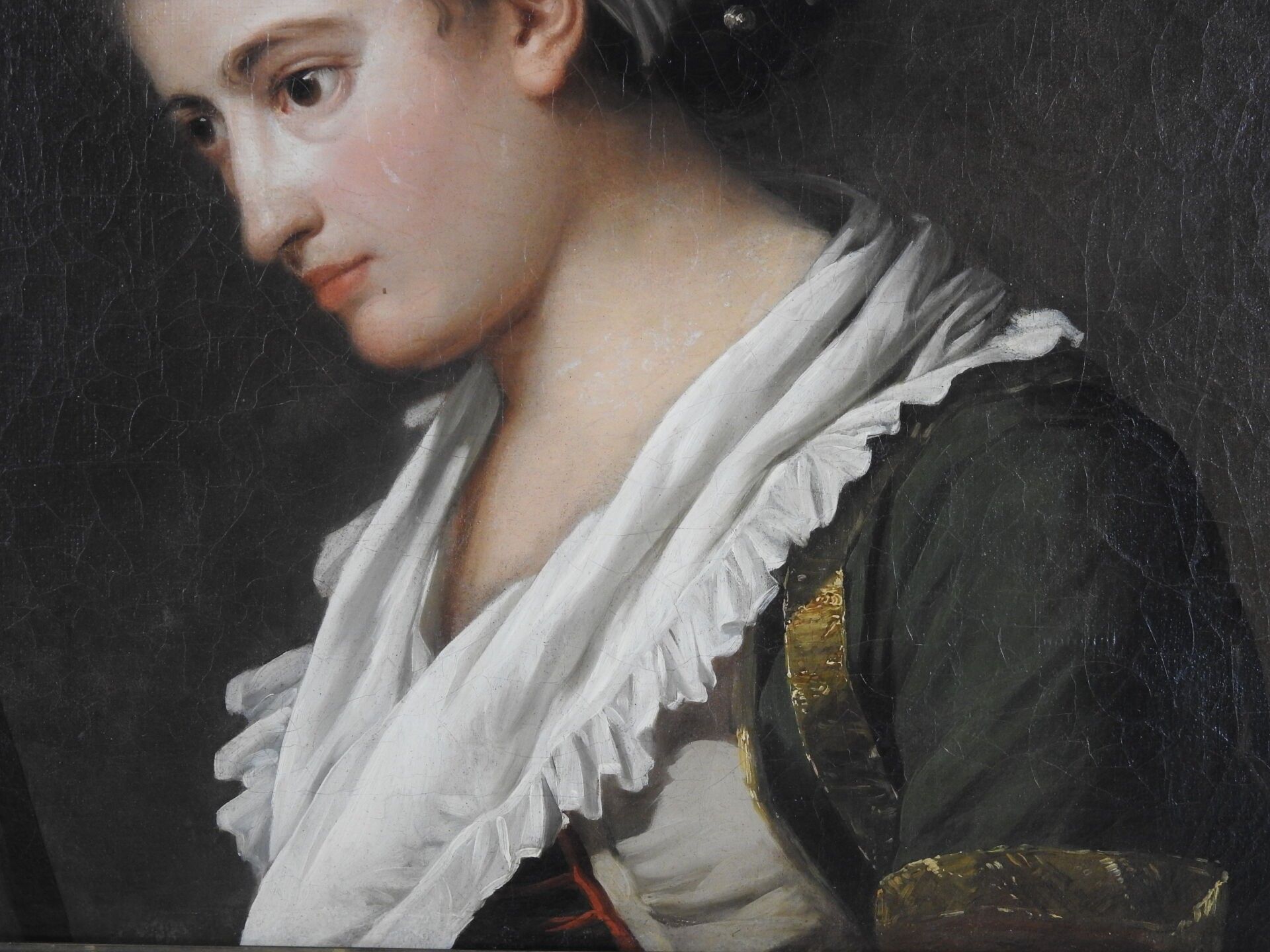 École FRANCAISE vers 1770 Femme regardant un tableau Toile, probablement réduite Hauteur : 52 cm Largeur : 61,5 cm Provenance selon étiquette: vente aux enchères Me Chapelle, Versailles, 1981. Expert : cabinet Turquin, Stéphane Pinta