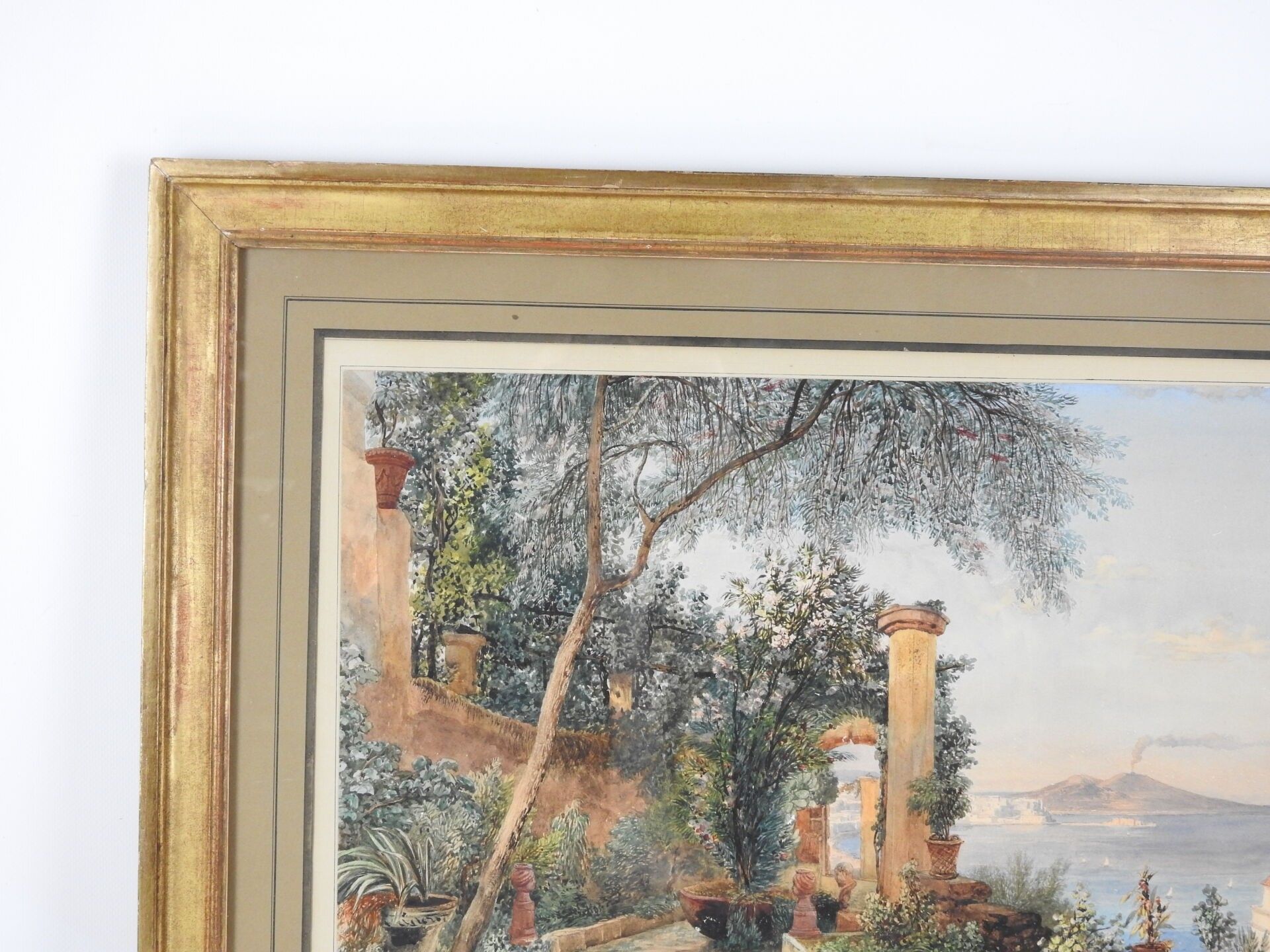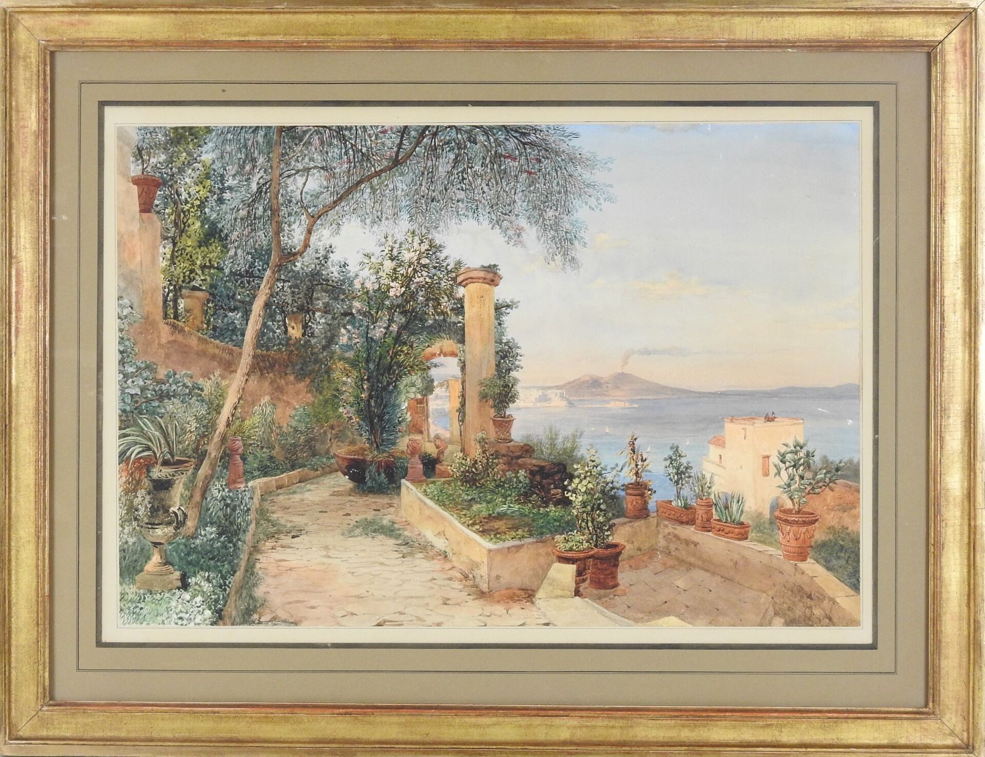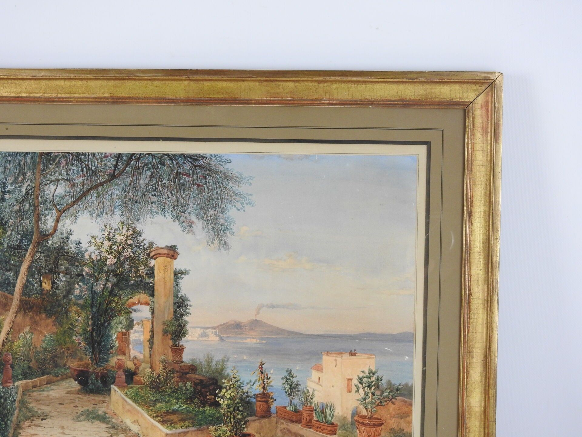 Paul Albert GIRARD (1839-1920) : Terrasse dans la baie de Naples avec volcan en irruption (Etna, Vésuve?). Aquarelle. Signé en bas à droite. Etiquette Ch. Soccard 50 x 34 cm Dim (cadre): 67 x 52 cm.