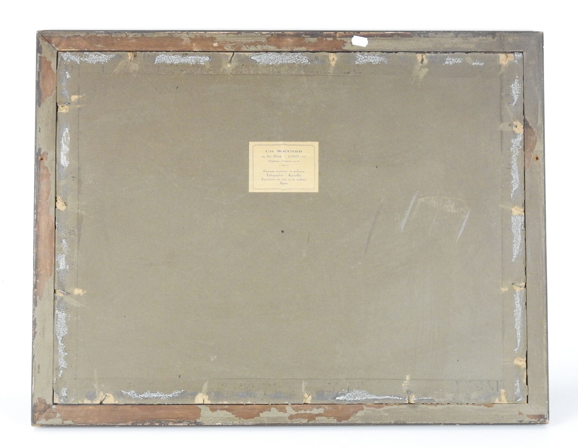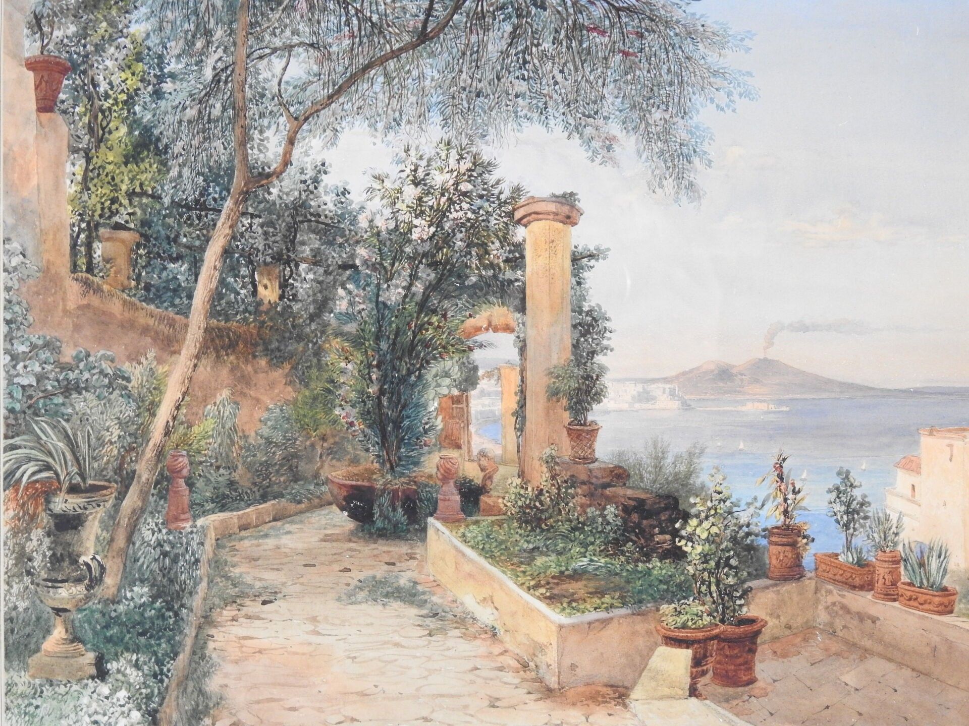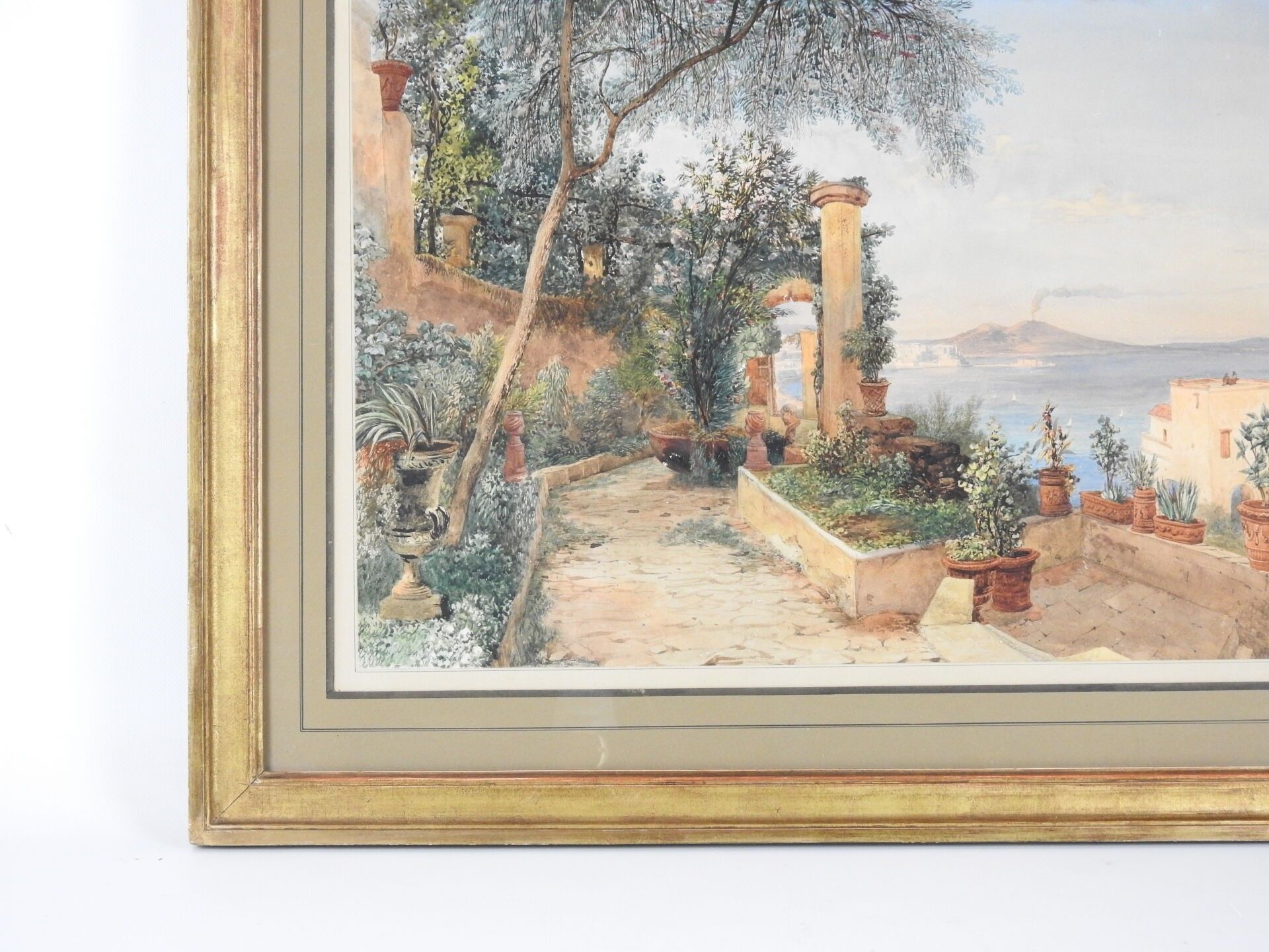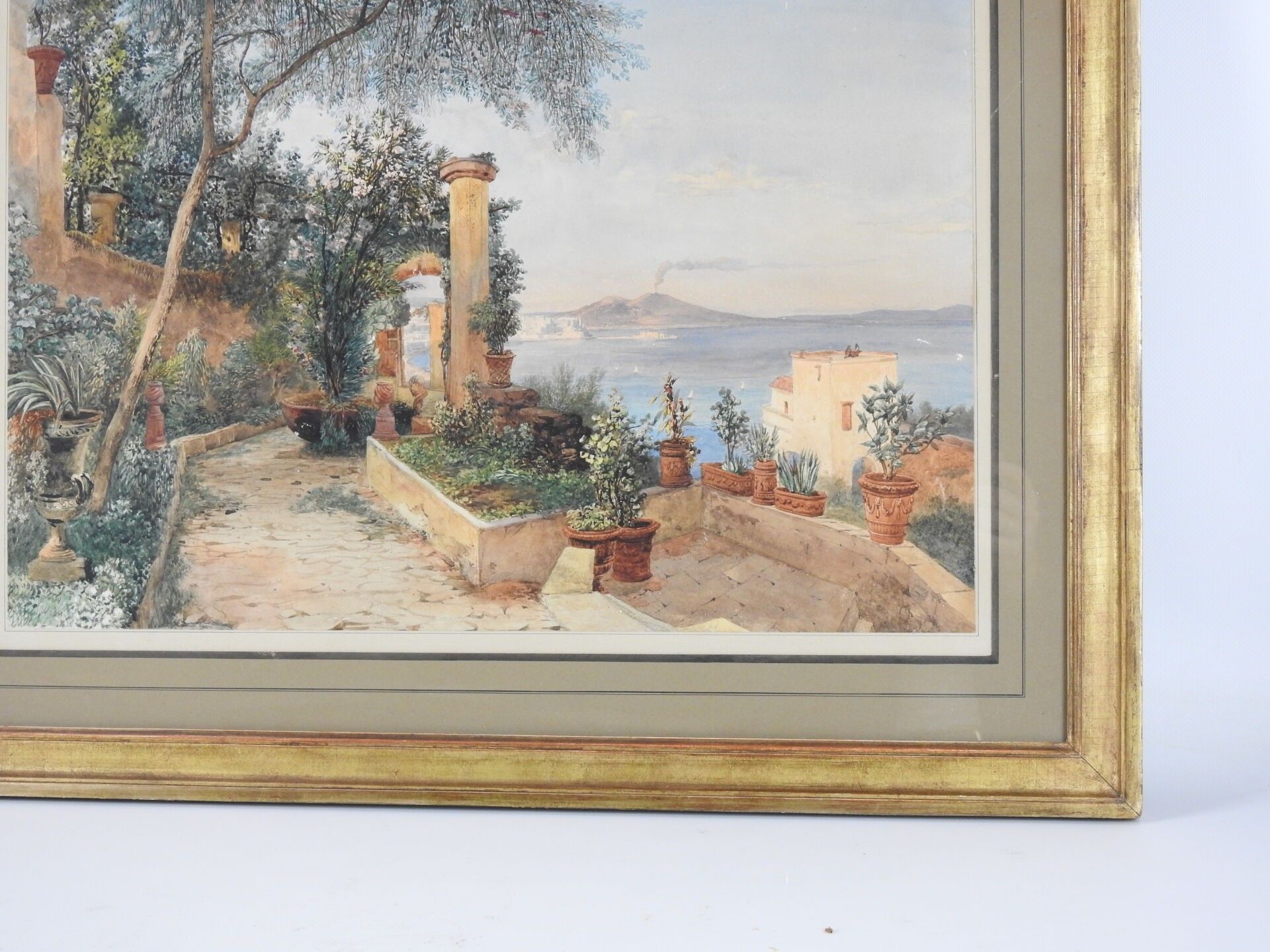 Paul Albert GIRARD (1839-1920) : Terrasse dans la baie de Naples avec volcan en irruption (Etna, Vésuve?). Aquarelle. Signé en bas à droite. Etiquette Ch. Soccard 50 x 34 cm Dim (cadre): 67 x 52 cm.