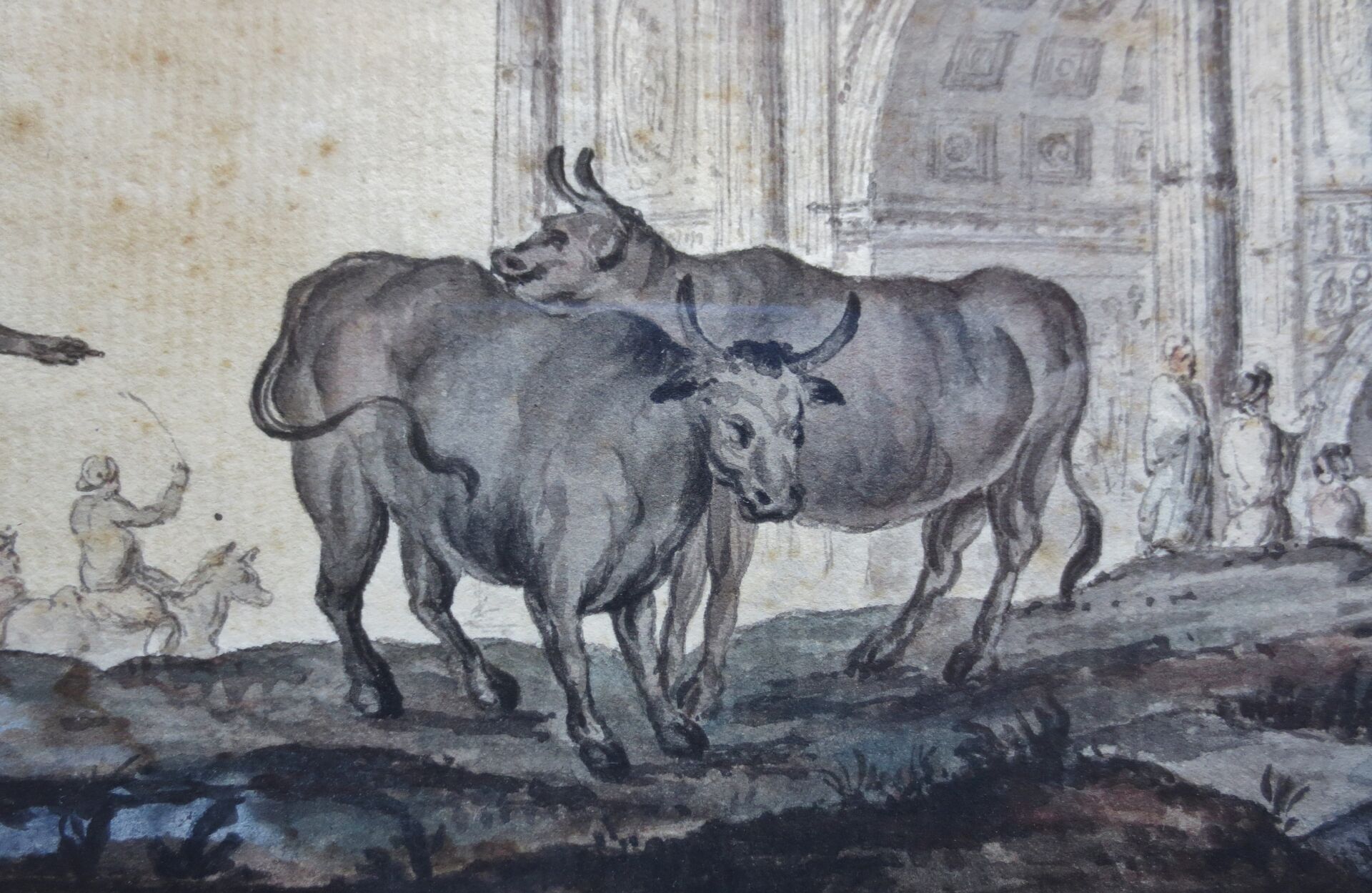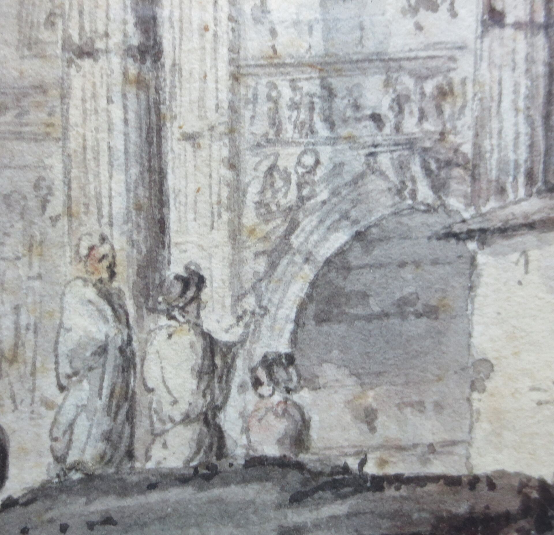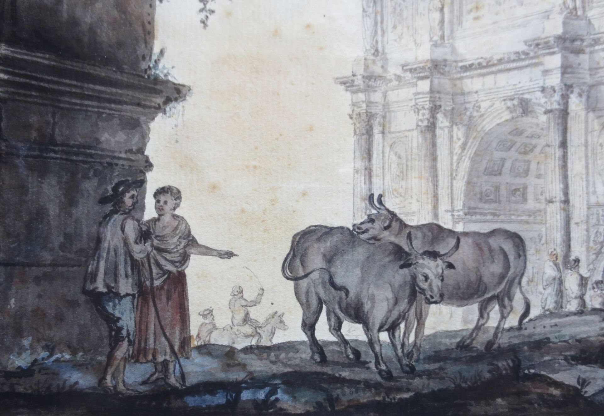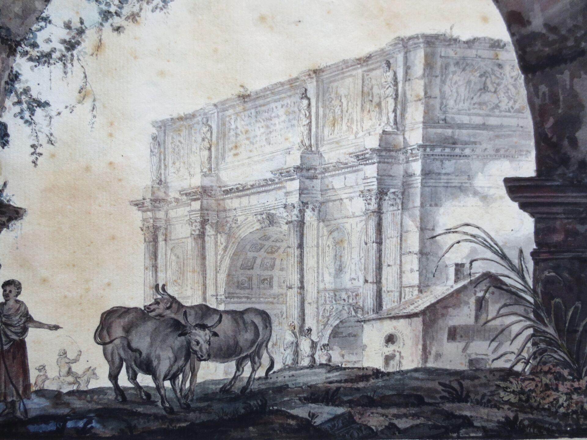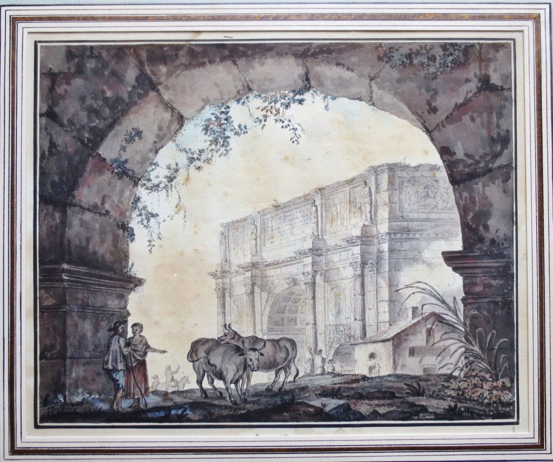 Suiveur d'Hubert ROBERT (1733-1808) : Arc de Constantin. Aquarelle. 22 x 28 cm. Traces d'humidité. Cadre en bois doré: 45,5 x 49,5 cm