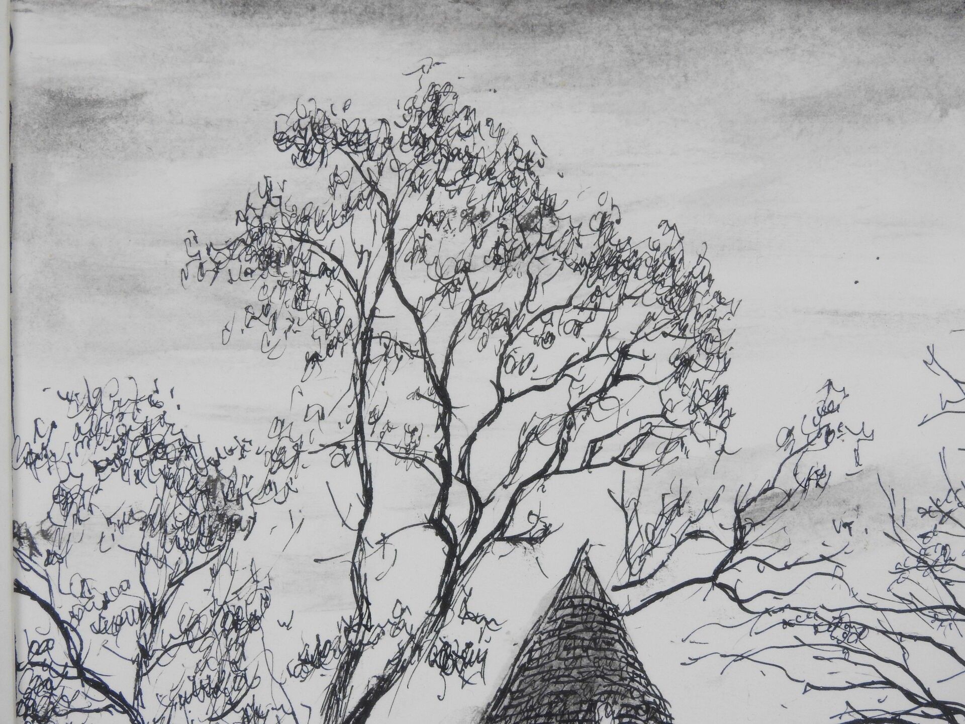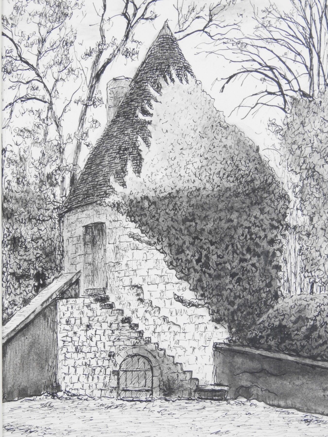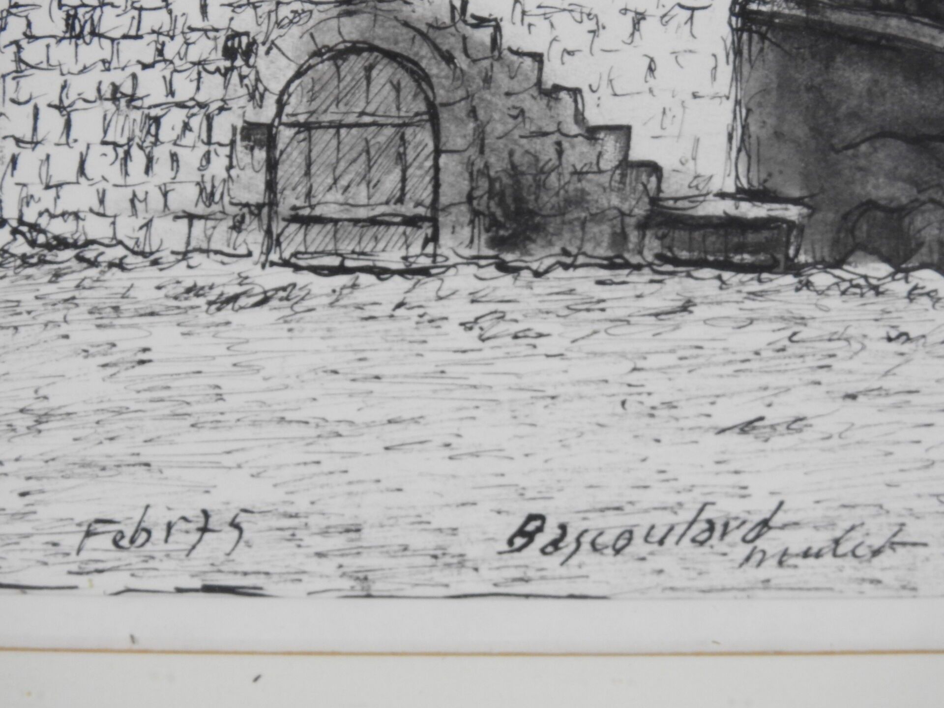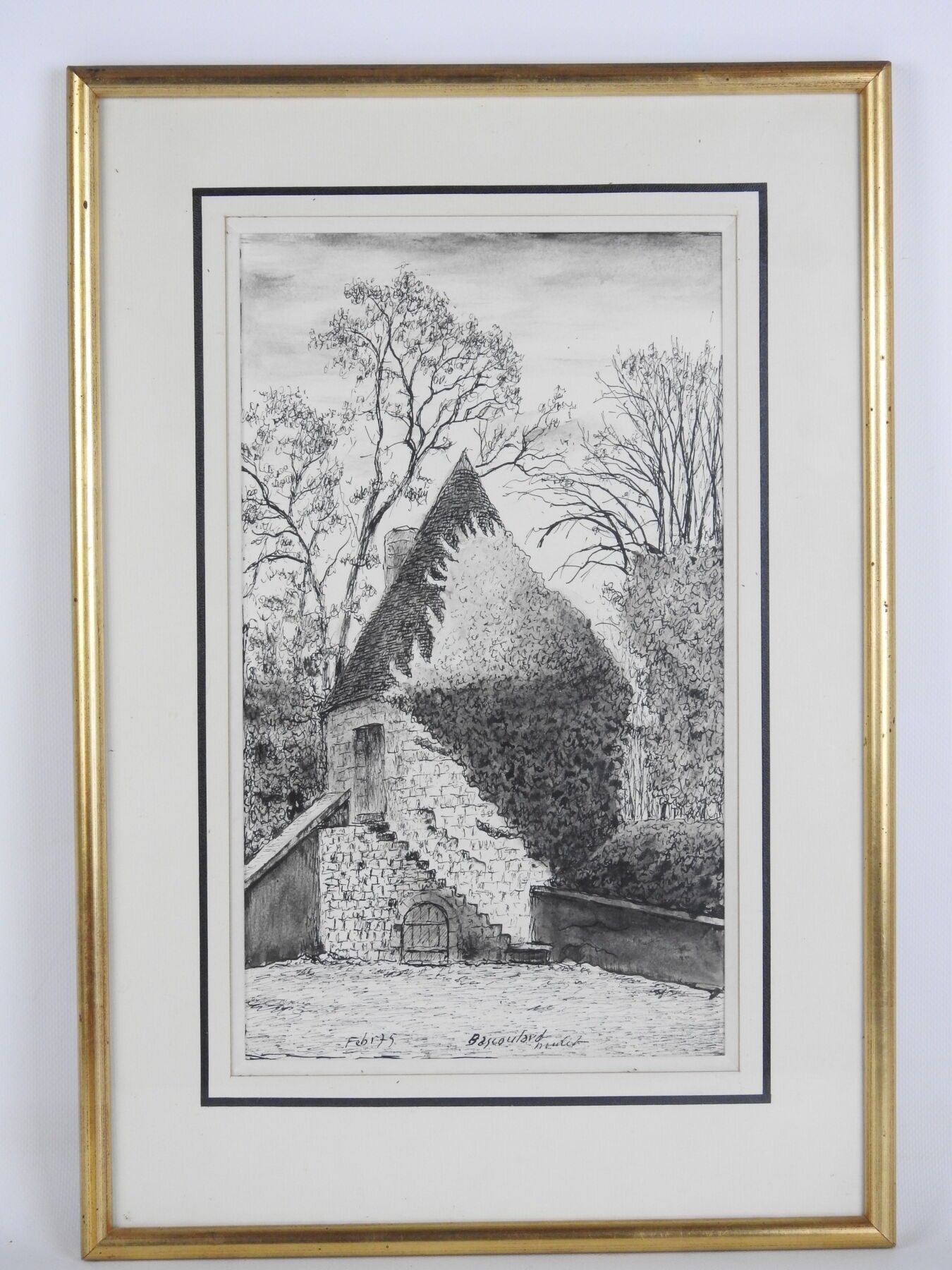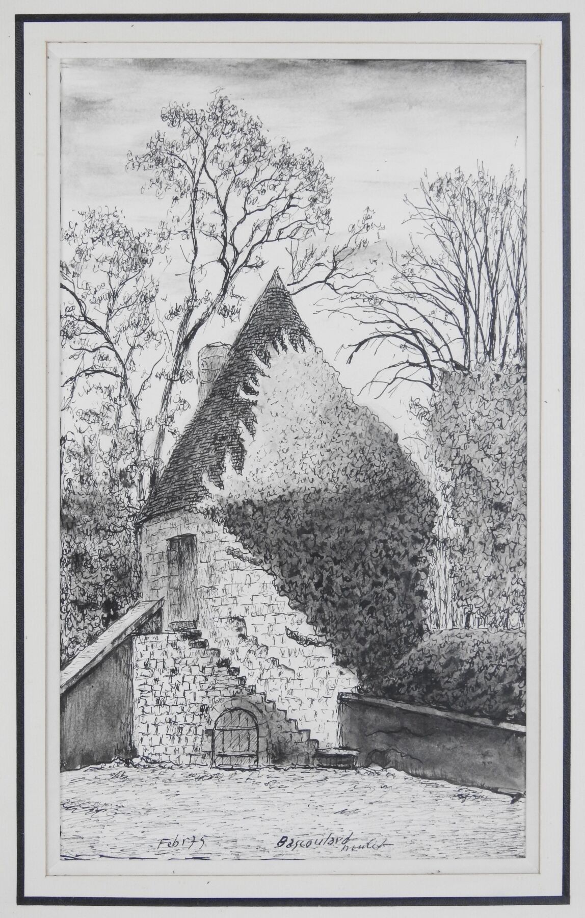 Marcel BASCOULARD (1913-1978) : Ancienne tour à poudre dite "La Poudrière", boulevard Lamarck à Bourges. Encre. Signé. 34 x 20 cm à vue. Dim (cadre) : 49 x 34 cm Bibliographie : Association souvenir Marcel Bascoulard : Marcel Bascoulard, mémoires. La bouinotte, 2009, reproduit page 65 (variante à l'aquarelle).