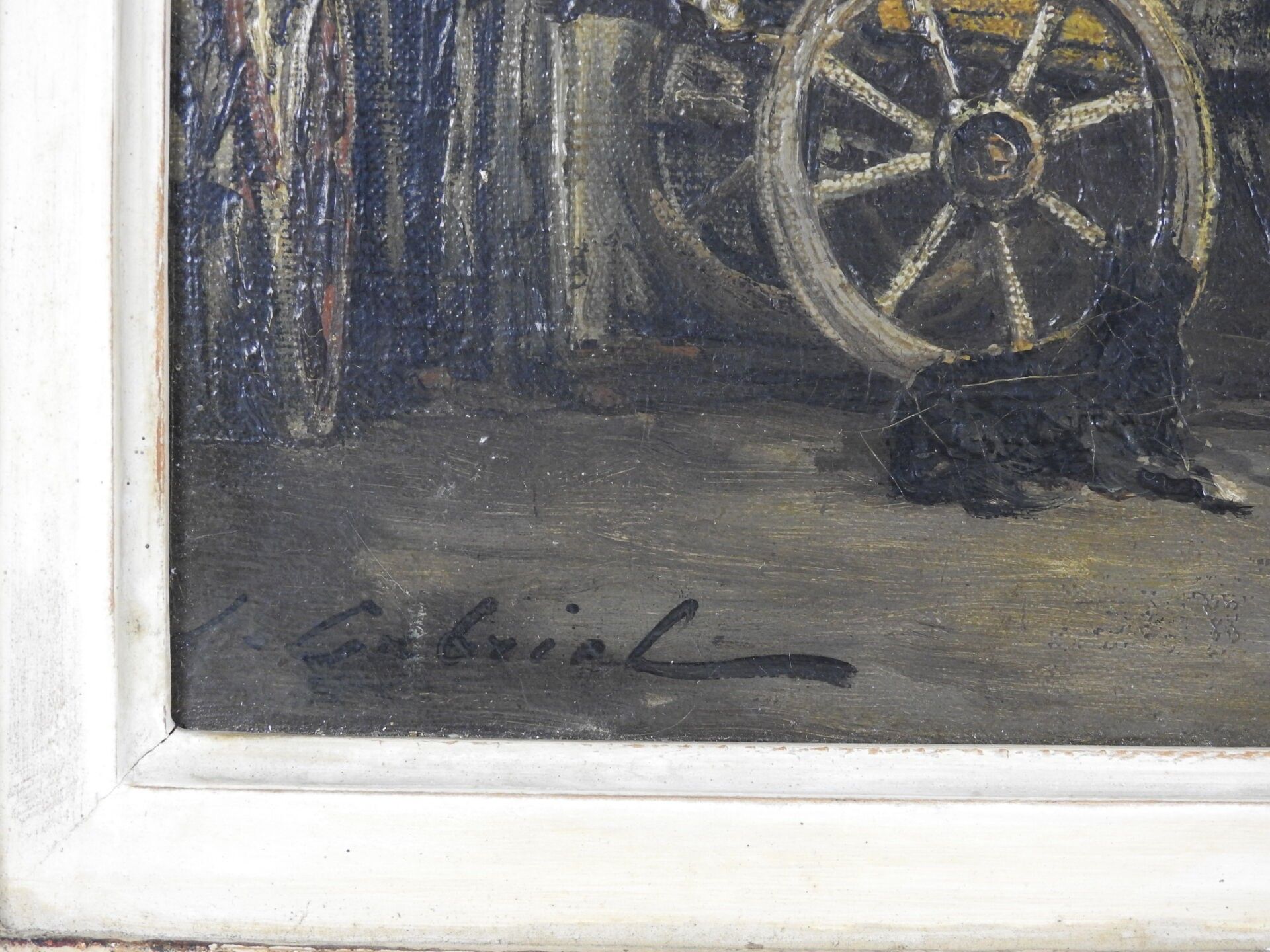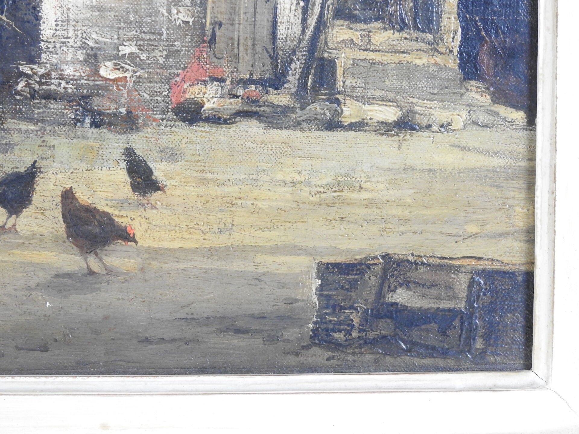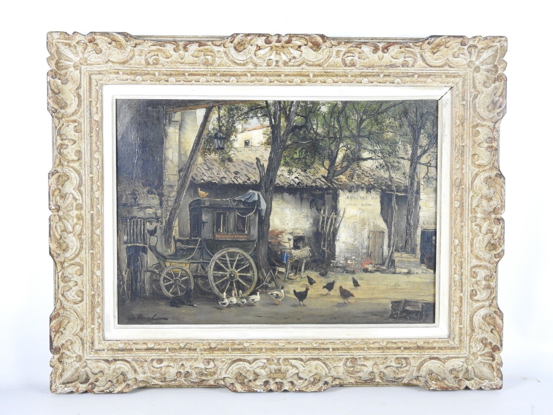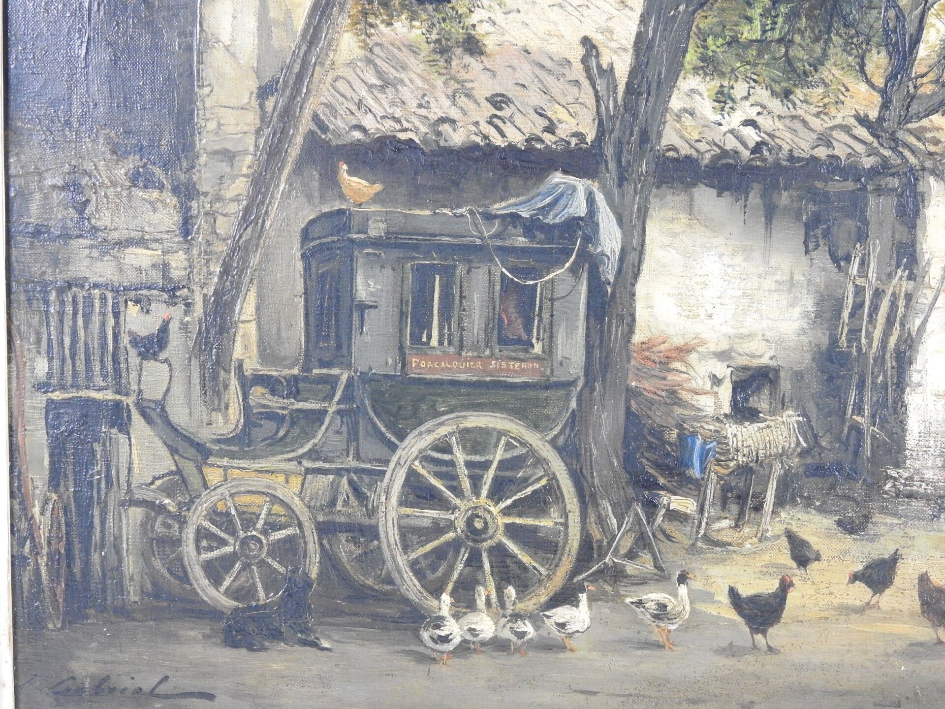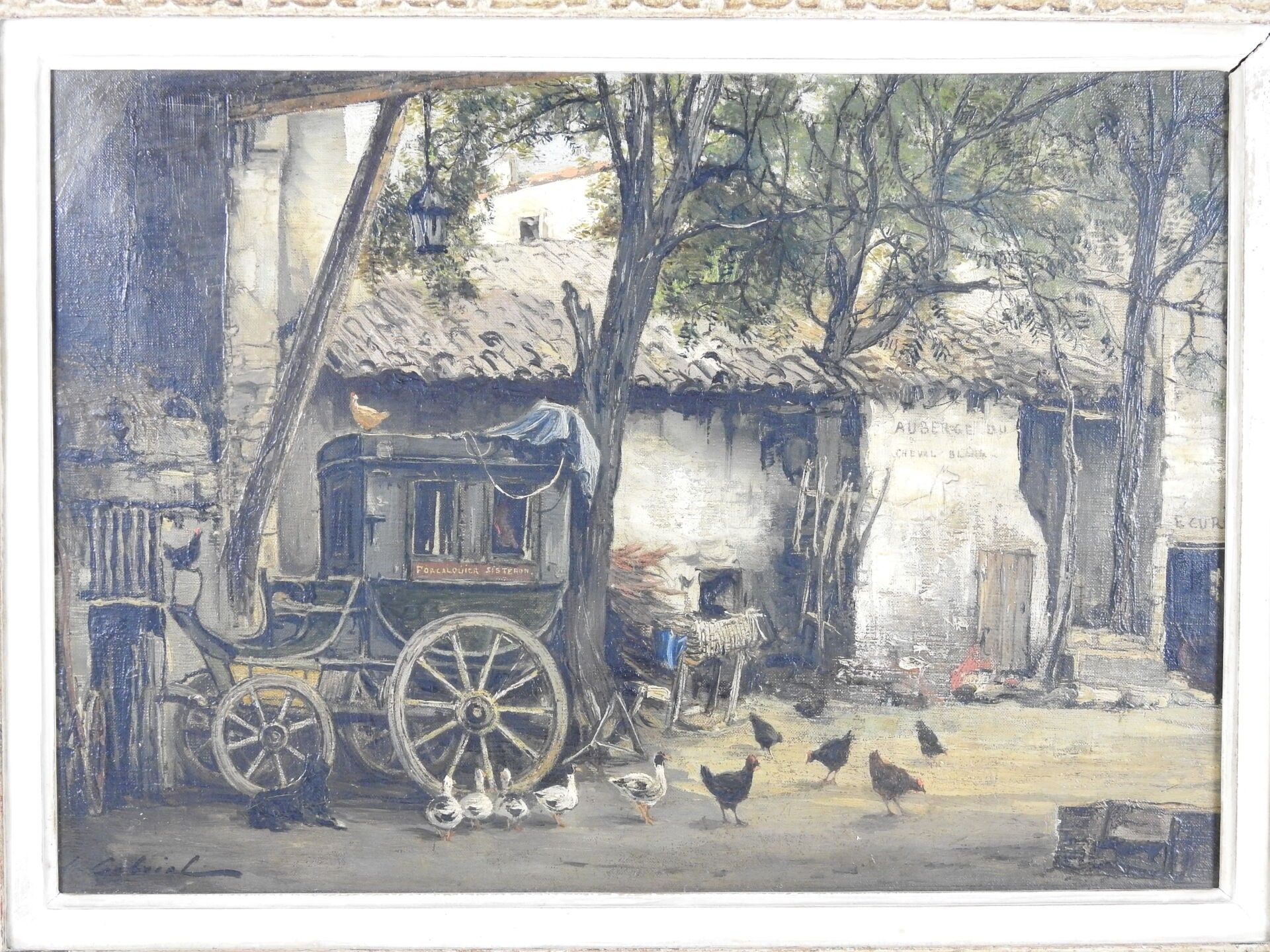 Jean Justin GABRIEL (1837 - 1923) : Cour de l'Auberge du cheval blanc à Manosque (Haute-Alpes). Huile sur toile. Signé en bas à gauche, titré au dos. 38 x 54 cm.